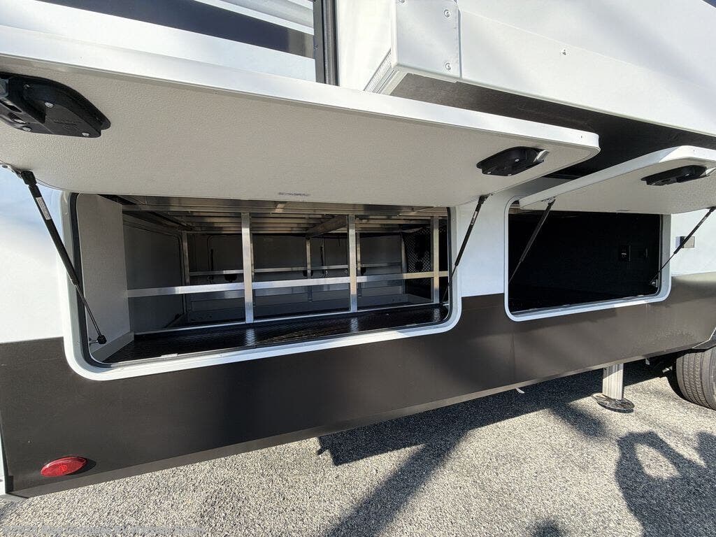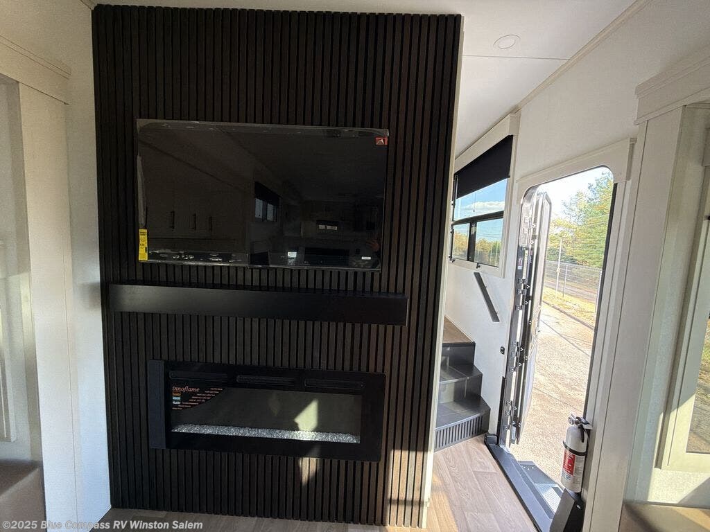 Enjoy each and every vacation, month-long trips, or even extended stays at an RV park in this spacious fifth wheel! The raised rear kitchen gives the cook plenty of room to whip up any type of meal using the stainless steel appliances including a built-in oven, an oversized pantry, and the raised bar top will provide you even more counter space on top of dining with two chairs that overlook the middle living area. Relaxing is made easy thanks to two tri-fold sofas and theatre seating while watching the big game on the LED Smart TV and enjoying the fireplace below. At night, retire to your own queen bed which slides out to provide more floor space, and you can store your clothes in the slide top dresser and front closet with washer and dryer prep.