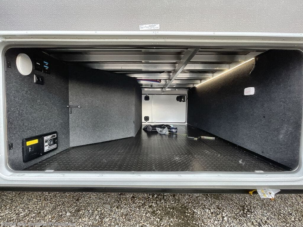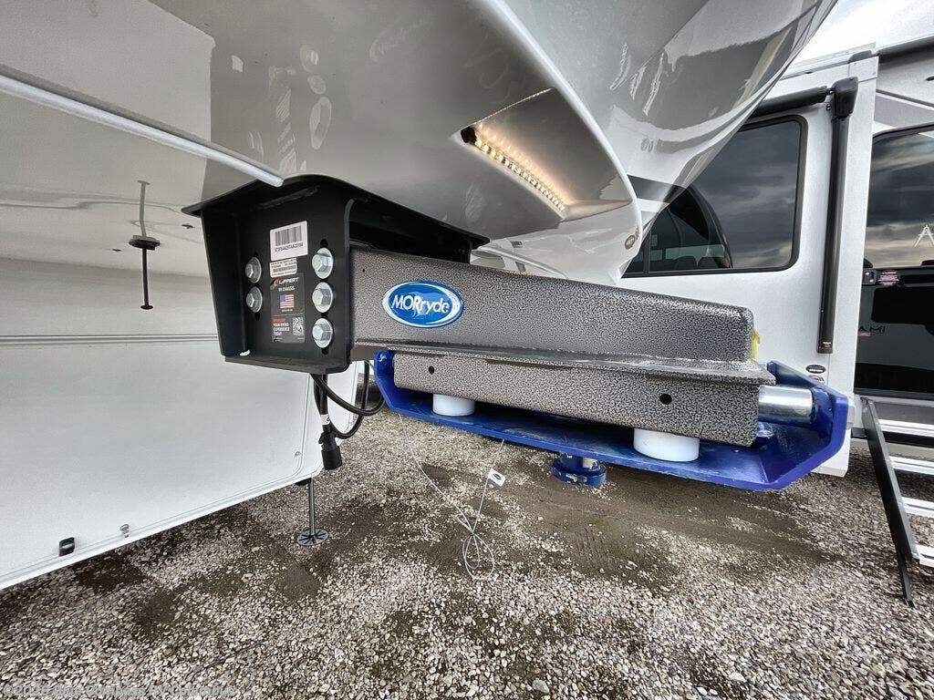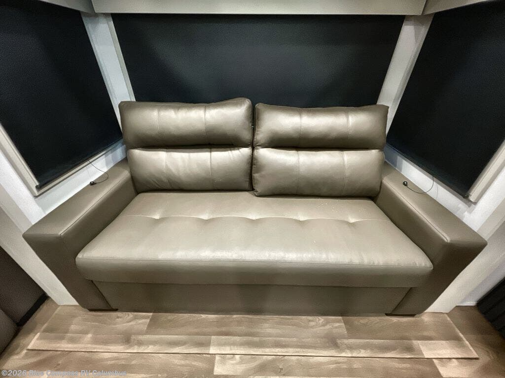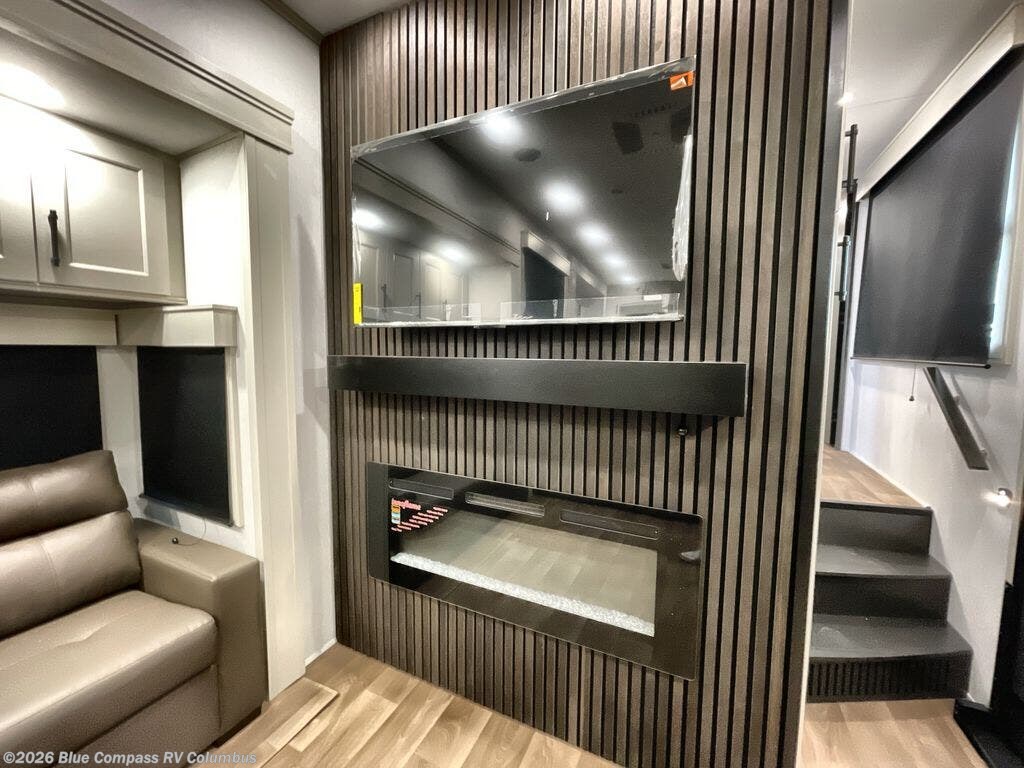 Enjoy each and every vacation, month-long trips, or even extended stays at an RV park in this spacious fifth wheel! The raised rear kitchen gives the cook plenty of room to whip up any type of meal using the stainless steel appliances including a built-in oven, an oversized pantry, and the raised bar top will provide you even more counter space on top of dining with two chairs that overlook the middle living area. Relaxing is made easy thanks to two tri-fold sofas and theatre seating while watching the big game on the LED Smart TV and enjoying the fireplace below. At night, retire to your own queen bed which slides out to provide more floor space, and you can store your clothes in the slide top dresser and front closet with washer and dryer prep.