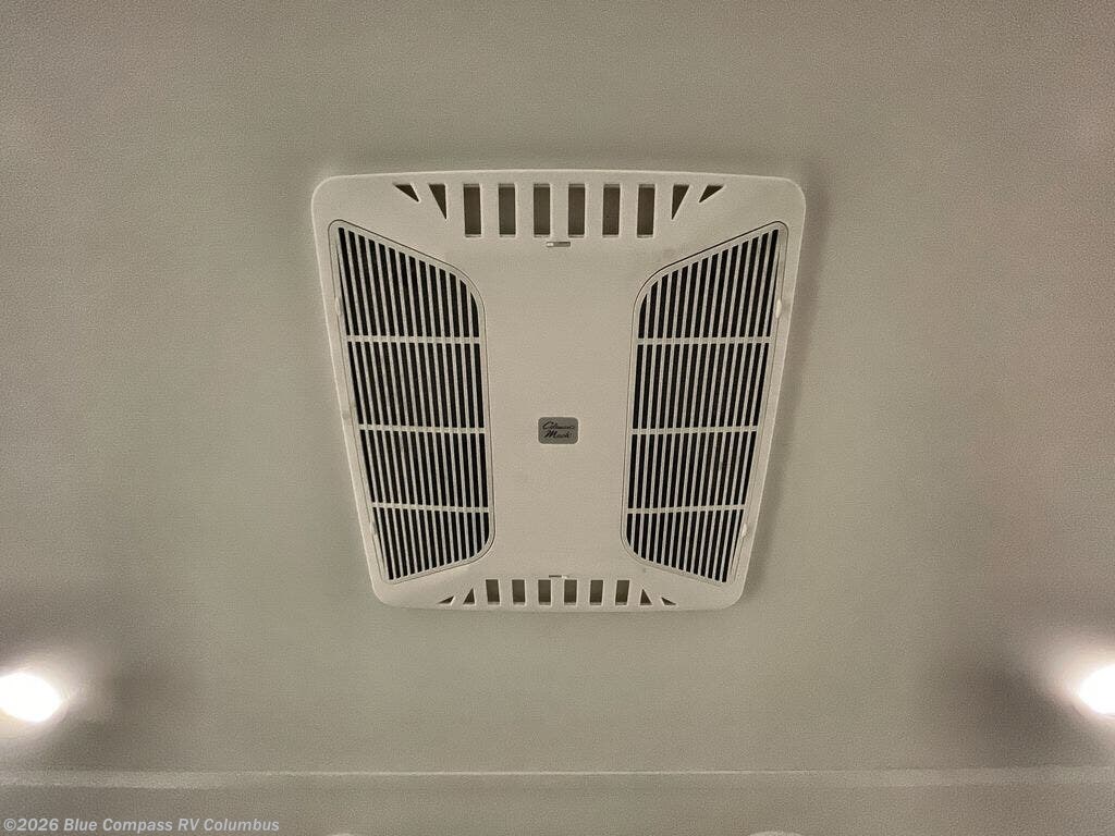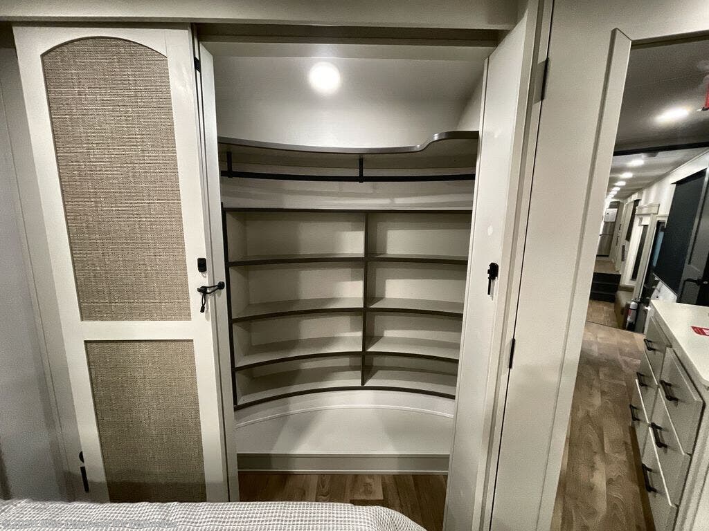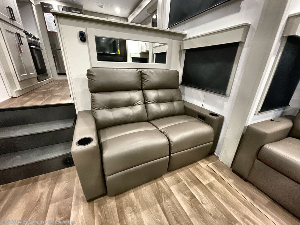 Enjoy each and every vacation, month-long trips, or even extended stays at an RV park in this spacious fifth wheel! The raised rear kitchen gives the cook plenty of room to whip up any type of meal using the stainless steel appliances including a built-in oven, an oversized pantry, and the raised bar top will provide you even more counter space on top of dining with two chairs that overlook the middle living area. Relaxing is made easy thanks to two tri-fold sofas and theatre seating while watching the big game on the LED Smart TV and enjoying the fireplace below. At night, retire to your own queen bed which slides out to provide more floor space, and you can store your clothes in the slide top dresser and front closet with washer and dryer prep.