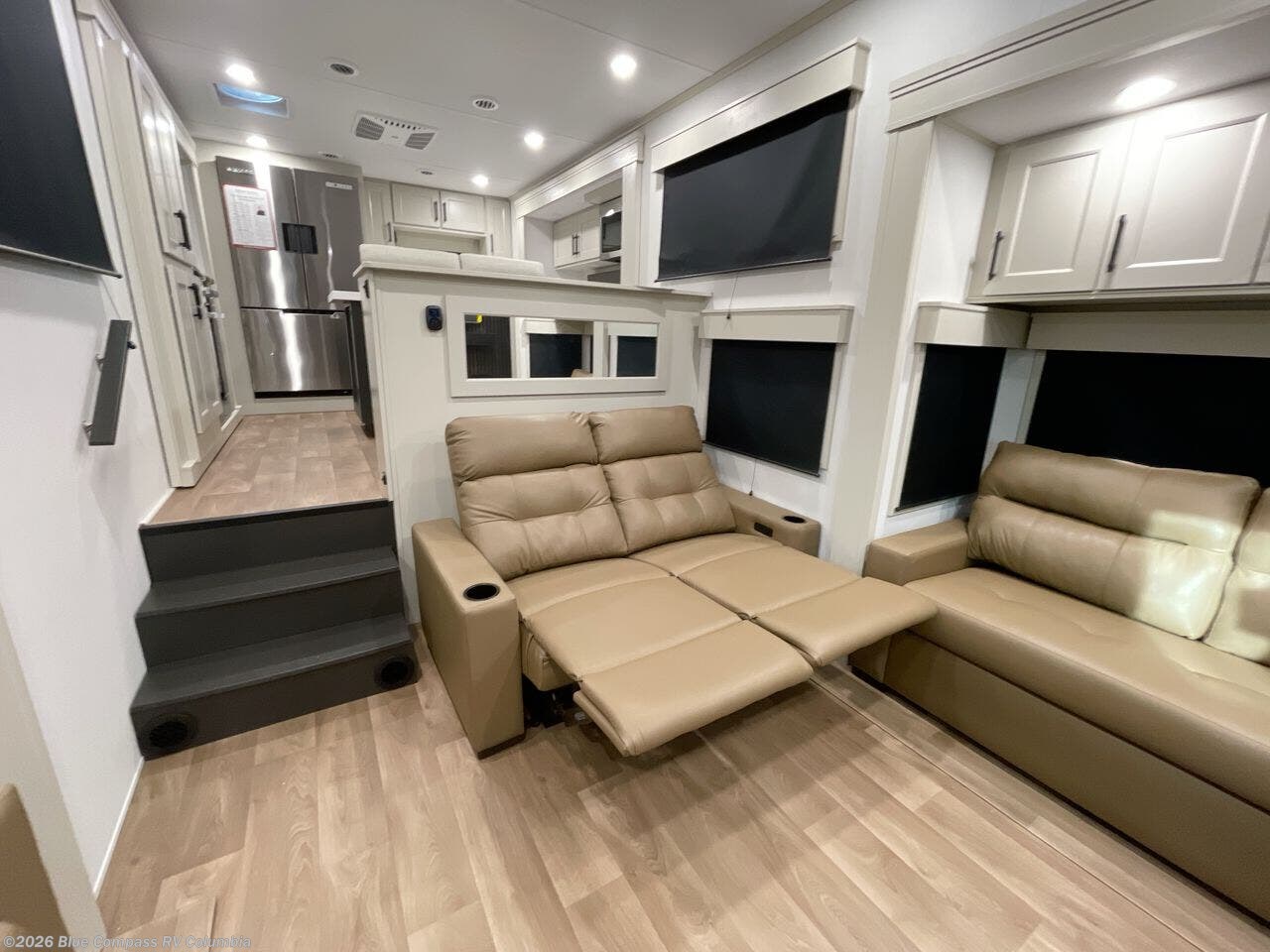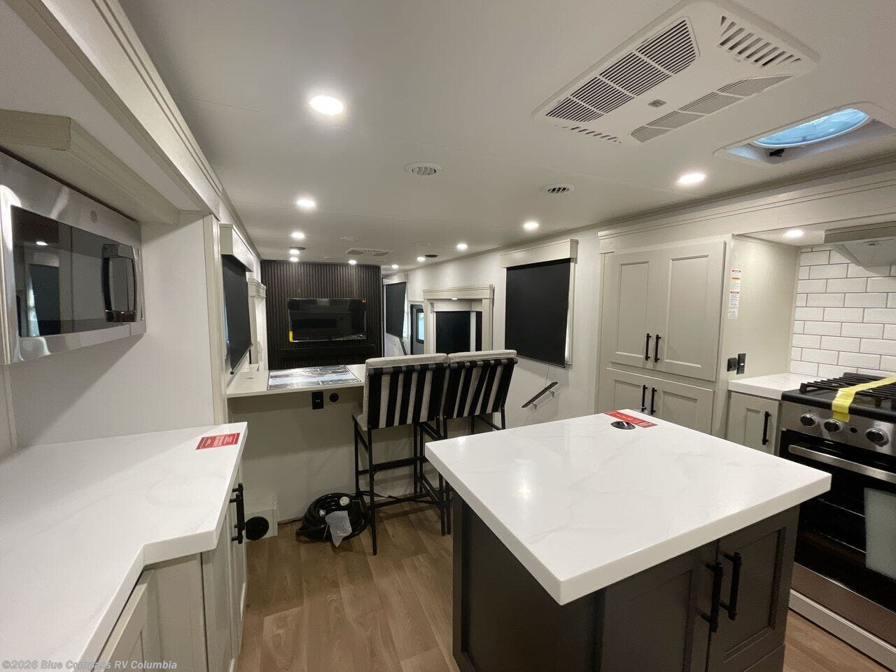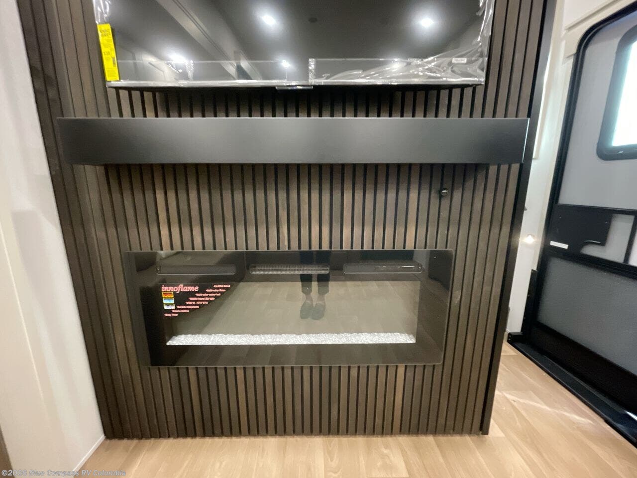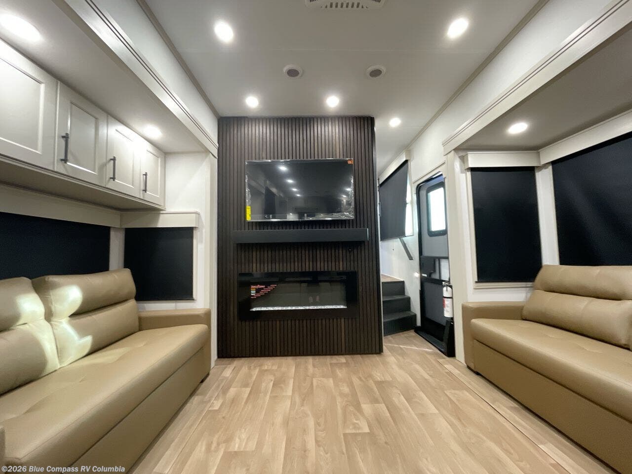 Enjoy each and every vacation, month-long trips, or even extended stays at an RV park in this spacious fifth wheel! The raised rear kitchen gives the cook plenty of room to whip up any type of meal using the stainless steel appliances including a built-in oven, an oversized pantry, and the raised bar top will provide you even more counter space on top of dining with two chairs that overlook the middle living area. Relaxing is made easy thanks to two tri-fold sofas and theatre seating while watching the big game on the LED Smart TV and enjoying the fireplace below. At night, retire to your own queen bed which slides out to provide more floor space, and you can store your clothes in the slide top dresser and front closet with washer and dryer prep.