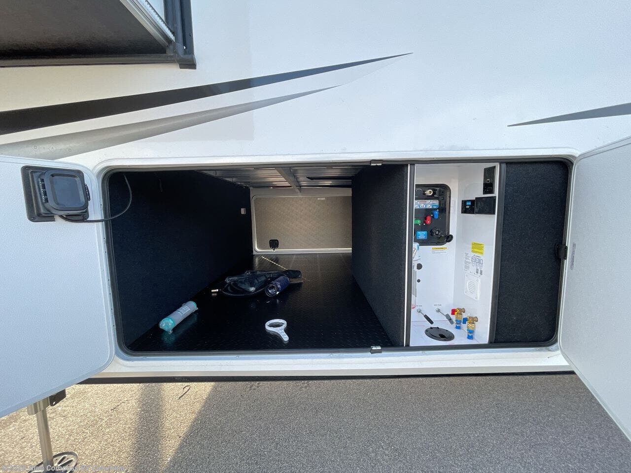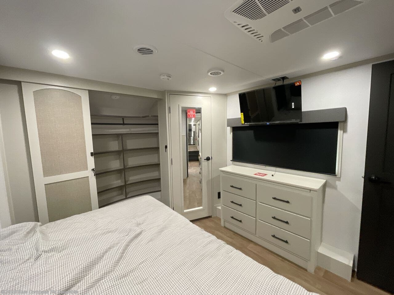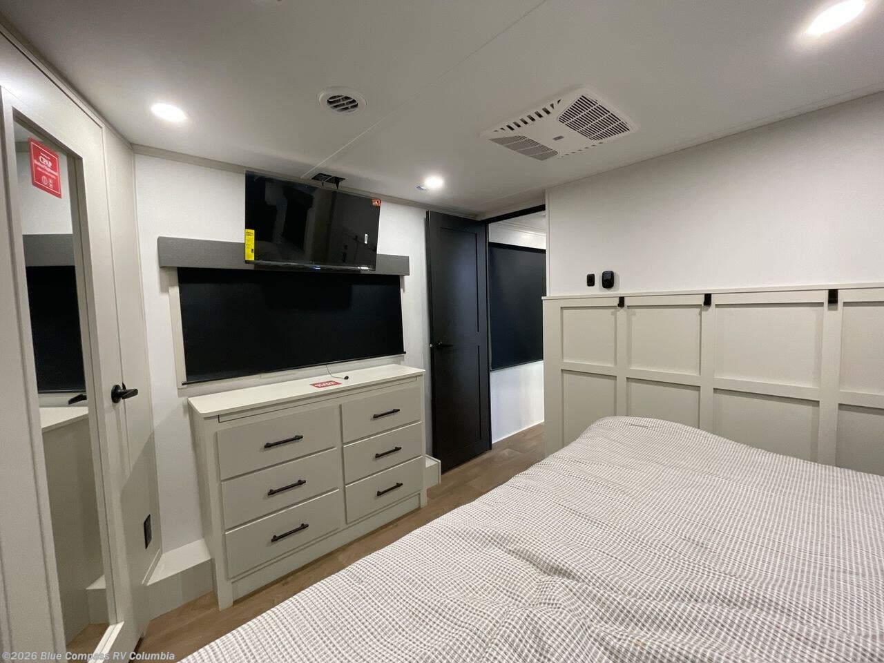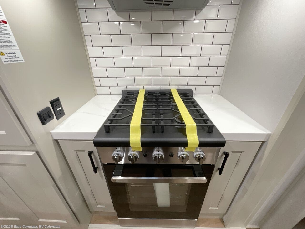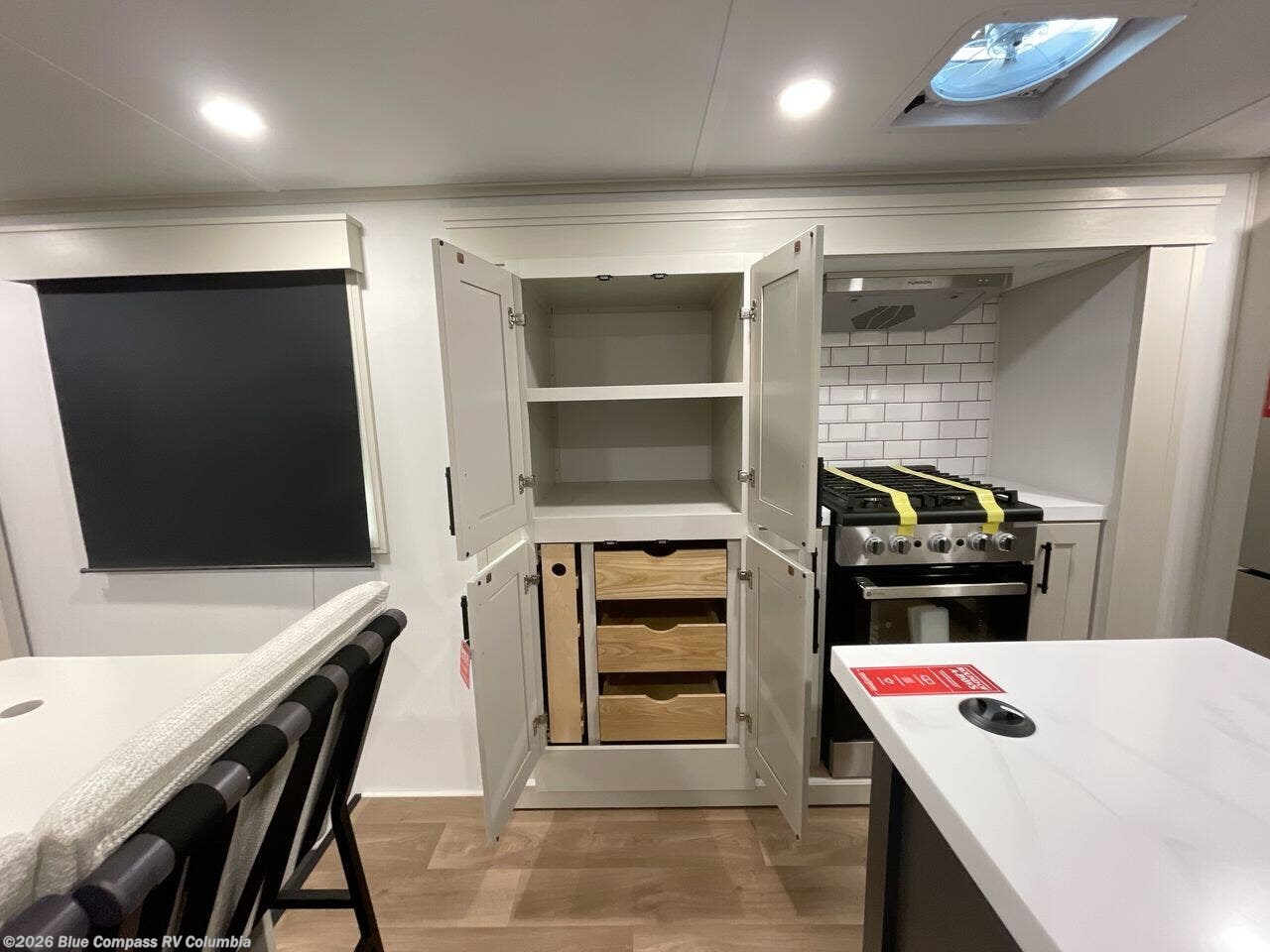 Enjoy each and every vacation, month-long trips, or even extended stays at an RV park in this spacious fifth wheel! The raised rear kitchen gives the cook plenty of room to whip up any type of meal using the stainless steel appliances including a built-in oven, an oversized pantry, and the raised bar top will provide you even more counter space on top of dining with two chairs that overlook the middle living area. Relaxing is made easy thanks to two tri-fold sofas and theatre seating while watching the big game on the LED Smart TV and enjoying the fireplace below. At night, retire to your own queen bed which slides out to provide more floor space, and you can store your clothes in the slide top dresser and front closet with washer and dryer prep.