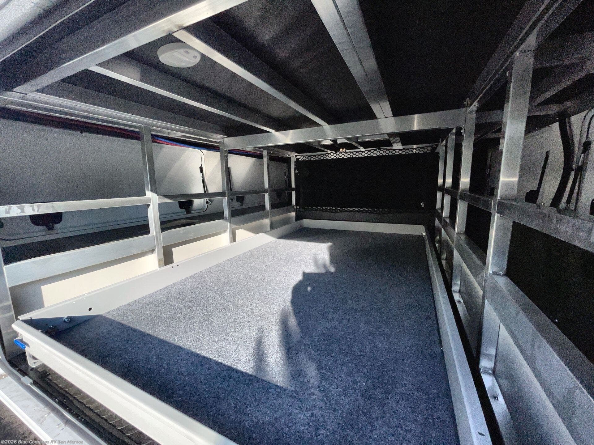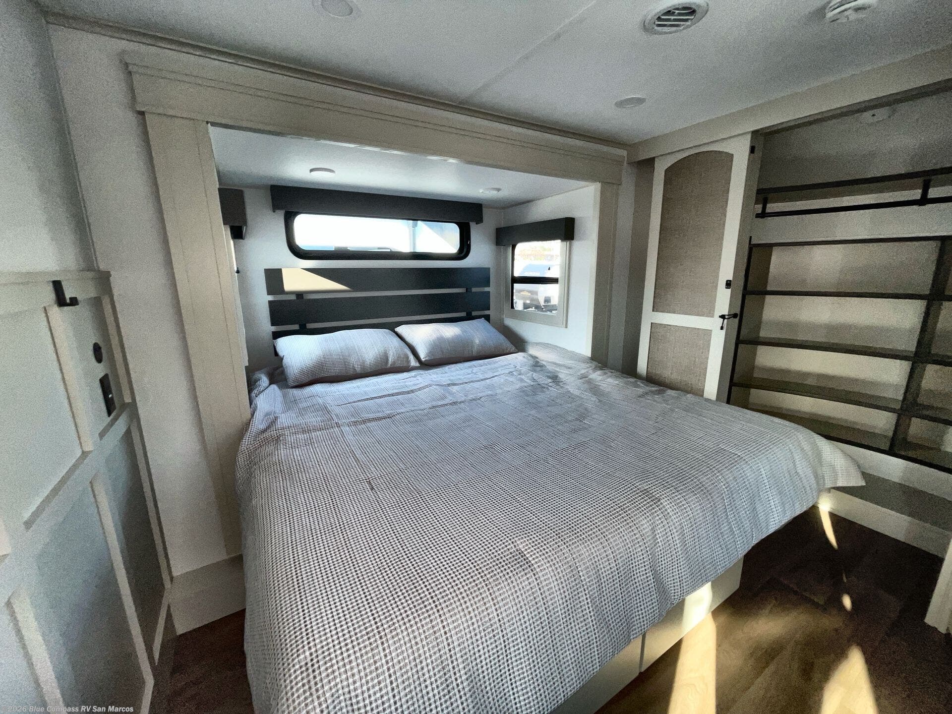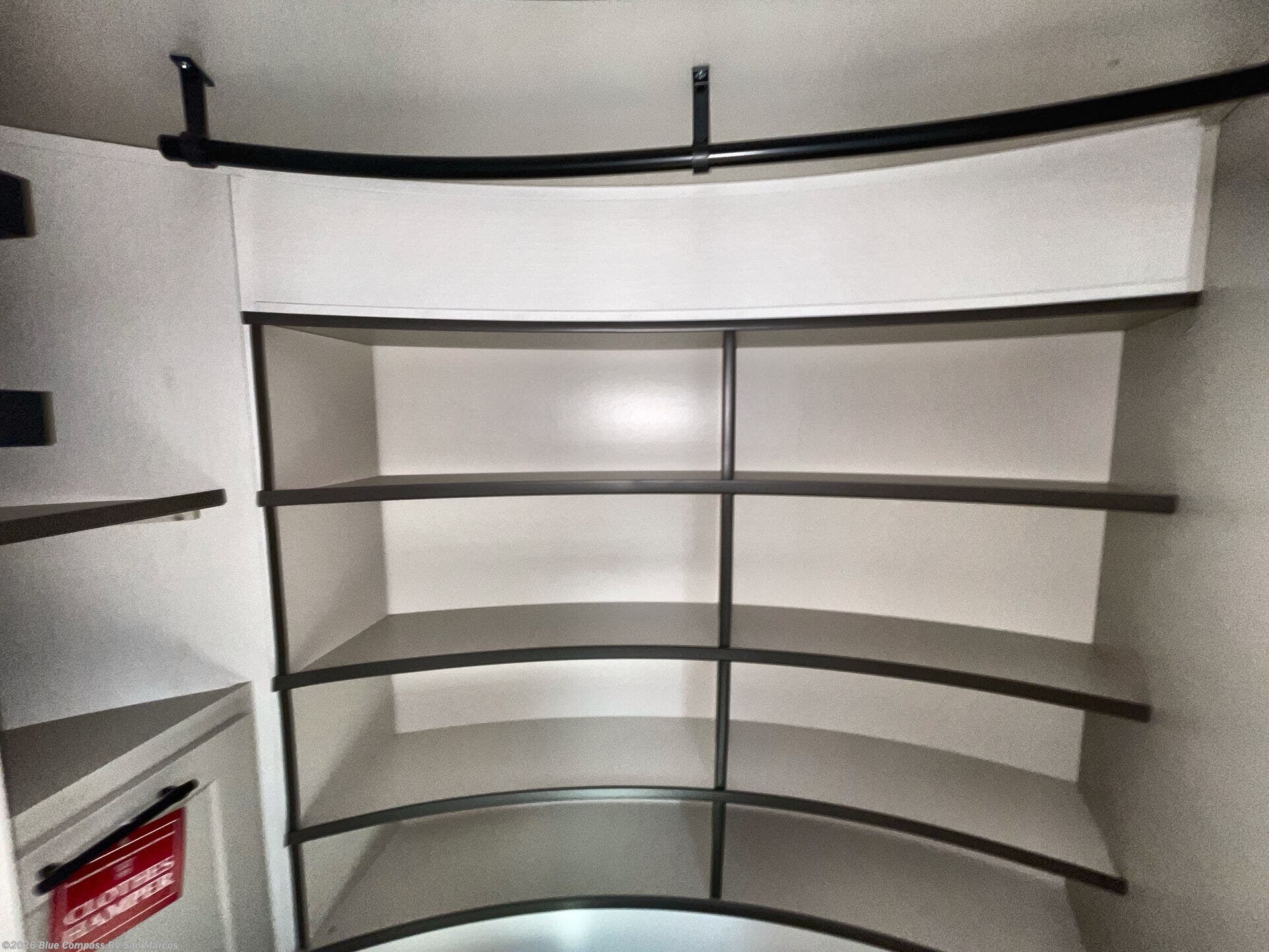 Enjoy each and every vacation, month-long trips, or even extended stays at an RV park in this spacious fifth wheel! The raised rear kitchen gives the cook plenty of room to whip up any type of meal using the stainless steel appliances including a built-in oven, an oversized pantry, and the raised bar top will provide you even more counter space on top of dining with two chairs that overlook the middle living area. Relaxing is made easy thanks to two tri-fold sofas and theatre seating while watching the big game on the LED Smart TV and enjoying the fireplace below. At night, retire to your own queen bed which slides out to provide more floor space, and you can store your clothes in the slide top dresser and front closet with washer and dryer prep.