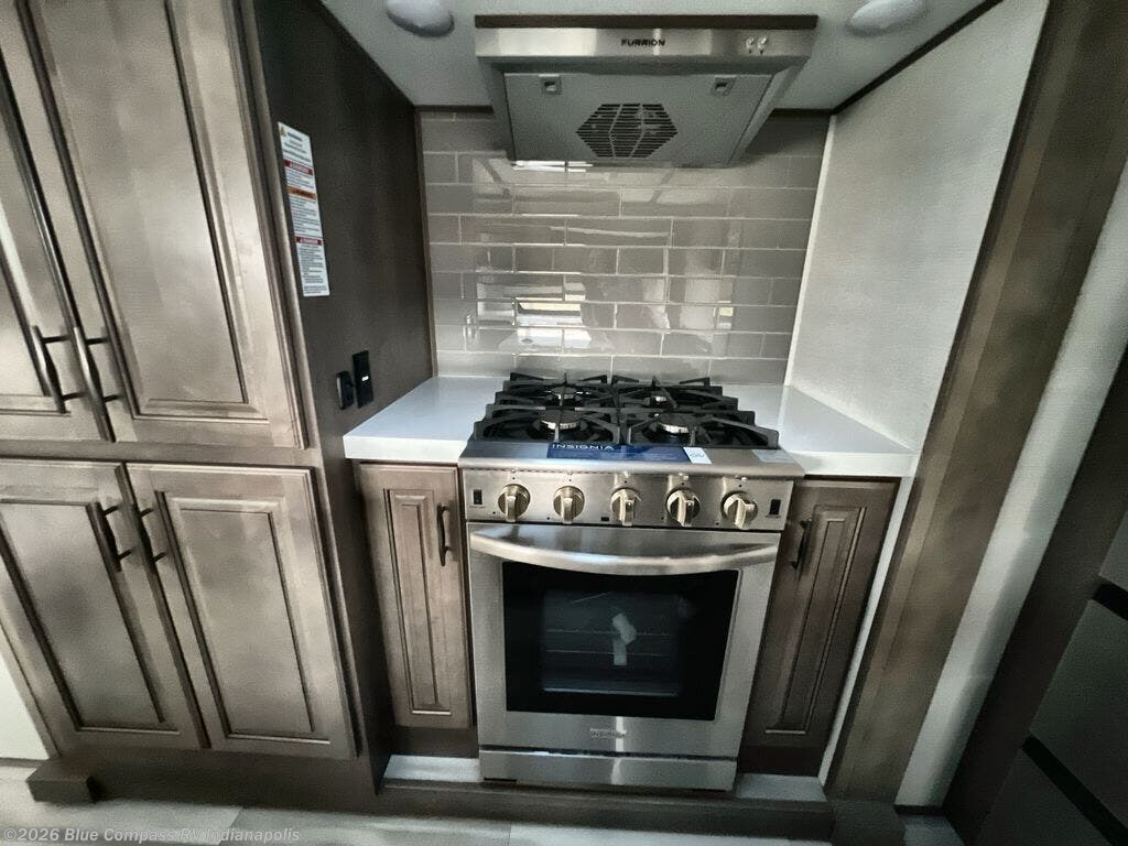 Designed for comfort on every journey, this spacious fifth wheel is ready for wherever the road takes you. The raised rear kitchen gives the cook plenty of room to whip up any type of meal using the stainless steel appliances including a built-in oven, an oversized pantry, and the raised bar top will provide you even more counter space on top of dining with two chairs that overlook the middle living area. Relaxing is made easy thanks to two tri-fold sofas and theatre seating while watching the big game on the LED Smart TV and enjoying the fireplace below. At night, retire to your own queen bed which slides out to provide more floor space, and you can store your clothes in the slide top dresser and front closet with washer and dryer prep.