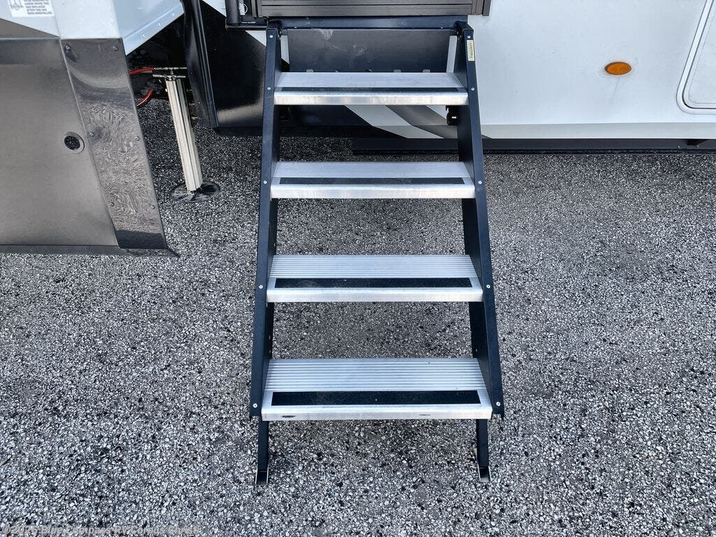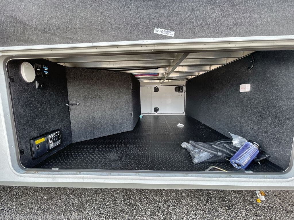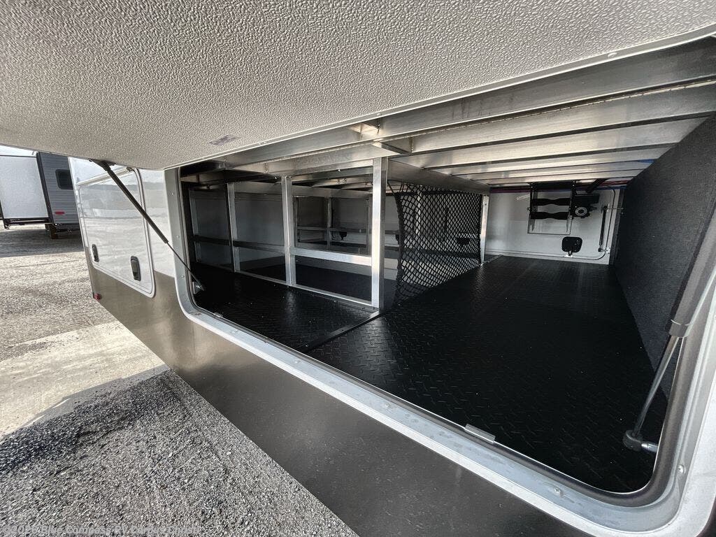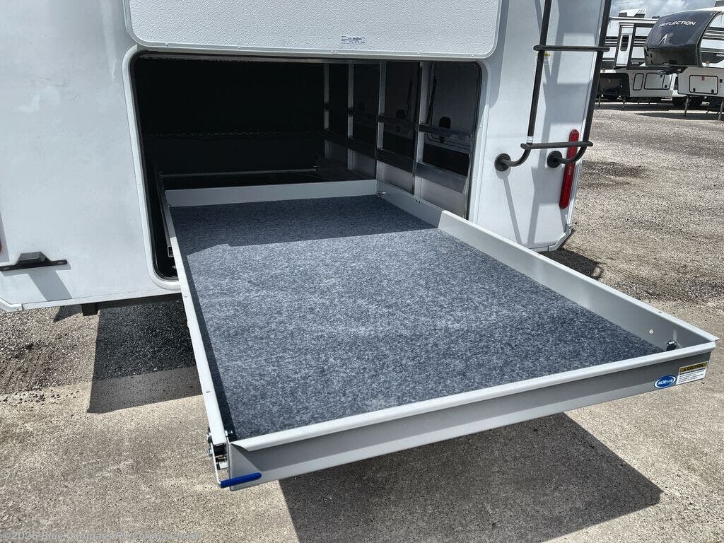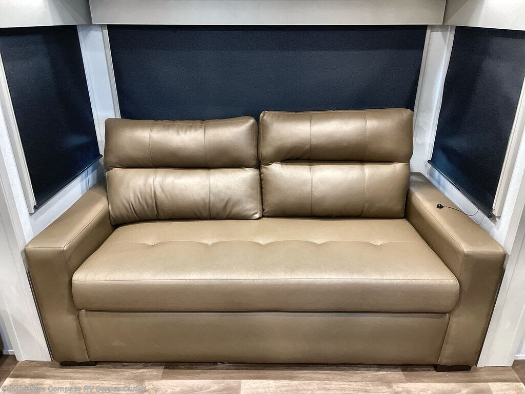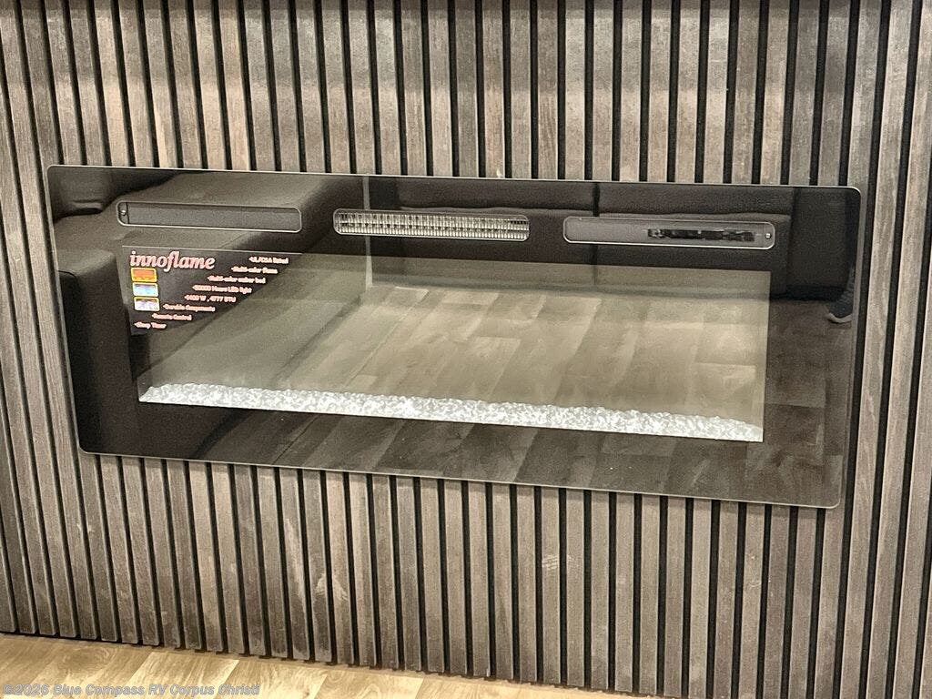 Designed for comfort on every journey, this spacious fifth wheel is ready for wherever the road takes you. The raised rear kitchen gives the cook plenty of room to whip up any type of meal using the stainless steel appliances including a built-in oven, an oversized pantry, and the raised bar top will provide you even more counter space on top of dining with two chairs that overlook the middle living area. Relaxing is made easy thanks to two tri-fold sofas and theatre seating while watching the big game on the LED Smart TV and enjoying the fireplace below. At night, retire to your own queen bed which slides out to provide more floor space, and you can store your clothes in the slide top dresser and front closet with washer and dryer prep.