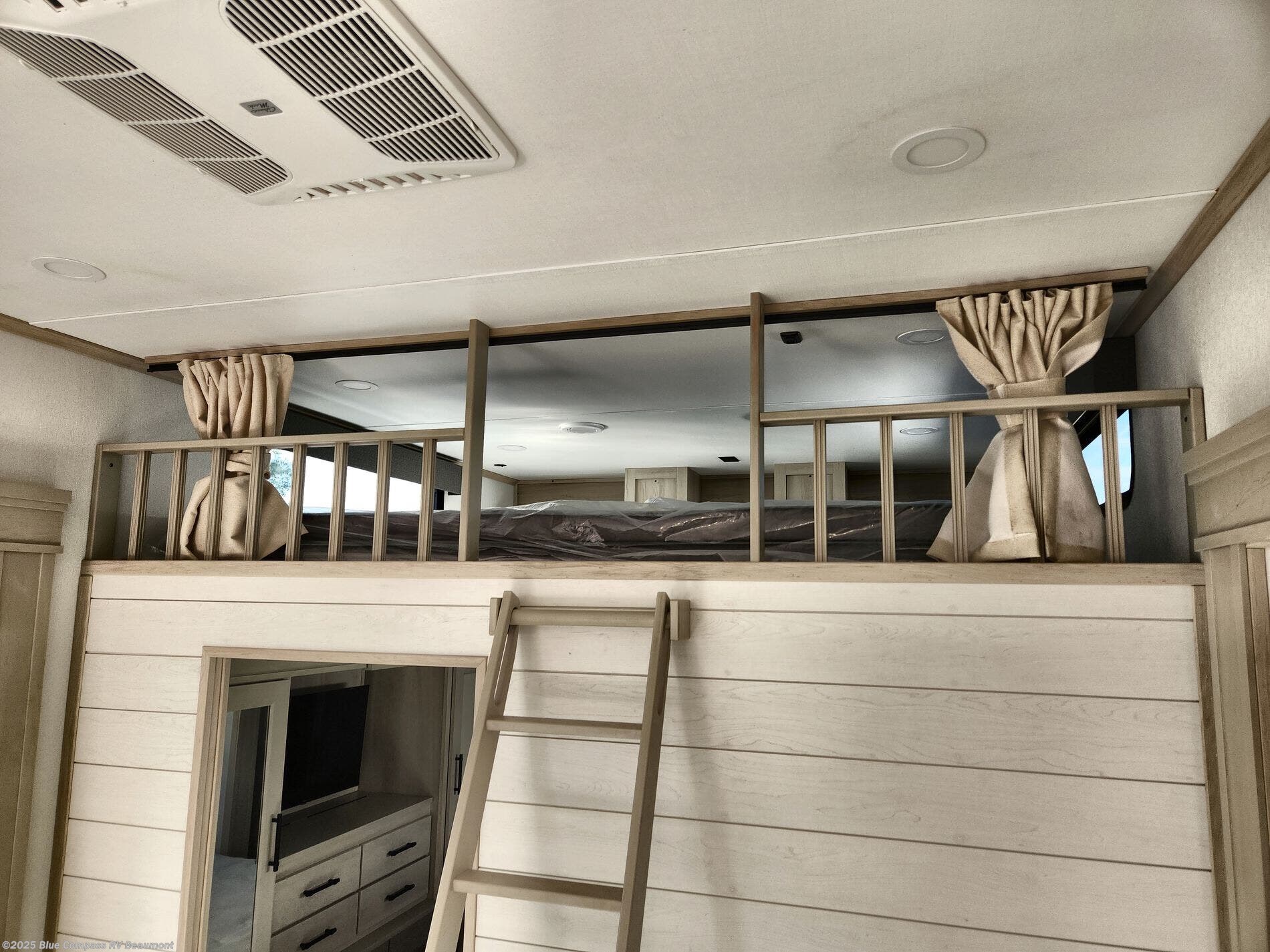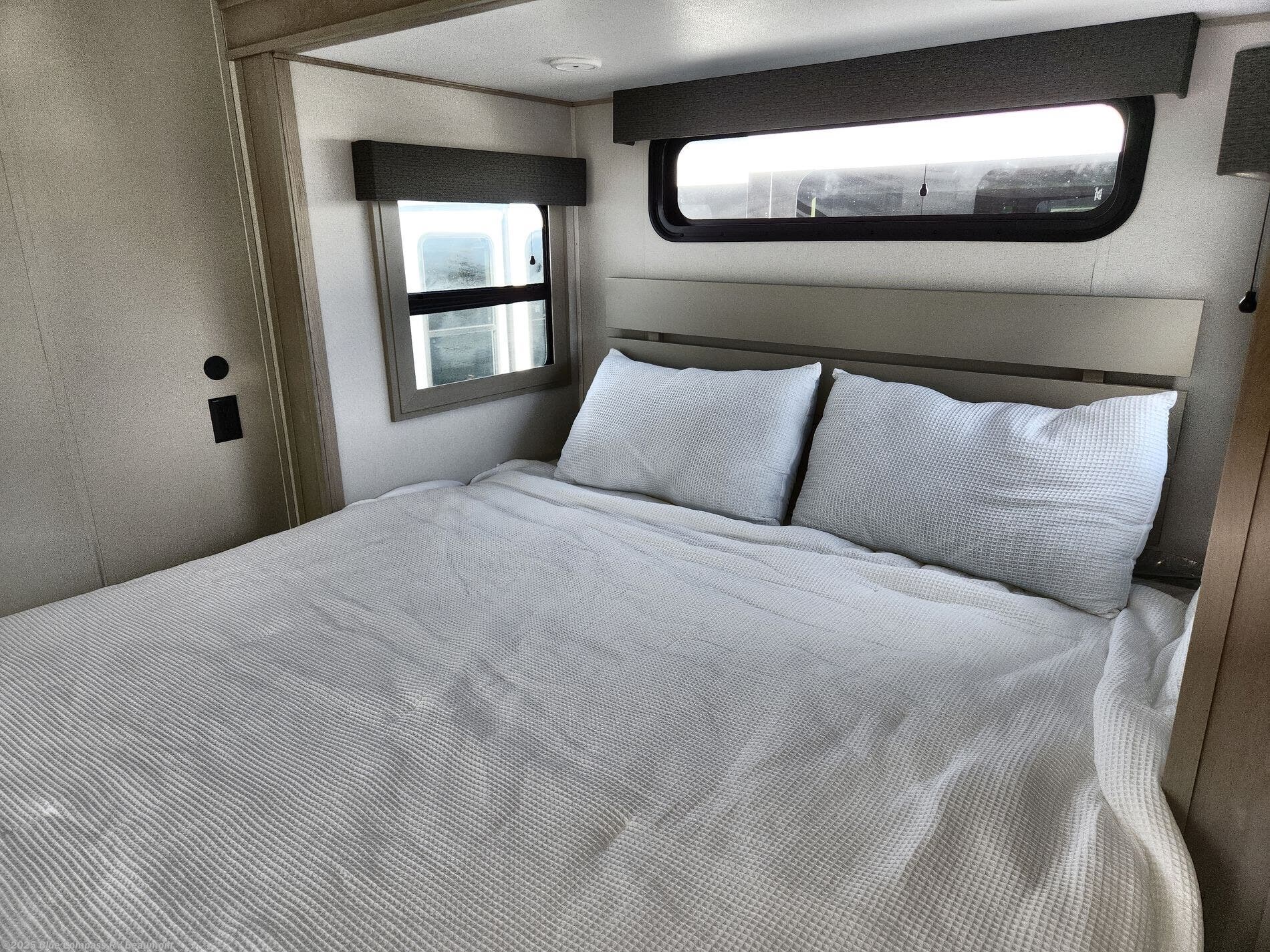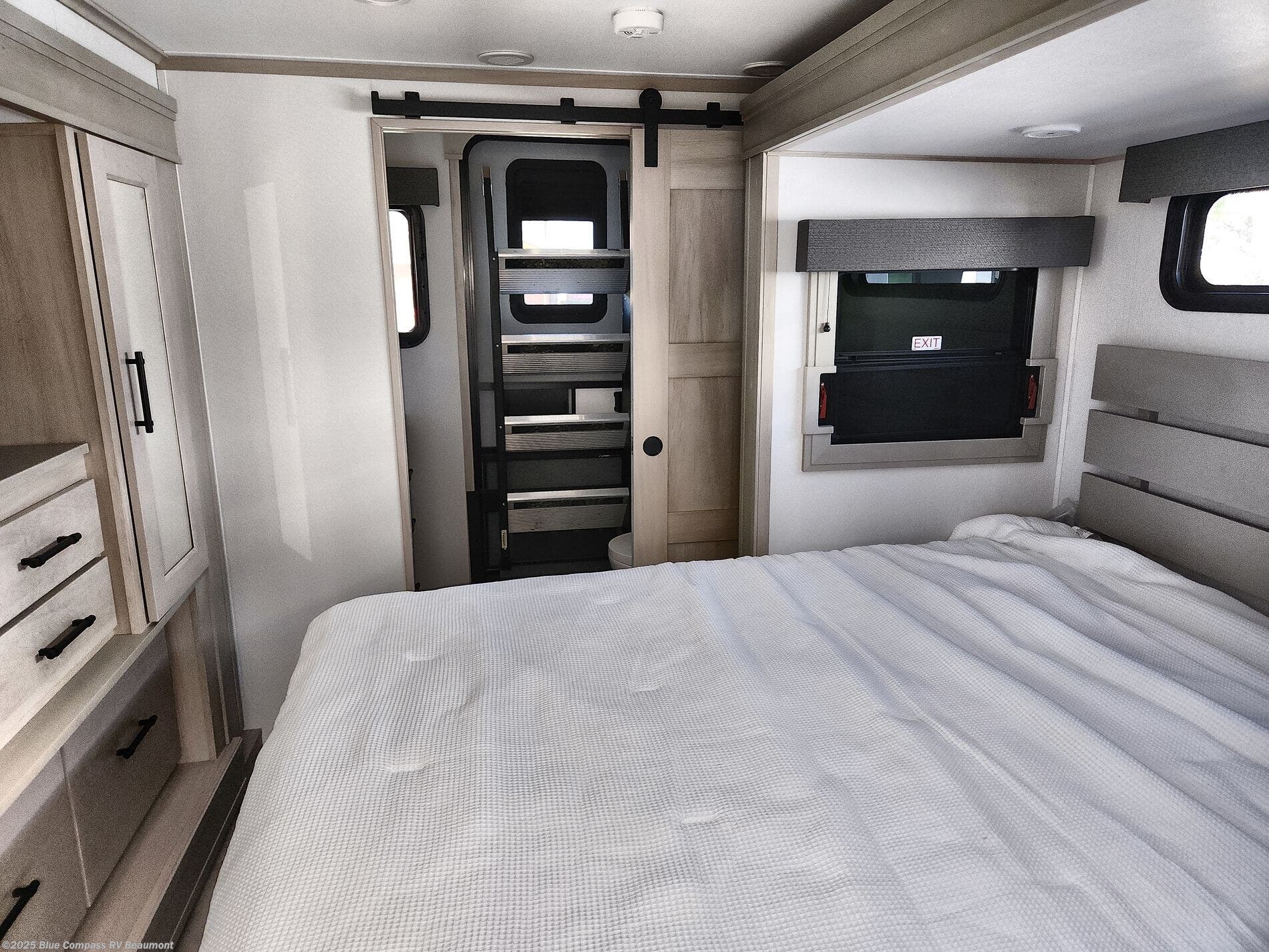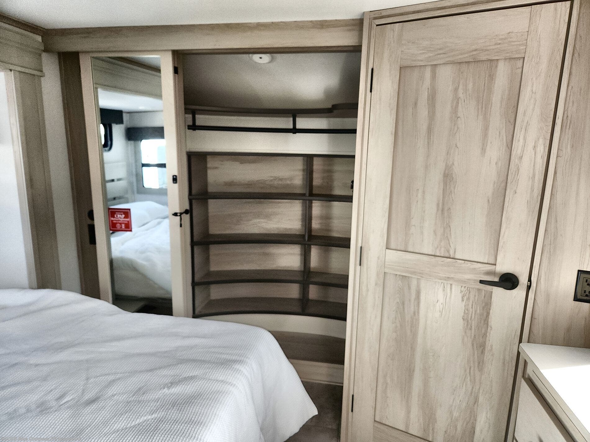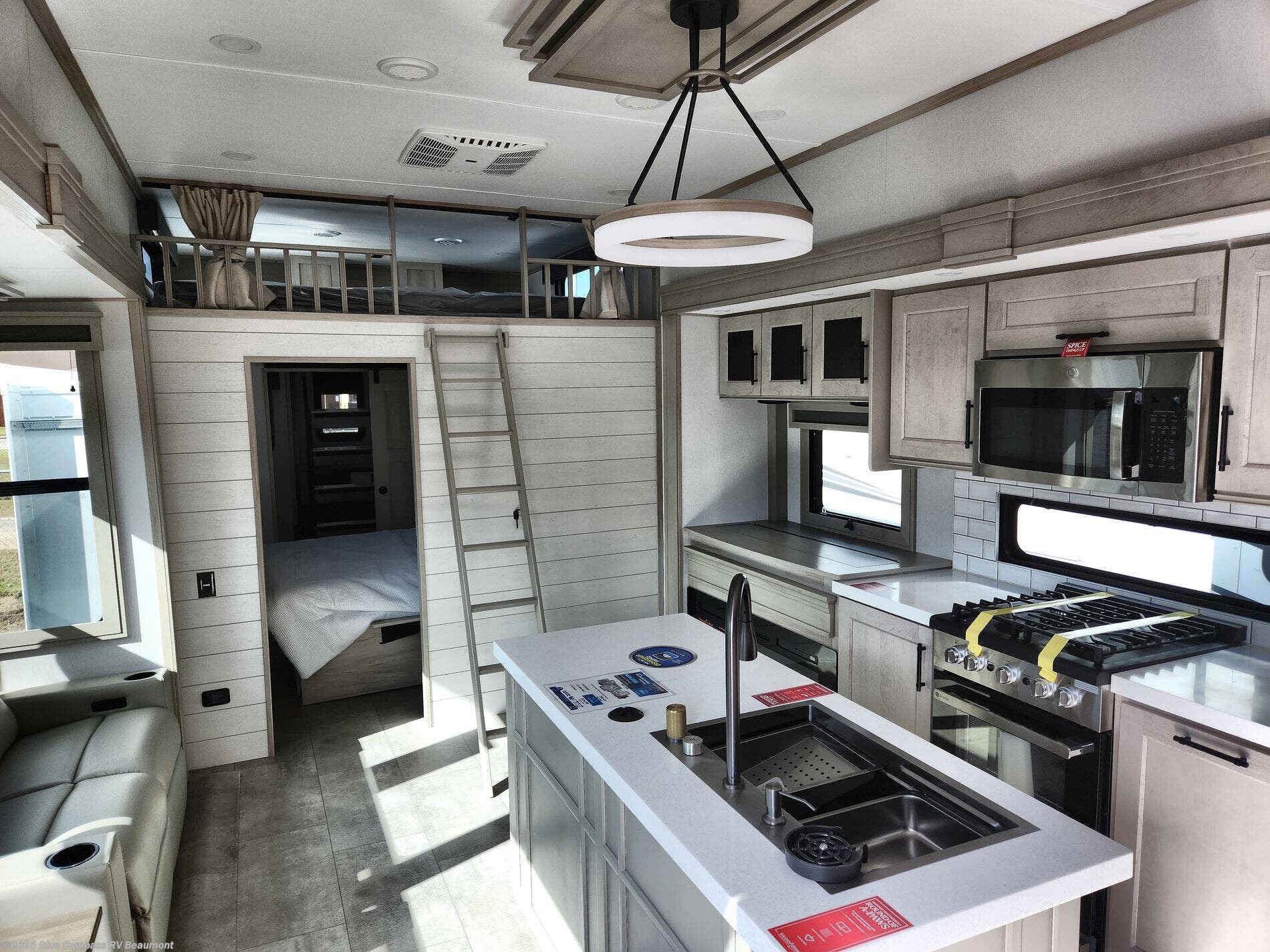 For an affordable luxury extended stay for your family, this Solitude is it! Two private bedrooms plus an overhead Sky Suite loft above the rear bedroom which also has it's own private rear entry/exit door is just the beginning of what is in store for your camping convenience. The upscale kitchen features an island with dishwasher prep, a smart sink, a 12V 20 cu. ft. refrigerator for your perishables, and a built-in oven. There is also a microwave, pantry, and hutch for your dishes, plus a free standing dinette! You can easily take along extra family and friends with the second private bedroom featuring it's own private bath and entry which is great for another couple, and there is even loft space above this rear private bedroom for added storage or sleeping for children. And, you will find ample storage for clothing and belongings throughout with nice size closets, overhead cabinets, plus loads of outside storage.