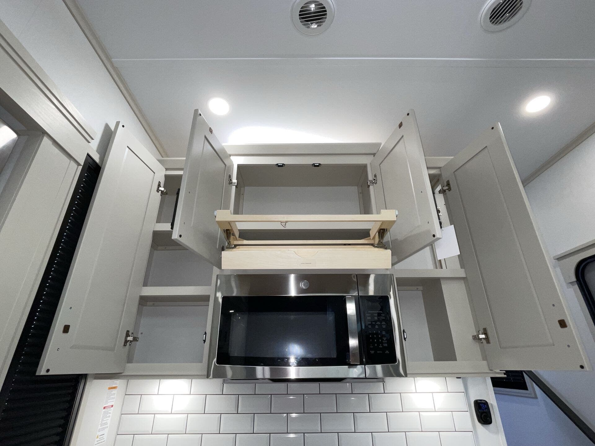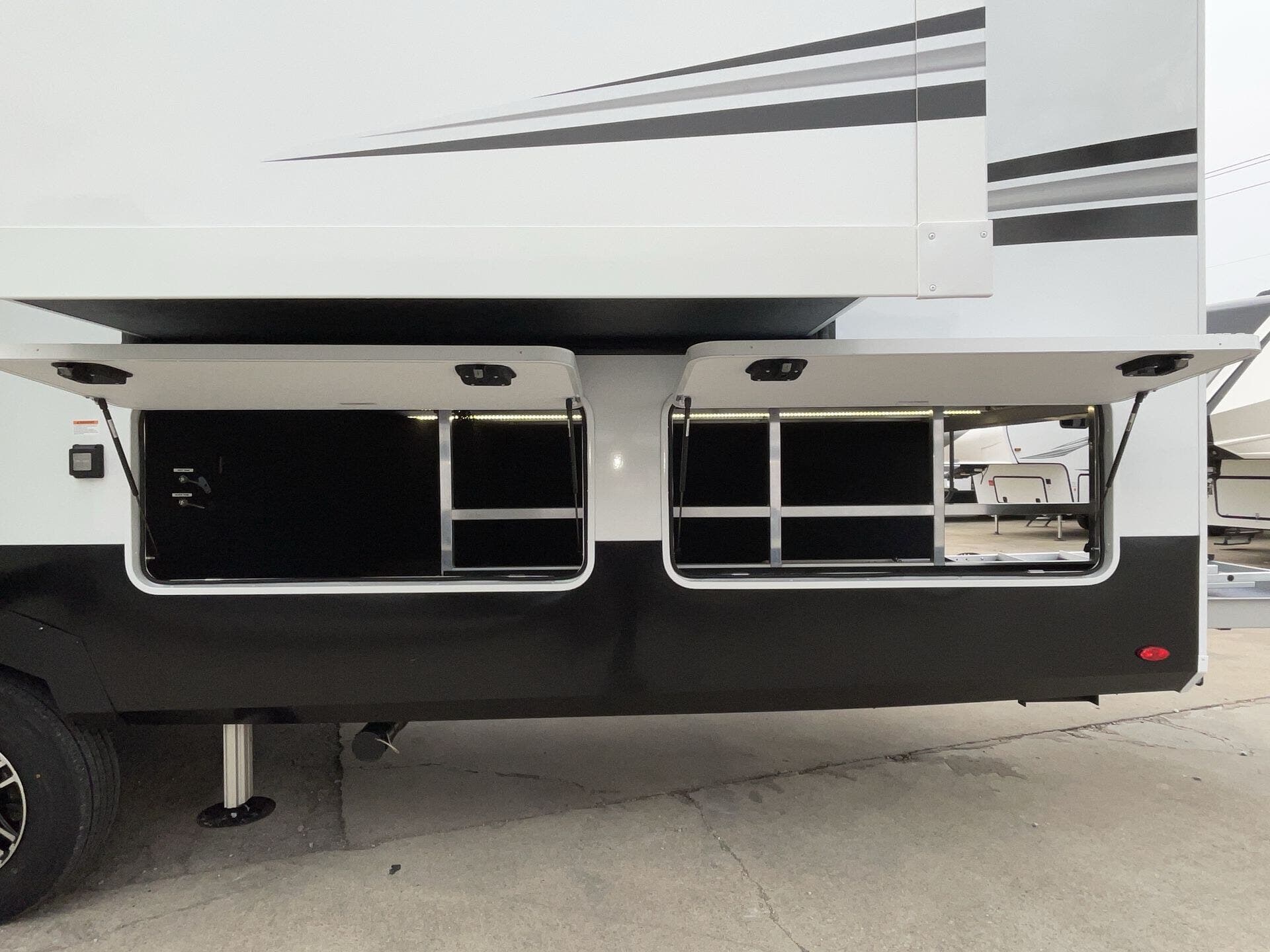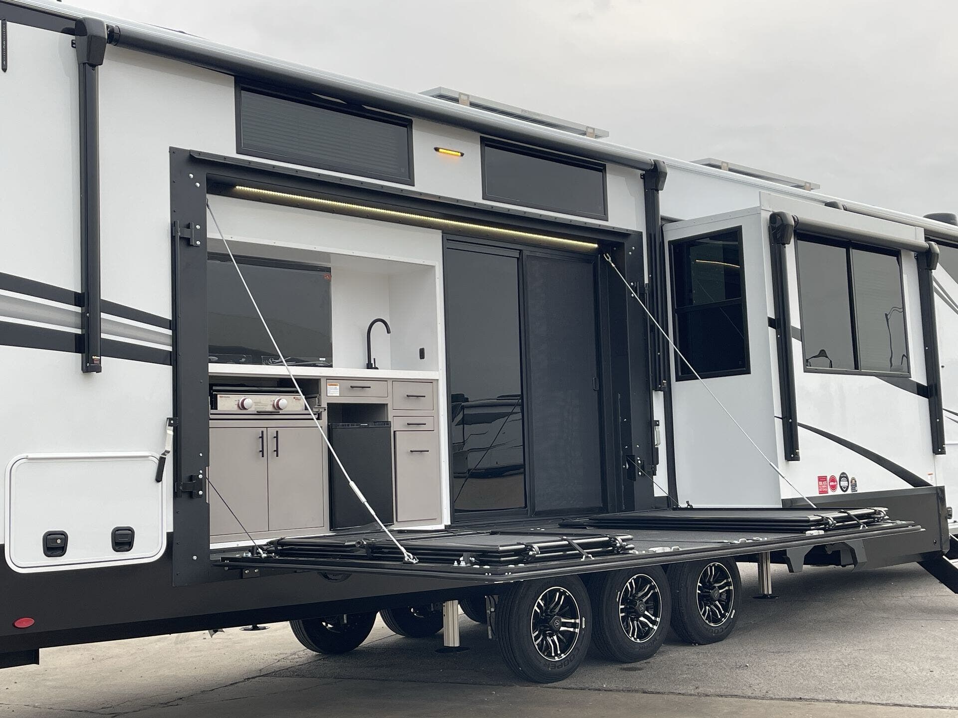 Awning, Black Tank Flush, Detachable Power Cord, Enclosed Underbelly, Exterior Speakers, Heated Underbelly, Ladder, Leveling Jacks, Mor-Ryde Suspension, Outside Kitchen, Pass Thru Storage, Power Awning, Roof Vent, Screen Door, Side Ramp Door, Slam Latch Baggage Doors, Slideout, Spare Tire Kit, Tinted Windows -