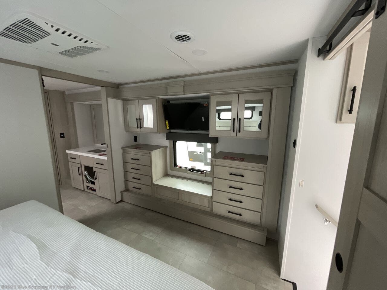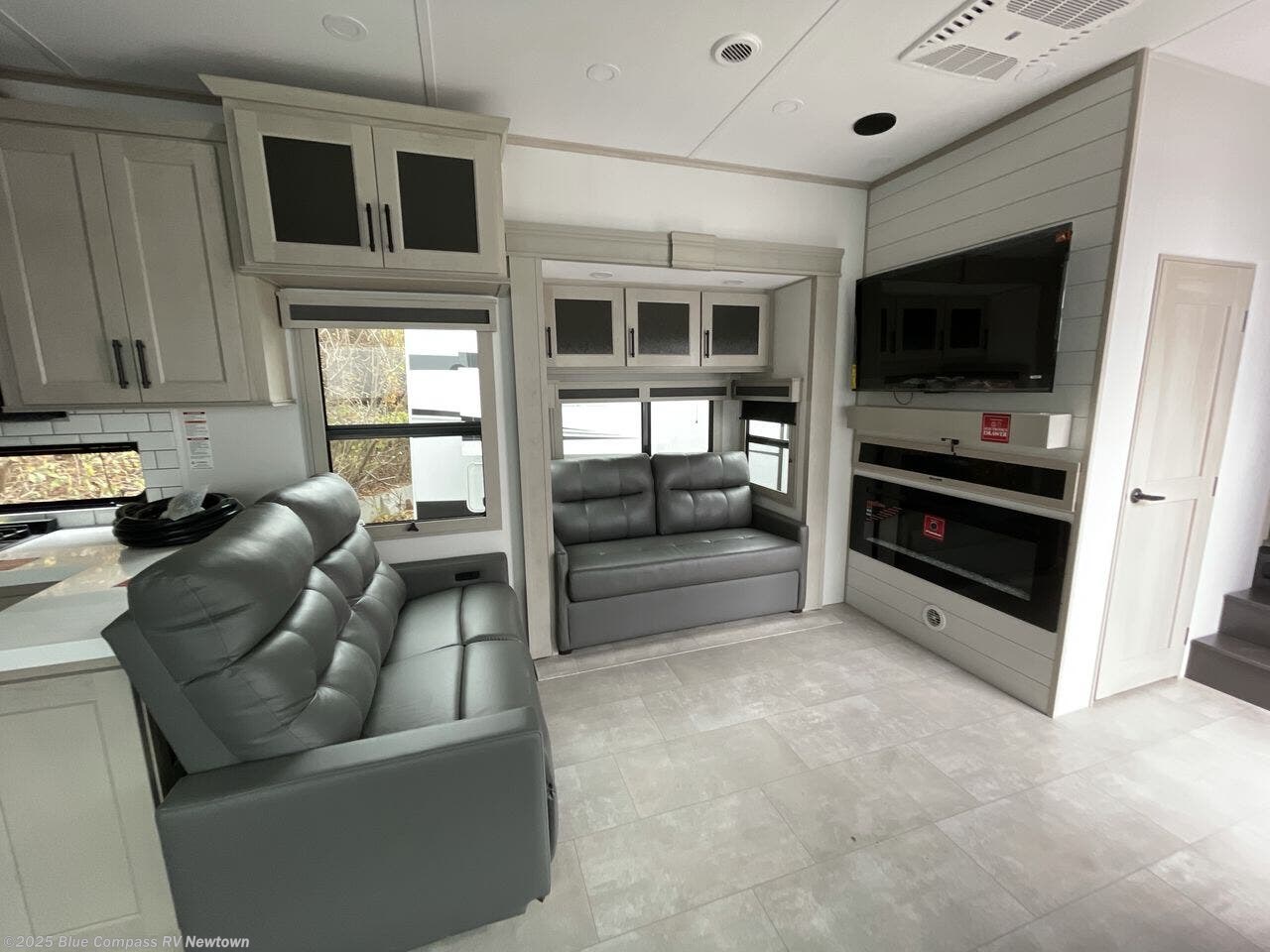Comfort will come easy in this four slide out fifth wheel! You will feel right at home with a master bedroom that includes a queen bed slide out with a king bed option, dual dressers with a seat in between, plus a large front bath with tons of space. The convenient half bath is right as you enter the unit for convenience. Your crew can get cozy on the dual tri-fold sofas within dual opposing slides, or on the theater seating across from the LED TV and fireplace. One feature you will love about this fifth wheel is the rear kitchen with wrap-around counter space, a built-in oven, plus a 20 cu. ft. 12V refrigerator and a large pantry to keep food fresh.