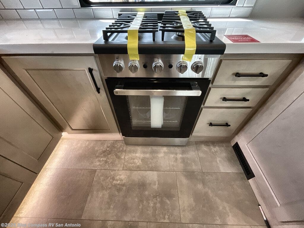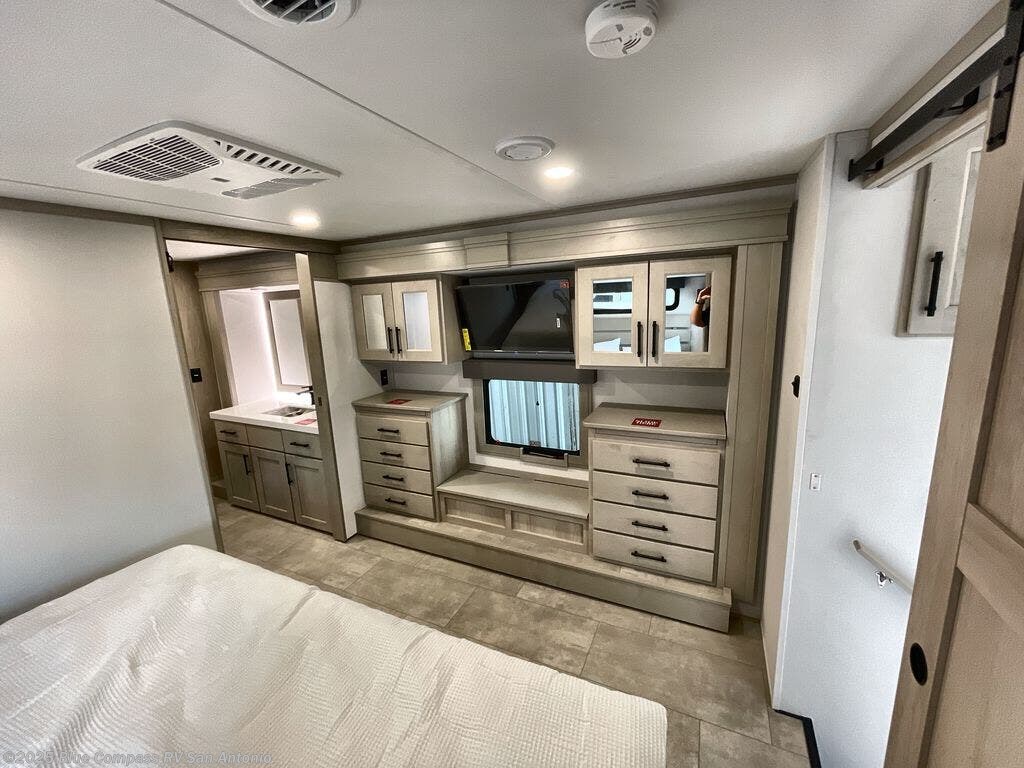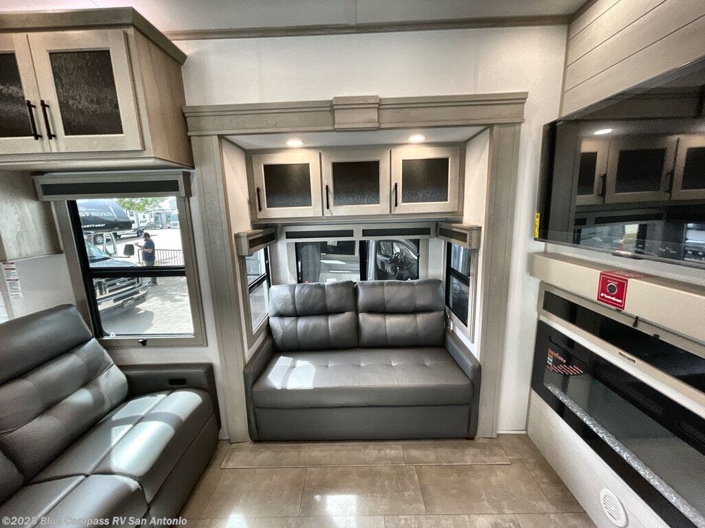 Comfort will come easy in this four slide out fifth wheel! You will feel right at home with a master bedroom that includes a queen bed slide out with a king bed option, dual dressers with a seat in between, plus a large front bath with tons of space. The convenient half bath is right as you enter the unit for convenience. Your crew can get cozy on the dual tri-fold sofas within dual opposing slides, or on the theater seating across from the LED TV and fireplace. One feature you will love about this fifth wheel is the rear kitchen with wrap-around counter space, a built-in oven, plus a 20 cu. ft. 12V refrigerator and a large pantry to keep food fresh.