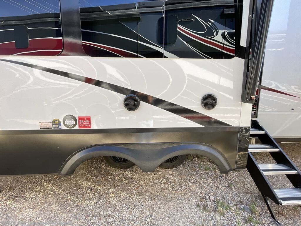 Comfort will come easy in this four slide out fifth wheel! You will feel right at home with a master bedroom that includes a queen bed slide out with a king bed option, dual dressers with a seat in between, plus a large front bath with tons of space. The convenient half bath is right as you enter the unit for convenience. Your crew can get cozy on the dual tri-fold sofas within dual opposing slides, or on the theater seating across from the LED TV and fireplace. One feature you will love about this fifth wheel is the rear kitchen with wrap-around counter space, a built-in oven, plus a 20 cu. ft. 12V refrigerator and a large pantry to keep food fresh.