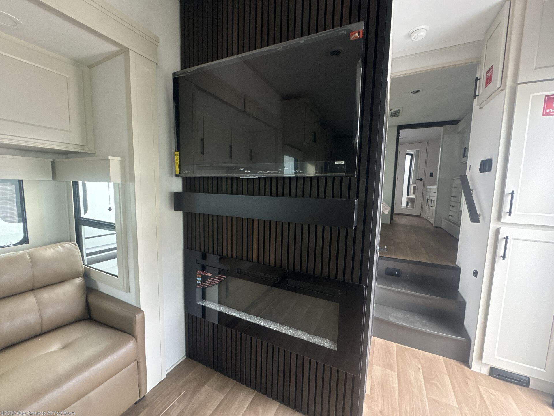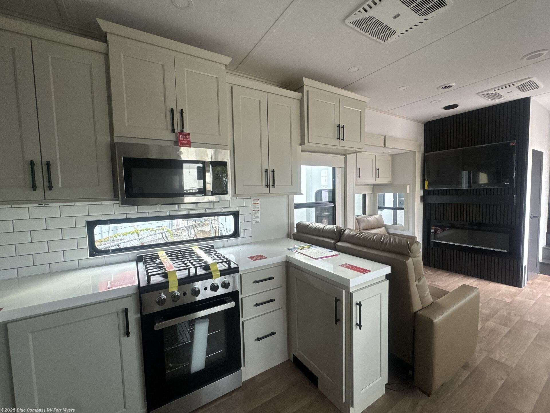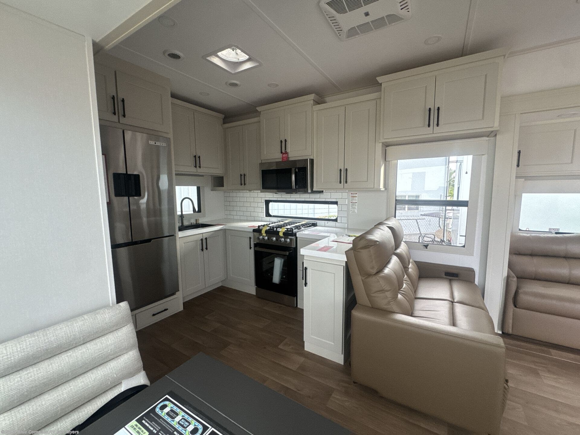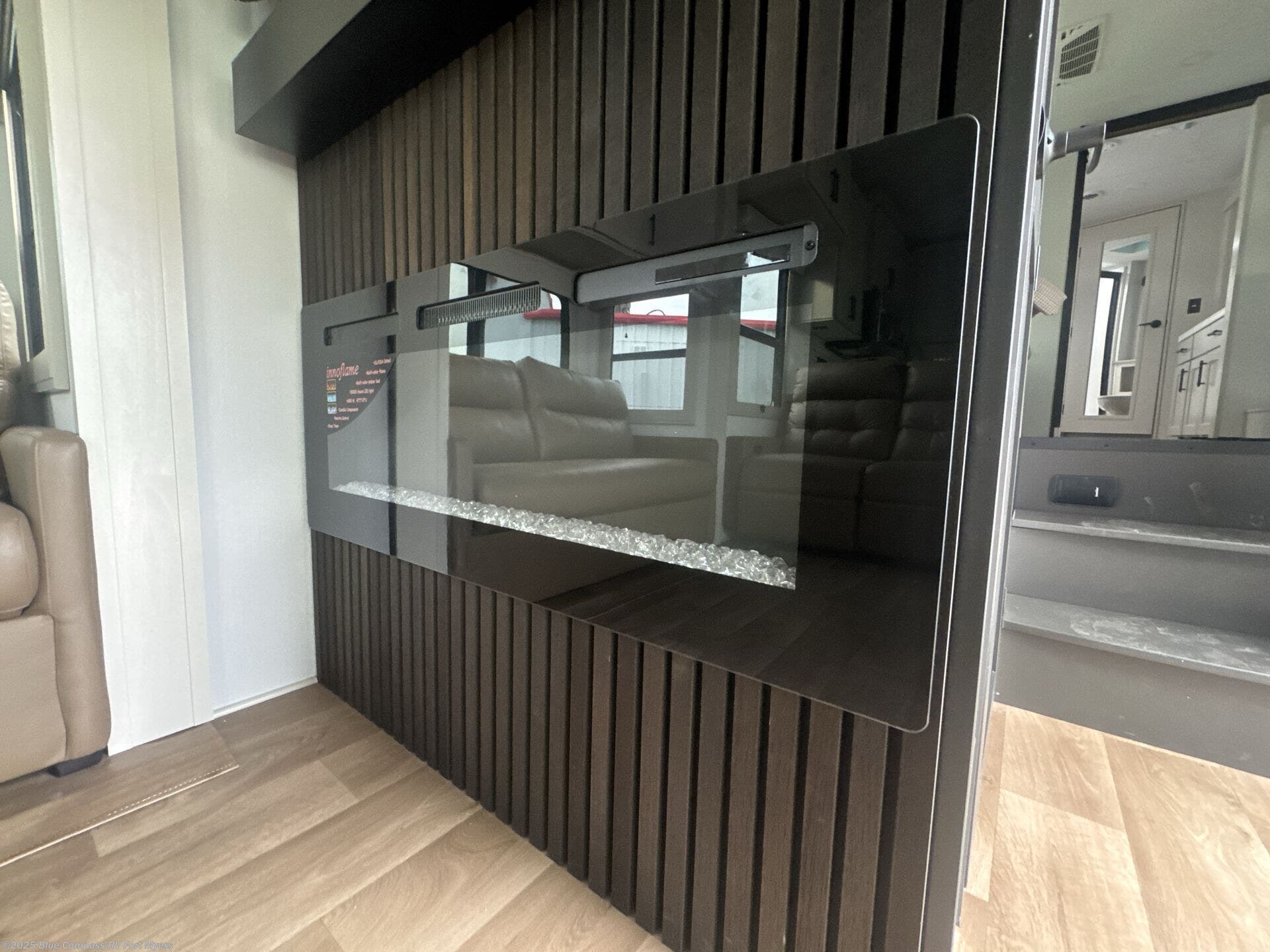 Comfort will come easy in this four slide out fifth wheel! You will feel right at home with a master bedroom that includes a queen bed slide out with a king bed option, dual dressers with a seat in between, plus a large front bath with tons of space. The convenient half bath is right as you enter the unit for convenience. Your crew can get cozy on the dual tri-fold sofas within dual opposing slides, or on the theater seating across from the LED TV and fireplace. One feature you will love about this fifth wheel is the rear kitchen with wrap-around counter space, a built-in oven, plus a 20 cu. ft. 12V refrigerator and a large pantry to keep food fresh.