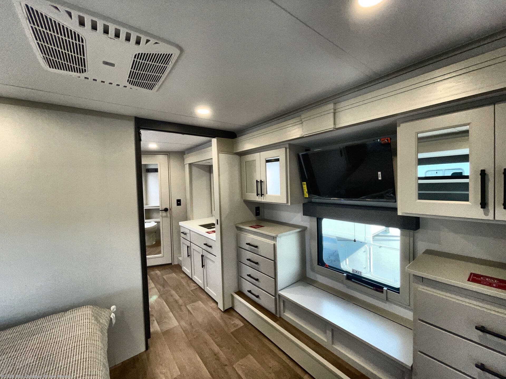 Comfort will come easy in this four slide out fifth wheel! You will feel right at home with a master bedroom that includes a queen bed slide out with a king bed option, dual dressers with a seat in between, plus a large front bath with tons of space. The convenient half bath is right as you enter the unit for convenience. Your crew can get cozy on the dual tri-fold sofas within dual opposing slides, or on the theater seating across from the LED TV and fireplace. One feature you will love about this fifth wheel is the rear kitchen with wrap-around counter space, a built-in oven, plus a 20 cu. ft. 12V refrigerator and a large pantry to keep food fresh.