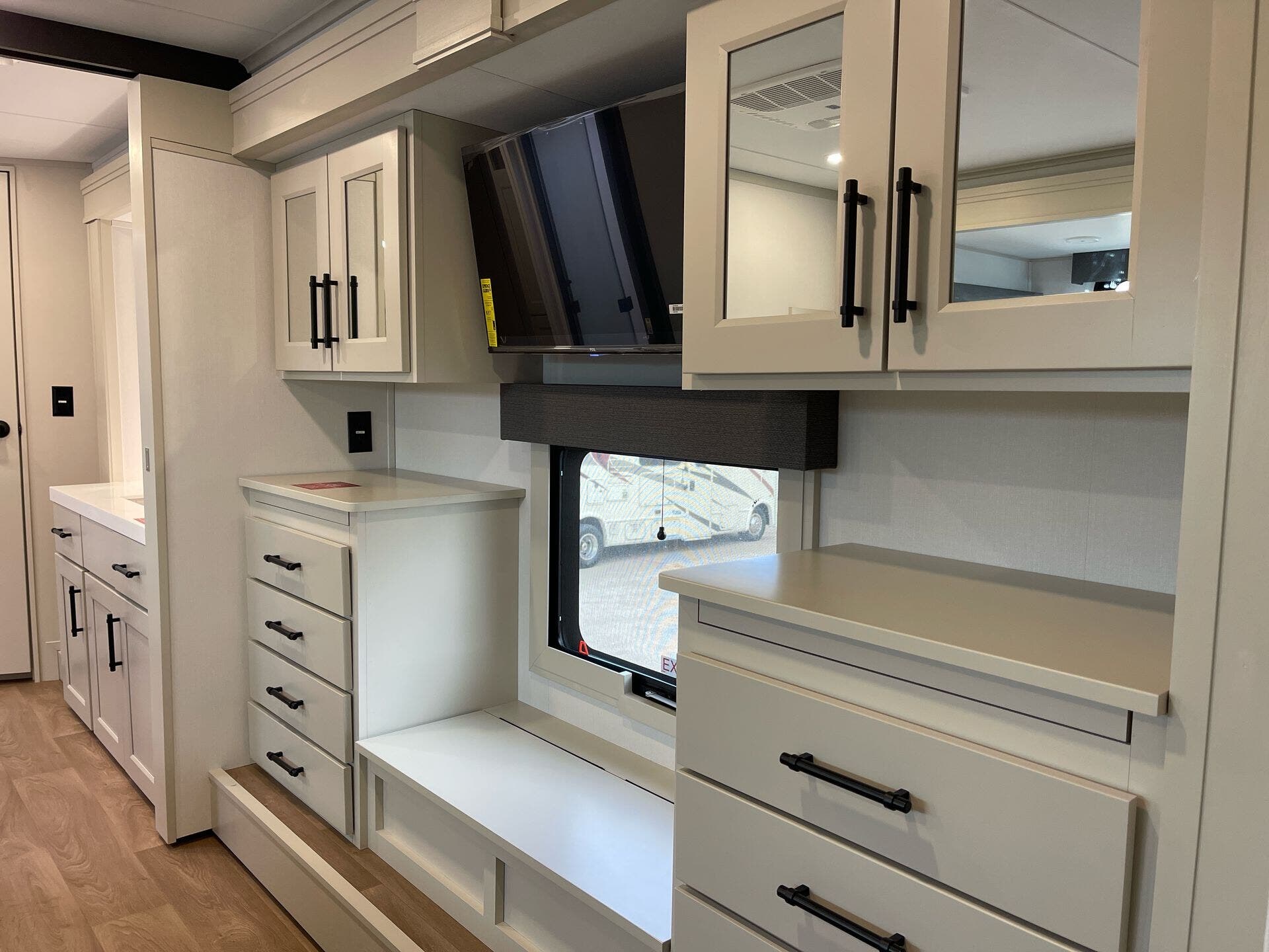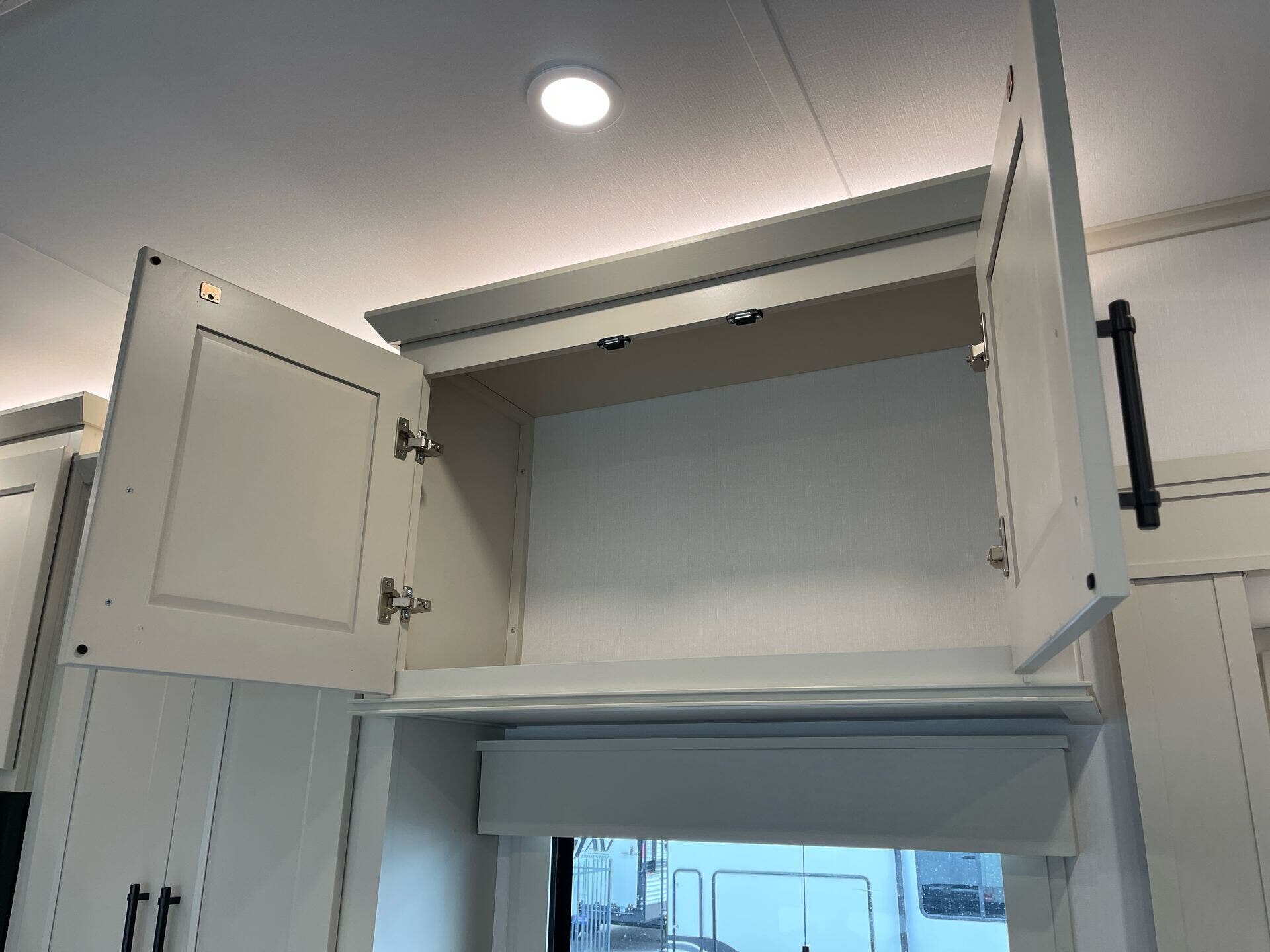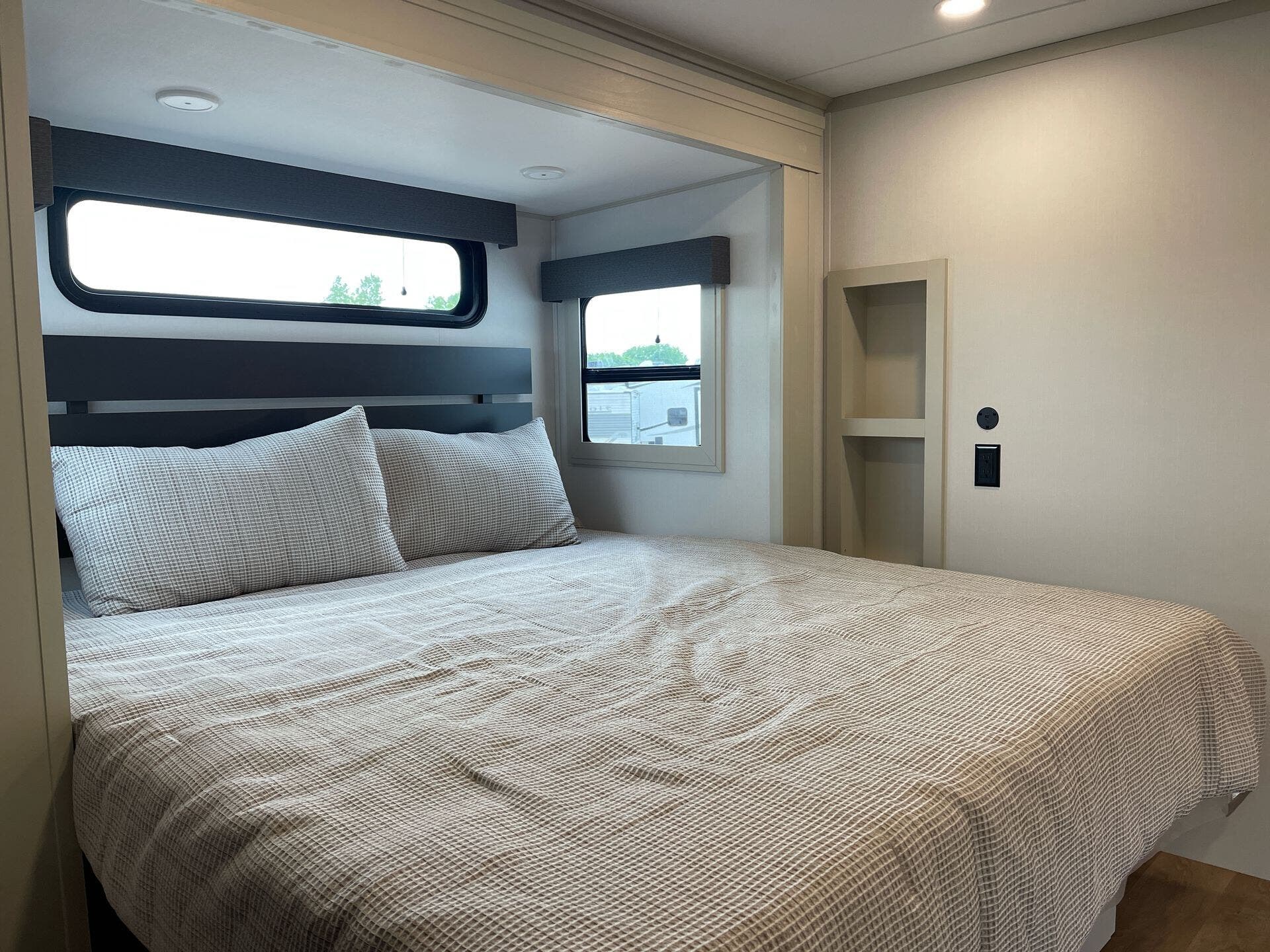 The kitchen is made for real cooking on the road, including a microwave, oven, and stove, along with solid surface countertops and a practical pantry. Cleanup is simple with washer/dryer prep, and you’ll appreciate the built-in comfort features that make daily routines effortless—whether you’re parked for a weekend or exploring for weeks.