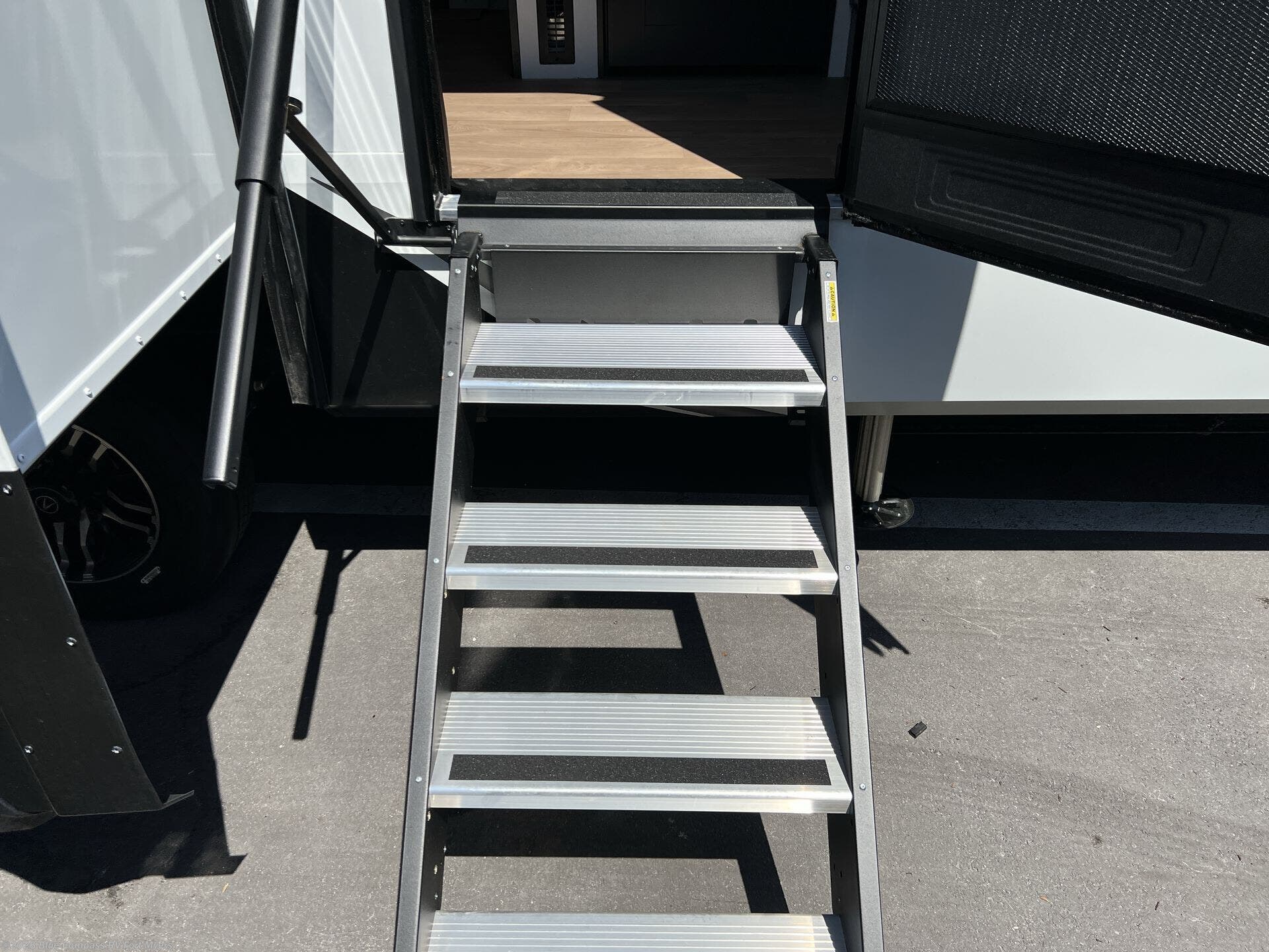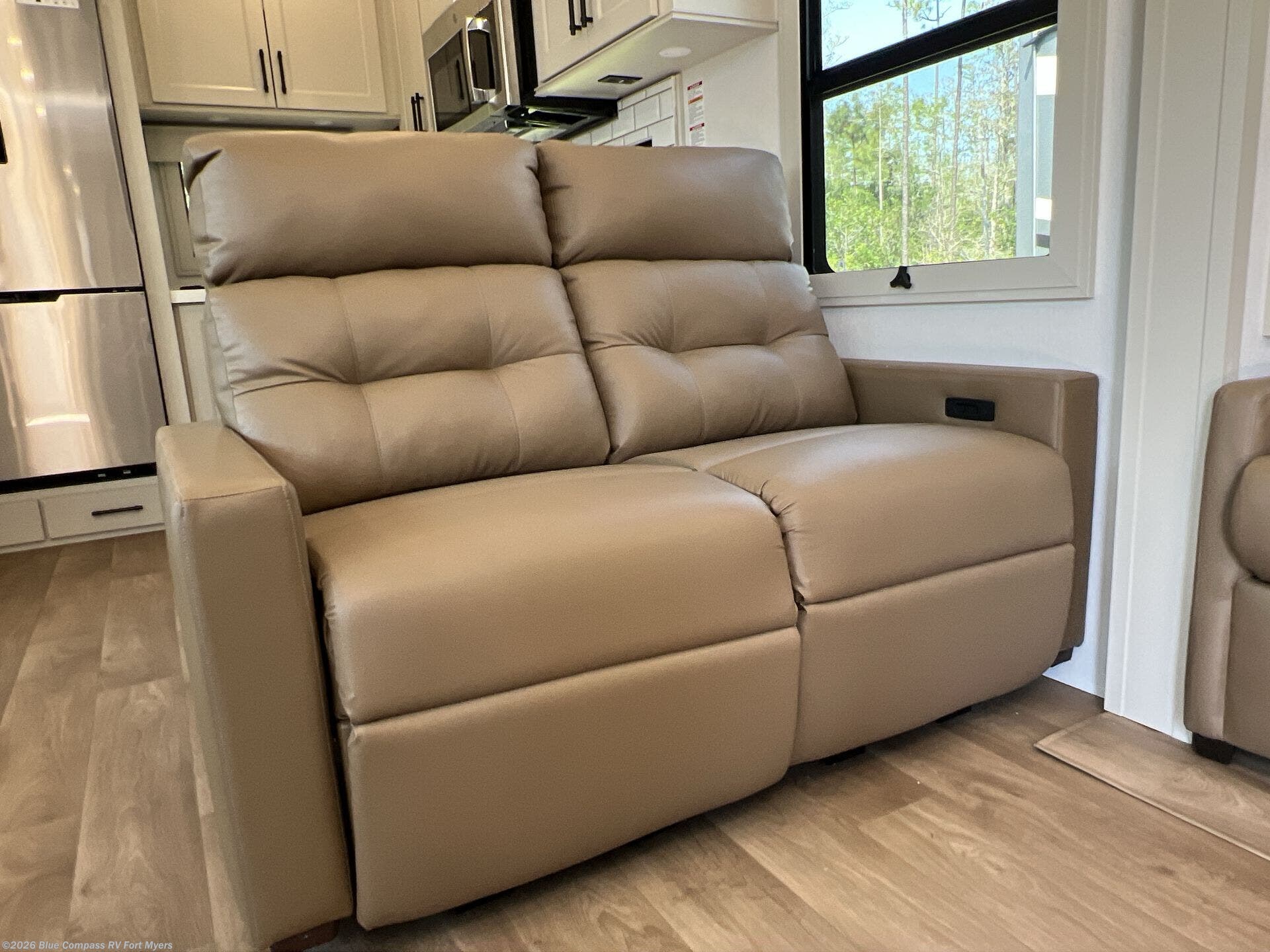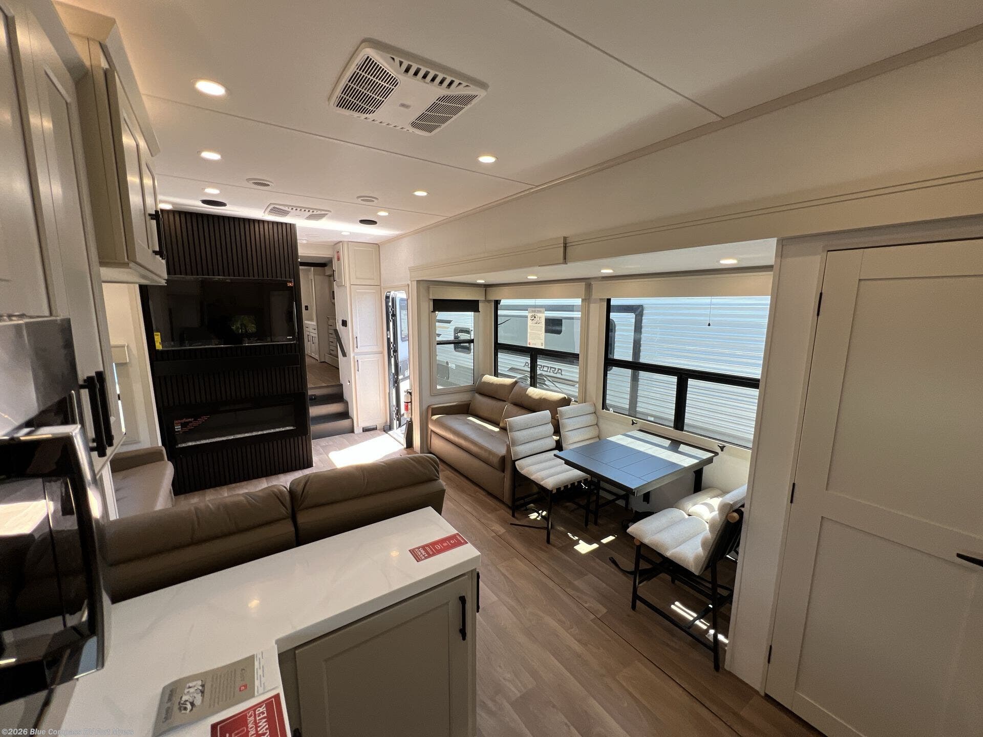 Comfort will come easy in this four slide out fifth wheel! You will feel right at home with a master bedroom that includes a queen bed slide out with a king bed option, dual dressers with a seat in between, plus a large front bath with tons of space. The convenient half bath is right as you enter the unit for convenience. Your crew can get cozy on the dual tri-fold sofas within dual opposing slides, or on the theater seating across from the LED TV and fireplace. One feature you will love about this fifth wheel is the rear kitchen with wrap-around counter space, a built-in oven, plus a 20 cu. ft. refrigerator and a large pantry to keep food fresh.