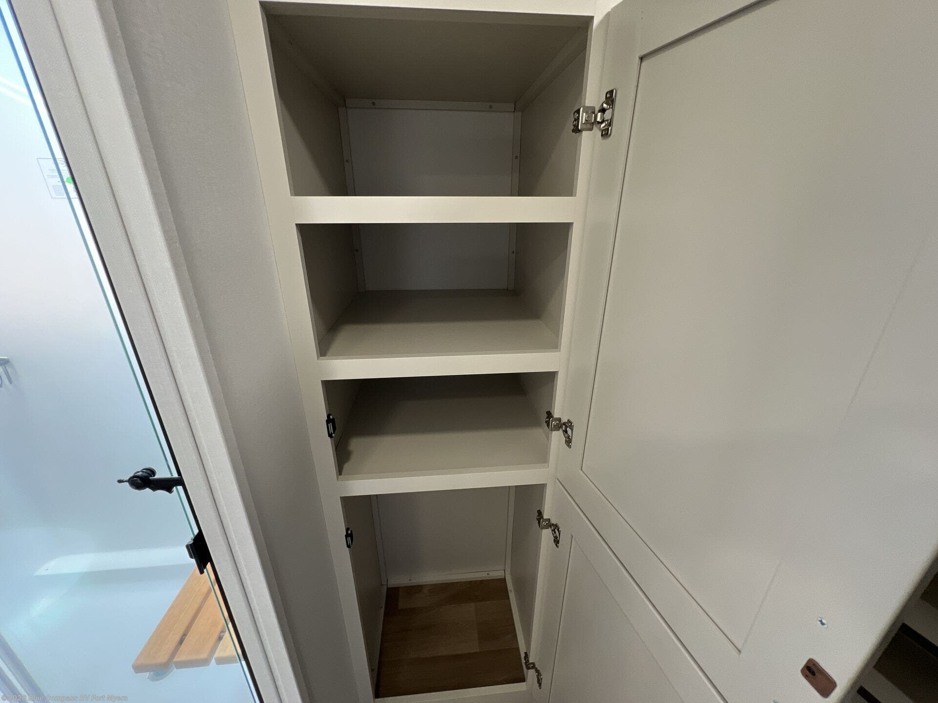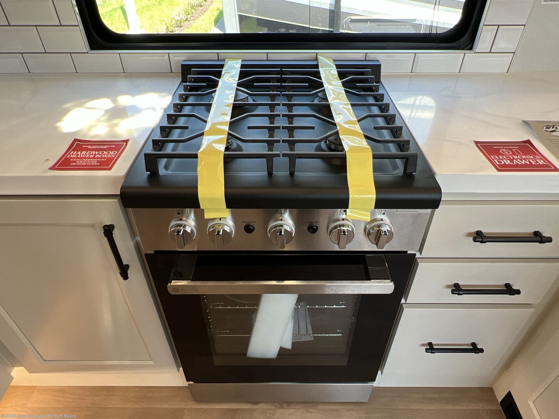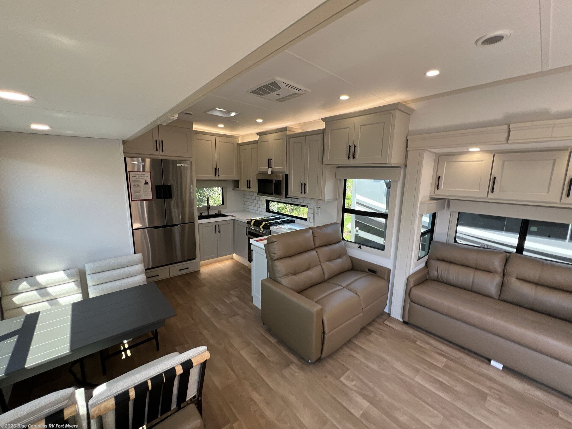 Comfort will come easy in this four slide out fifth wheel! You will feel right at home with a master bedroom that includes a queen bed slide out with a king bed option, dual dressers with a seat in between, plus a large front bath with tons of space. The convenient half bath is right as you enter the unit for convenience. Your crew can get cozy on the dual tri-fold sofas within dual opposing slides, or on the theater seating across from the LED TV and fireplace. One feature you will love about this fifth wheel is the rear kitchen with wrap-around counter space, a built-in oven, plus a 20 cu. ft. refrigerator and a large pantry to keep food fresh.