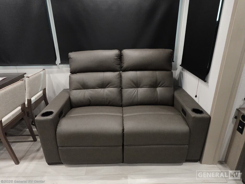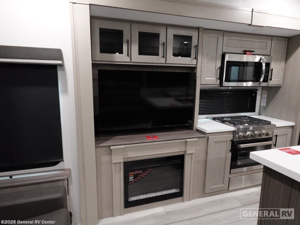 You'll feel right at home in this spacious fifth wheel with triple slides, a front master bedroom, and a kitchen island with extra counter space. The theatre seating is right across from the entertainment center which includes a 40" TV and fireplace, and there is a rear tri-fold sofa if you have any guests staying over. This model includes a hutch in the kitchen with cabinets above to store you nice dishes, plus there is a large pantry with washer and dryer prep if you plan to go full-time. Head to the dual entry bath that includes a linen closet and a spacious shower, and check out the front master bedroom with its queen bed, and slide out wardrobe.