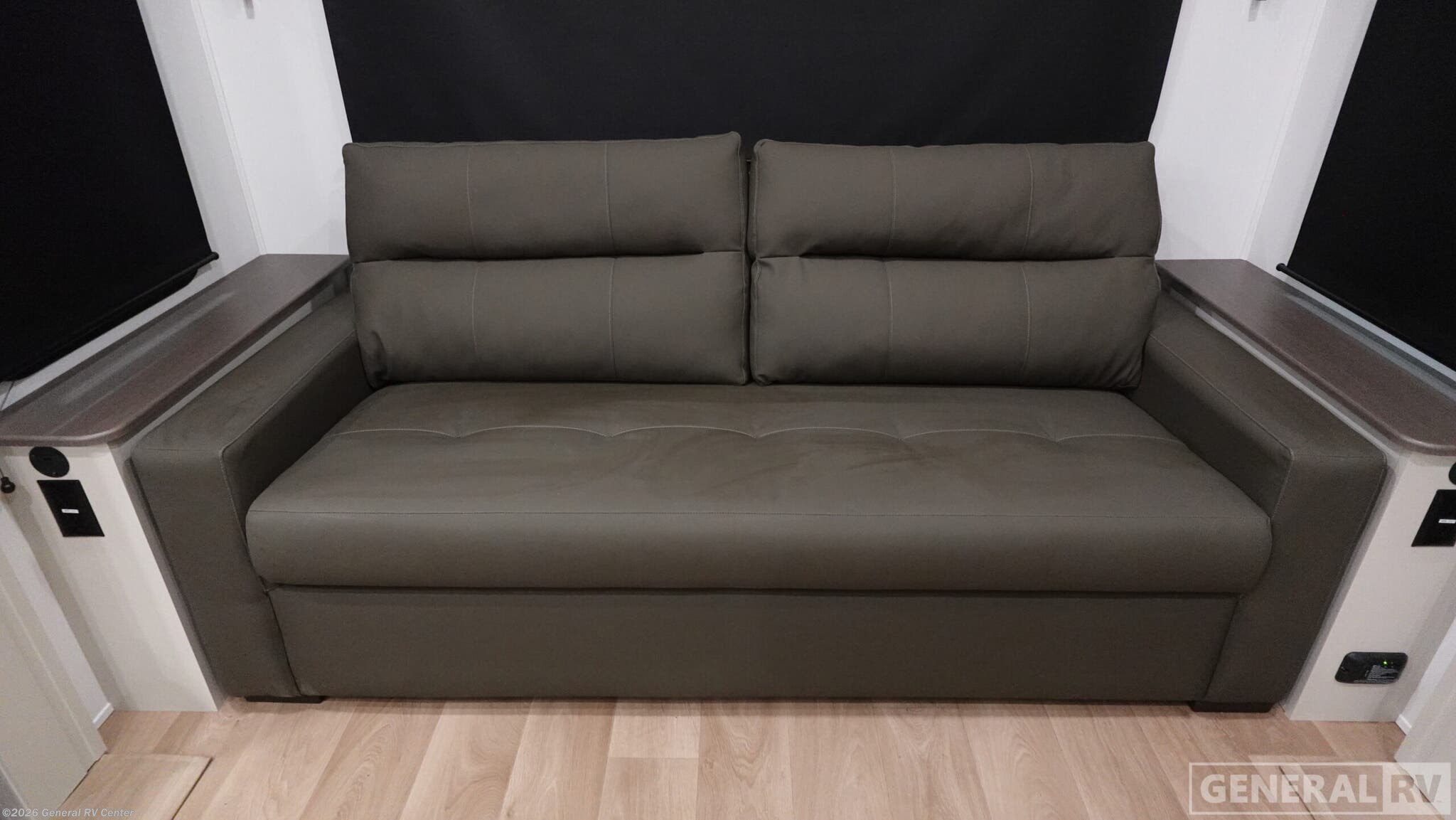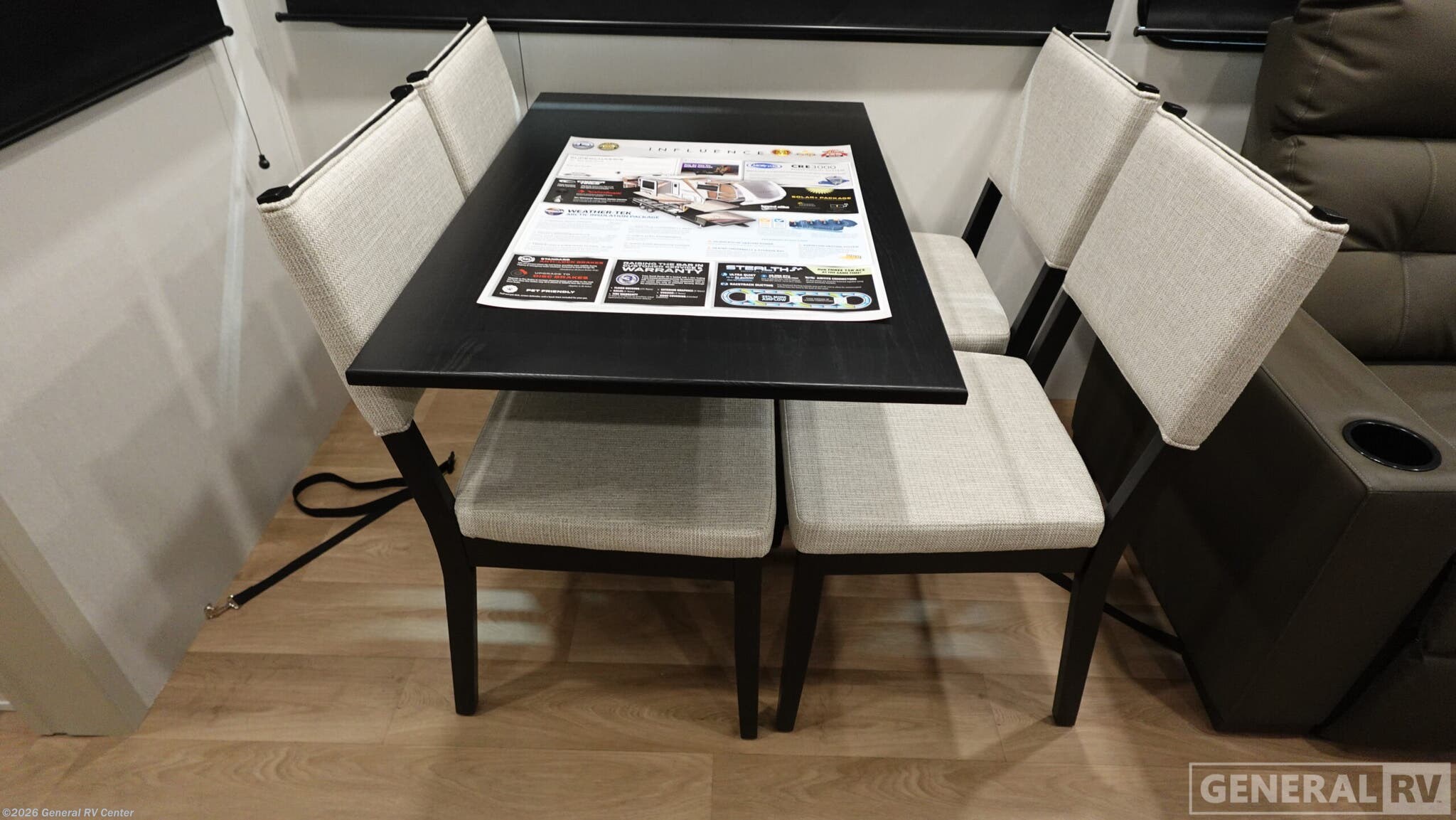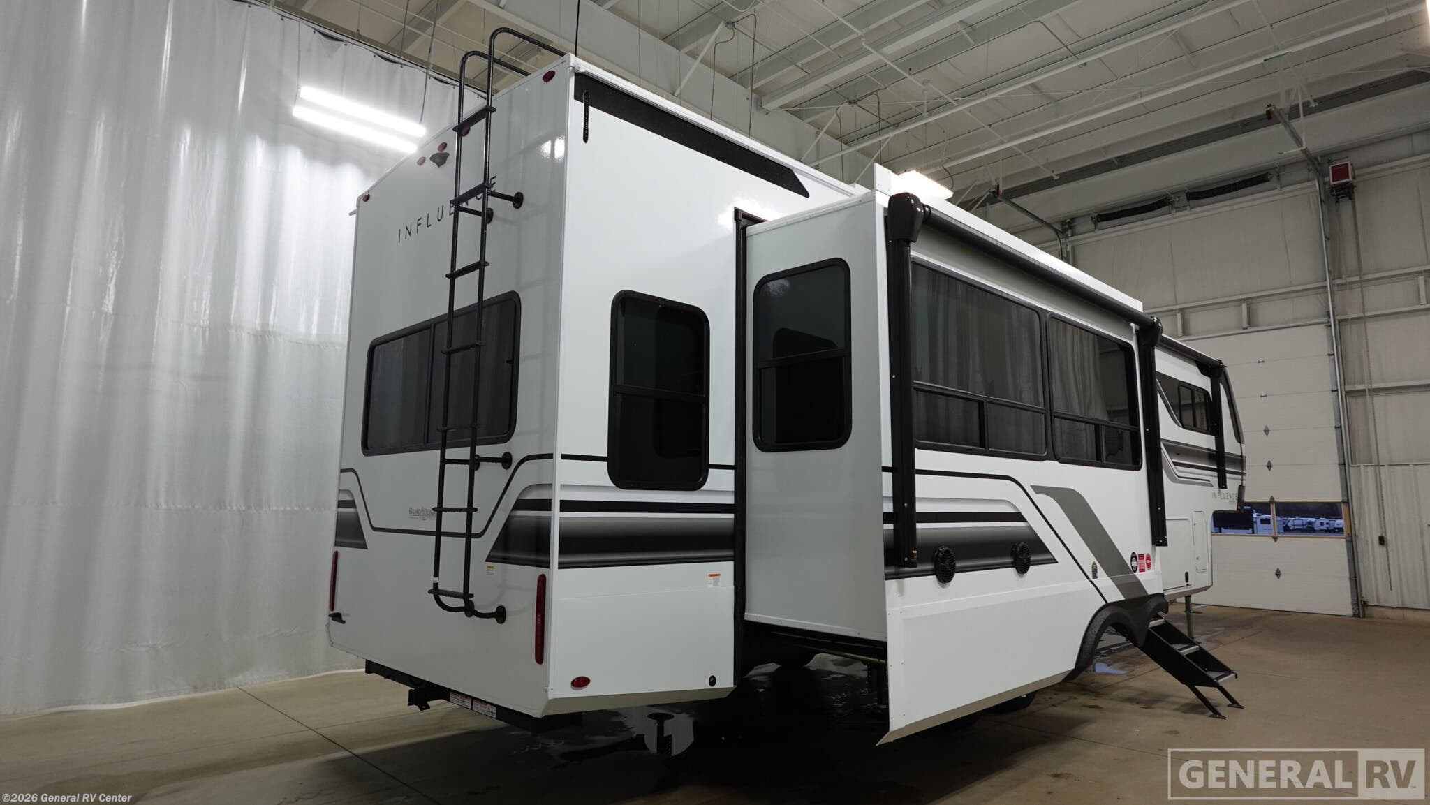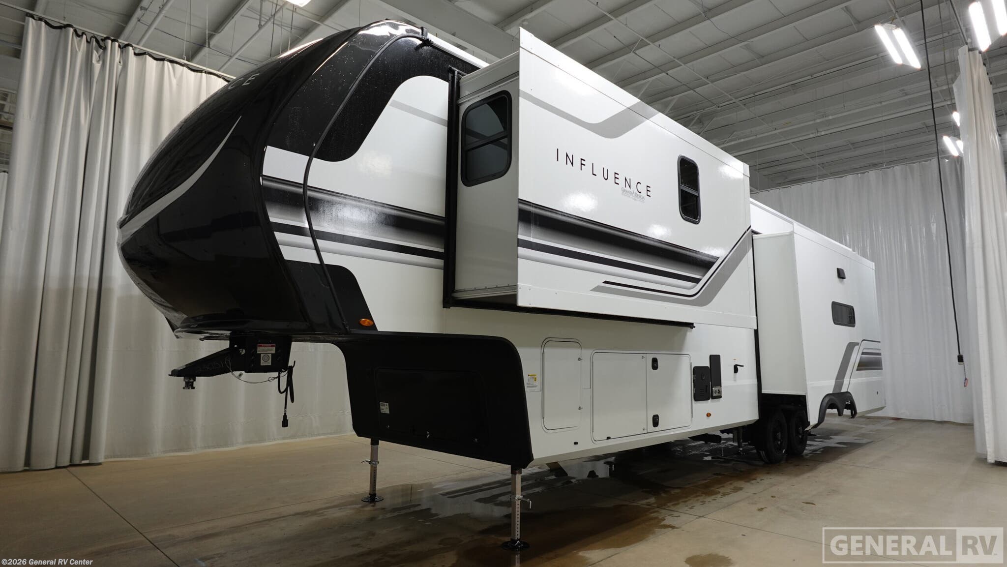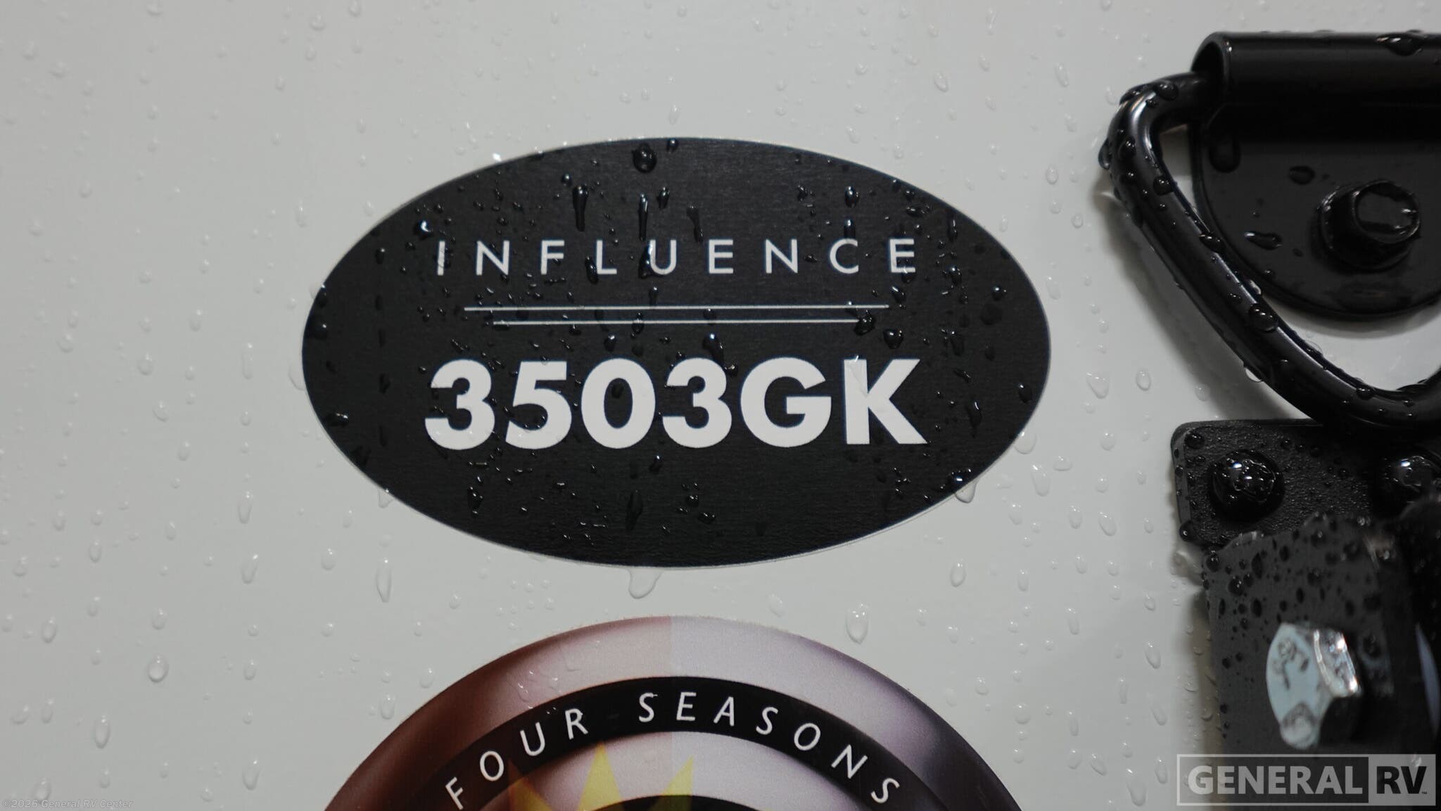 Grand Design Influence fifth wheel 3503GK highlights: Private Bedroom Fireplace Kitchen Island Free Standing Dinette Pass-Through Storage A perfect couples coach featuring triple slides and a tri-fold sofa just in case you want to have overnight guests! You will love the spacious interior thanks to the dual opposing slides in the main living and kitchen area. Here you will find a kitchen island in the center and plenty of seating with a free standing dinette, theater seating for movie night opposite the fireplace and entertainment center, as well as a tri-fold sofa. The kitchen offers all of the amenities just like home, a 16 cu. ft. 12-volt refrigerator for your perishables, and a pantry and hutch nearby for dry goods and dishes. There is even a pet dish under the refrigerator for your furry friends. The center island offers added counter space and a sink for dishes and prep work. Head up the steps to your private front bedroom with queen bed slide, and bathroom with dual entry. Any Grand Design Influence fifth wheel features five-sided aluminum cage construction with a walk-on roof and a fully enclosed underbelly with heated tanks and storage for all weather camping. For peace of mind, the MORryde CRE3000 Suspension system will provide safe and smooth towing, and the 101" widebody construction offers all the room you need and that is before multiple slides are fully engaged. You will appreciate the Keyed-Alike locks, slam-latch baggage doors with magnetic door catches, exterior security light, and SolidStep entry steps. On the inside, Congoleum flooring, premium roller shades for privacy, a hallway handrail for safety, and nightstands with USB ports to keep all of your electronics fully charged. You will also love the On Demand tankless water heater when showering, plus the added heat and ambiance from an electric fireplace, and so much more!