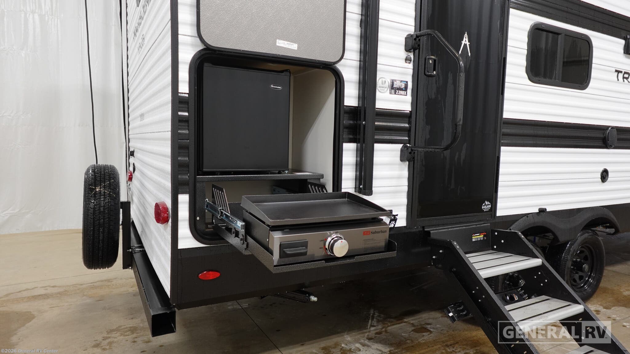 Grand Design Transcend Xplor travel trailer 22RBX highlights: Full Rear Bath Pull-Out Trash Can Exterior Griddle Front Private Bedroom Pack your bags and head for the campground in this spacious travel trailer! Once you arrive, you can unload the pass-thru storage, then make lunch on the exterior griddle with a 1.7 cu. ft. exterior refrigerator. You'll sleep soundly on the queen bed in the front bedroom, and the full rear bath lets you freshen up each day. The customer-focused, quality-built Transcend Xplor travel trailers by Grand Design are your ticket to fun and adventure. You will appreciate the power tongue jack when it comes time to set up, as well as the all-in-one utility center and the detachable power cord with an LED light. These models include many outlets throughout, USB ports to charge your gadgets, and a JBL exterior speaker to listen to your favorite tunes. The interior of the Transcend Xplor will have you feeling right at home with upgraded residential furniture, residential countertops, residential cabinet doors, and the list goes on!