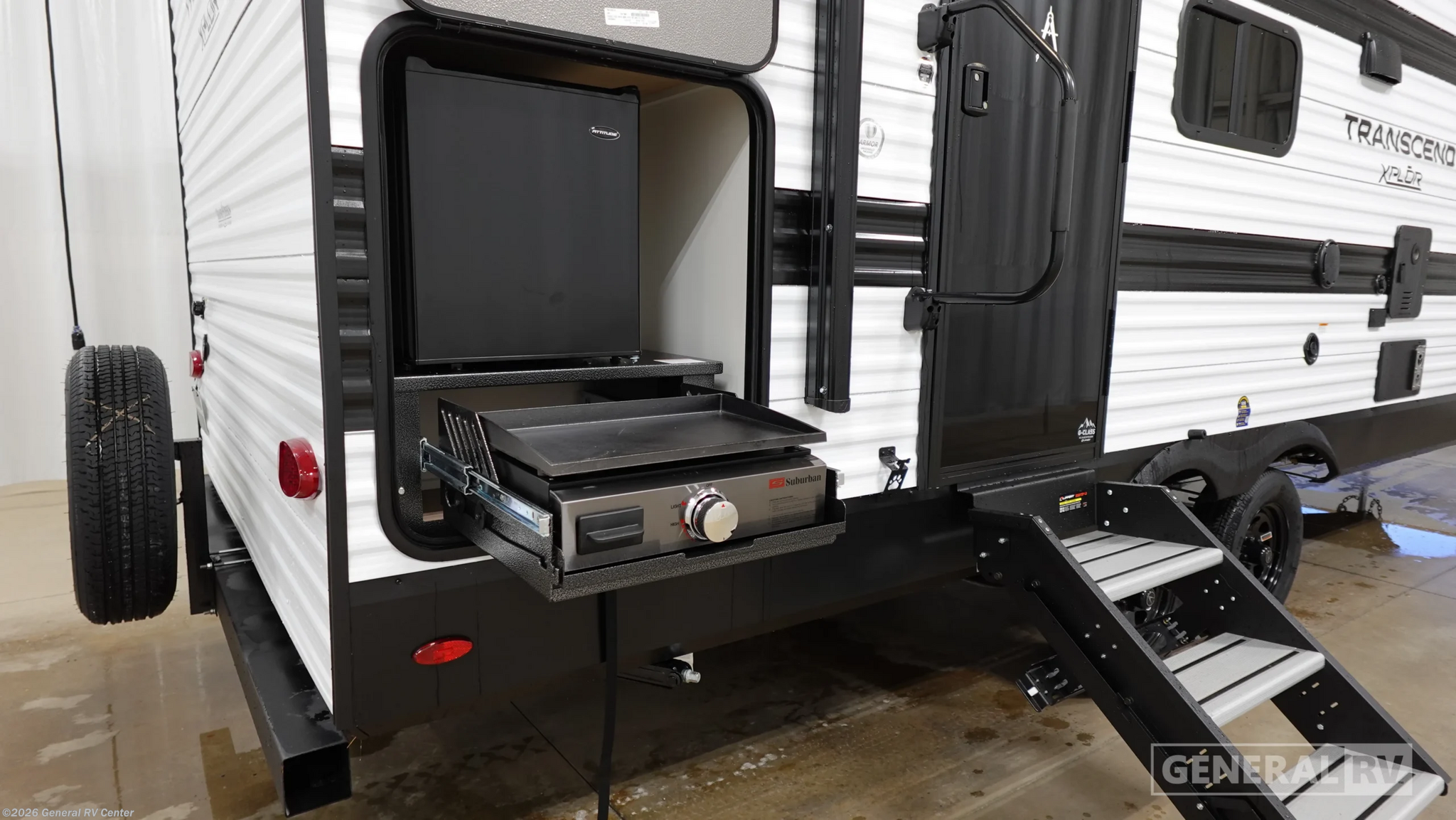 Grand Design Transcend Xplor travel trailer 22RBX highlights: Full Rear Bath Pull-Out Trash Can Exterior Griddle Front Private Bedroom Pack your bags and head for the campground in this spacious travel trailer! Once you arrive, you can unload the pass-thru storage, then make lunch on the exterior griddle with a 1.7 cu. ft. exterior refrigerator. The U-shaped dinette slide will provide a place to dine if you decide not to stay outside under the 16' power awning. You'll sleep soundly on the queen bed in the front bedroom, and the full rear bath lets you freshen up each day. The customer-focused, quality-built Transcend Xplor travel trailers by Grand Design are your ticket to fun and adventure. You will appreciate the power tongue jack when it comes time to set up, as well as the all-in-one utility center and the detachable power cord with an LED light. These models include many outlets throughout, USB ports to charge your gadgets, and a JBL exterior speaker to listen to your favorite tunes. The interior of the Transcend Xplor will have you feeling right at home with upgraded residential furniture, residential countertops, residential cabinet doors, and the list goes on!