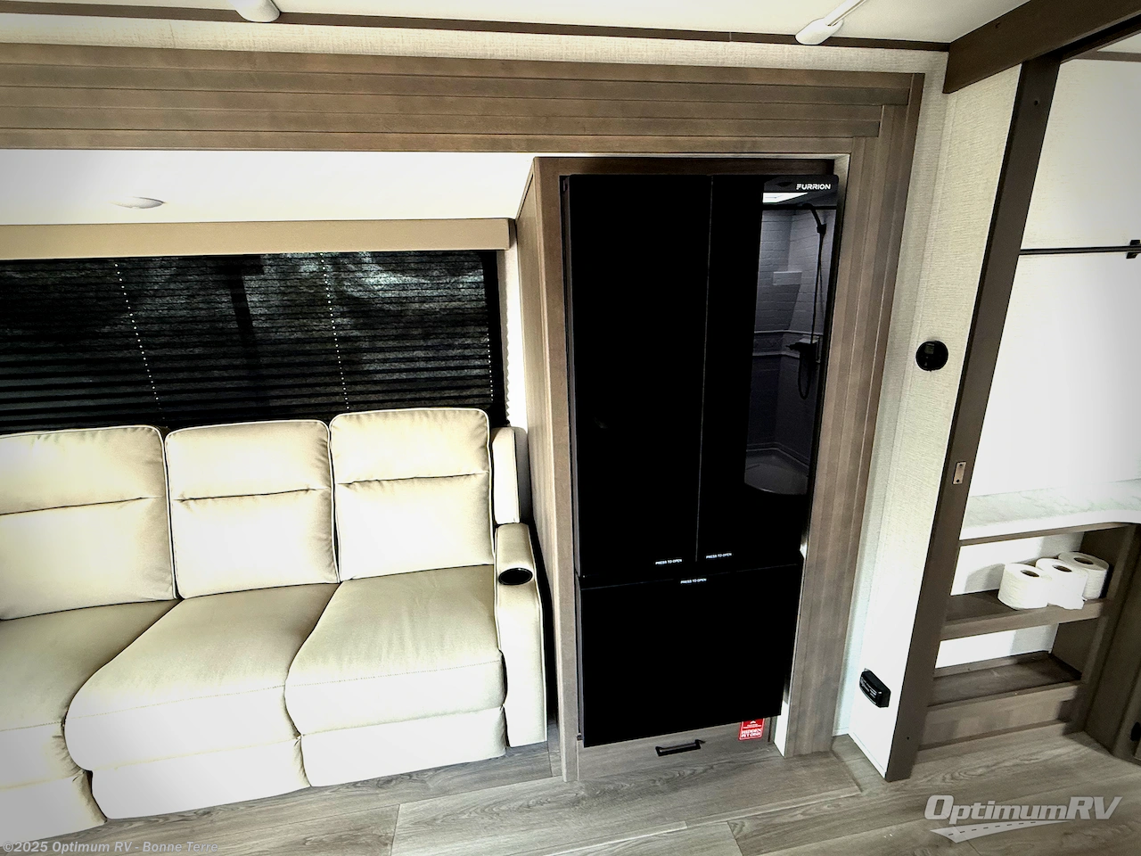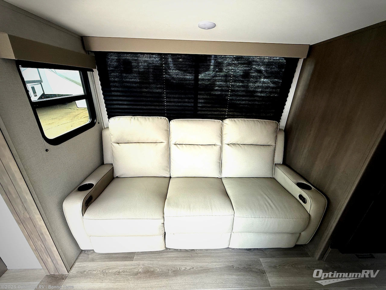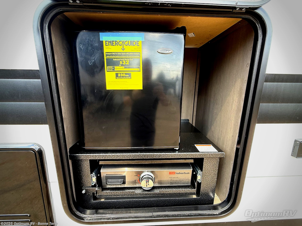 the amount of interior space you have in the living area thanks to the U-shaped dinette slide, which can be switched out for optional theater seats. The rear 70" sleeper sofa will be perfect for guests to sleep on, and the 32" TV lets you enjoy movie nights. There is a three burner range and convection microwave/combo air fryer to cook meals inside, or you can cook on the exterior griddle with a 1.7 cu. ft. refrigerator. And the 17' power awning will provide much wanted shade as you visit with friends. Back inside, the walk-thru bath is both spacious and convenient since it can be accessed from the main living area and the front master bedroom. Here, you'll find a queen bed, storage space, plus TV prep if you want to add a television. You even have your own exterior entry door for convenience!