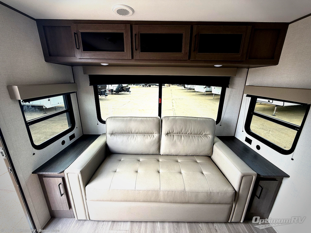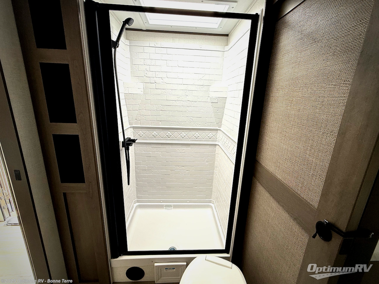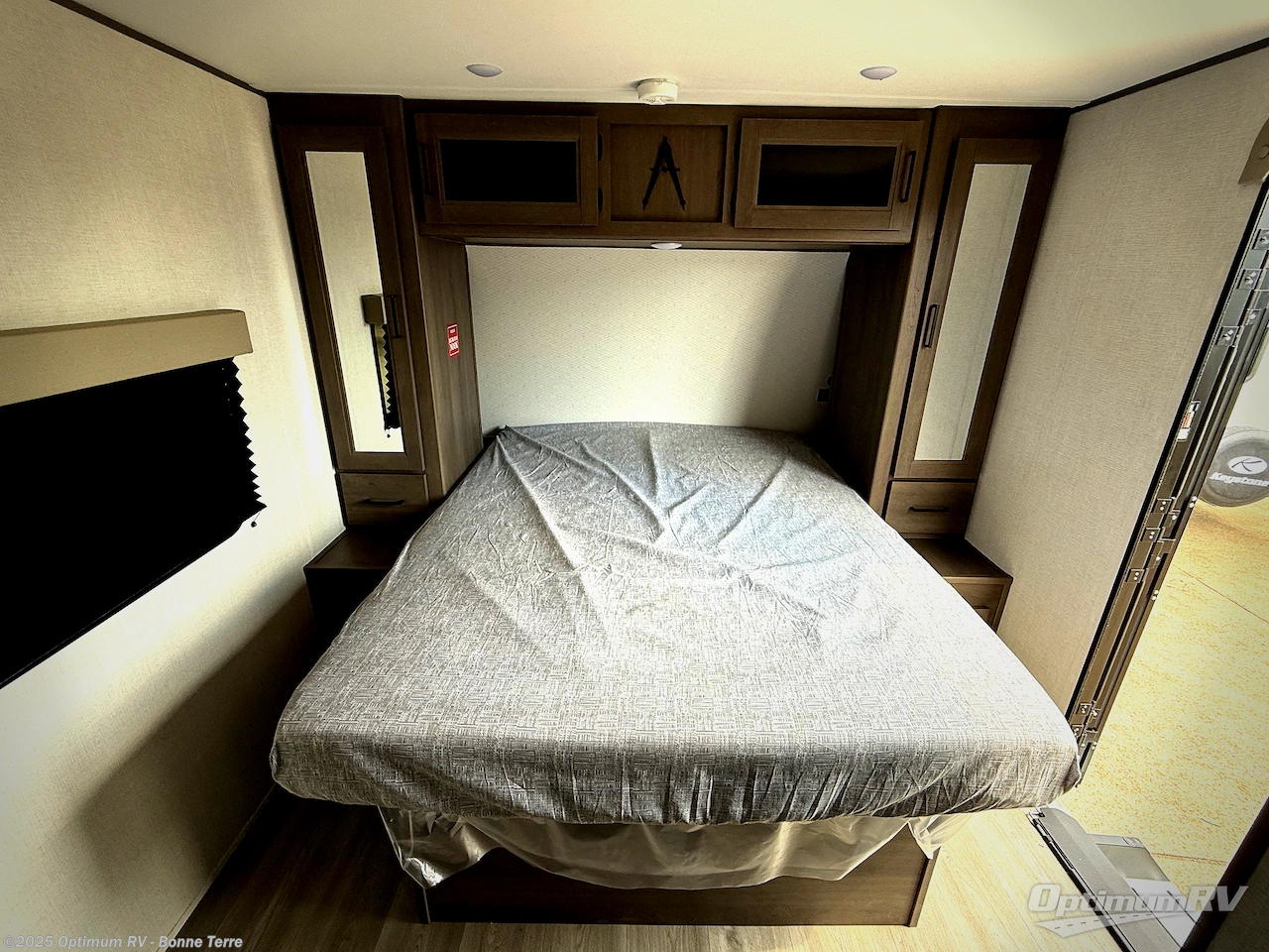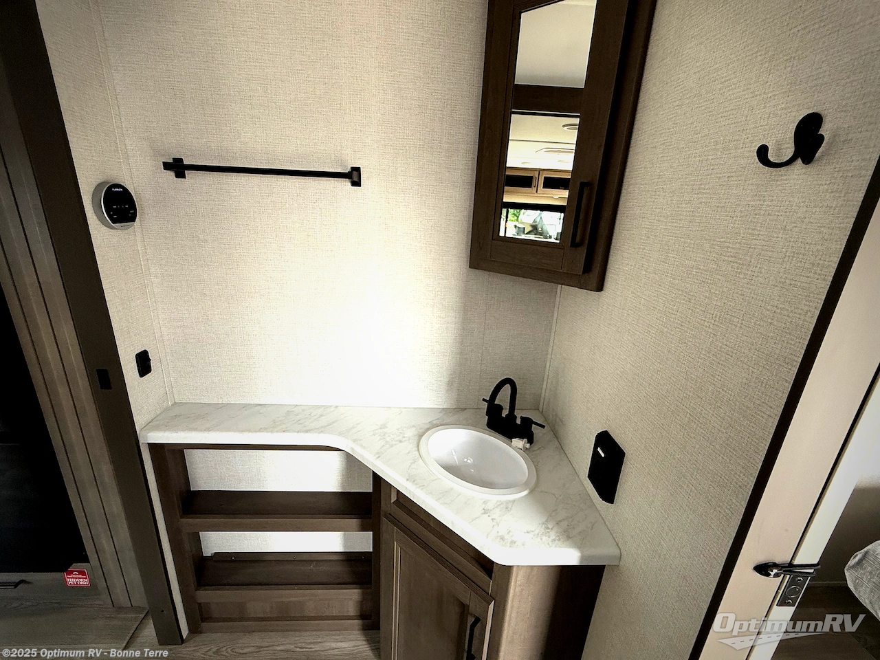 the amount of interior space you have in the living area thanks to the U-shaped dinette slide, which can be switched out for optional theater seats. The rear 70" sleeper sofa will be perfect for guests to sleep on, and the 32" TV lets you enjoy movie nights. There is a three burner range and convection microwave/combo air fryer to cook meals inside, or you can cook on the exterior griddle with a 1.7 cu. ft. refrigerator. And the 17' power awning will provide much wanted shade as you visit with friends. Back inside, the walk-thru bath is both spacious and convenient since it can be accessed from the main living area and the front master bedroom. Here, you'll find a queen bed, storage space, plus TV prep if you want to add a television. You even have your own exterior entry door for convenience!