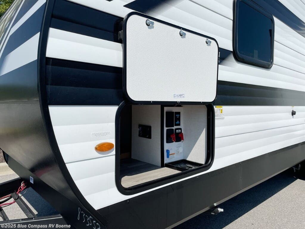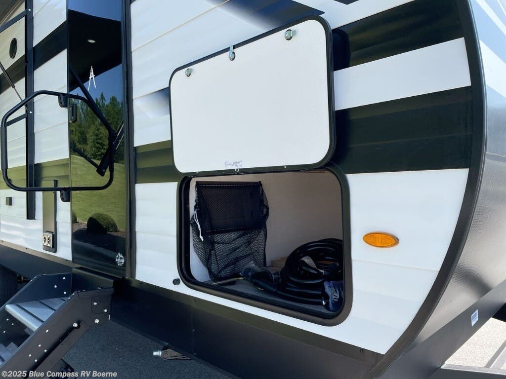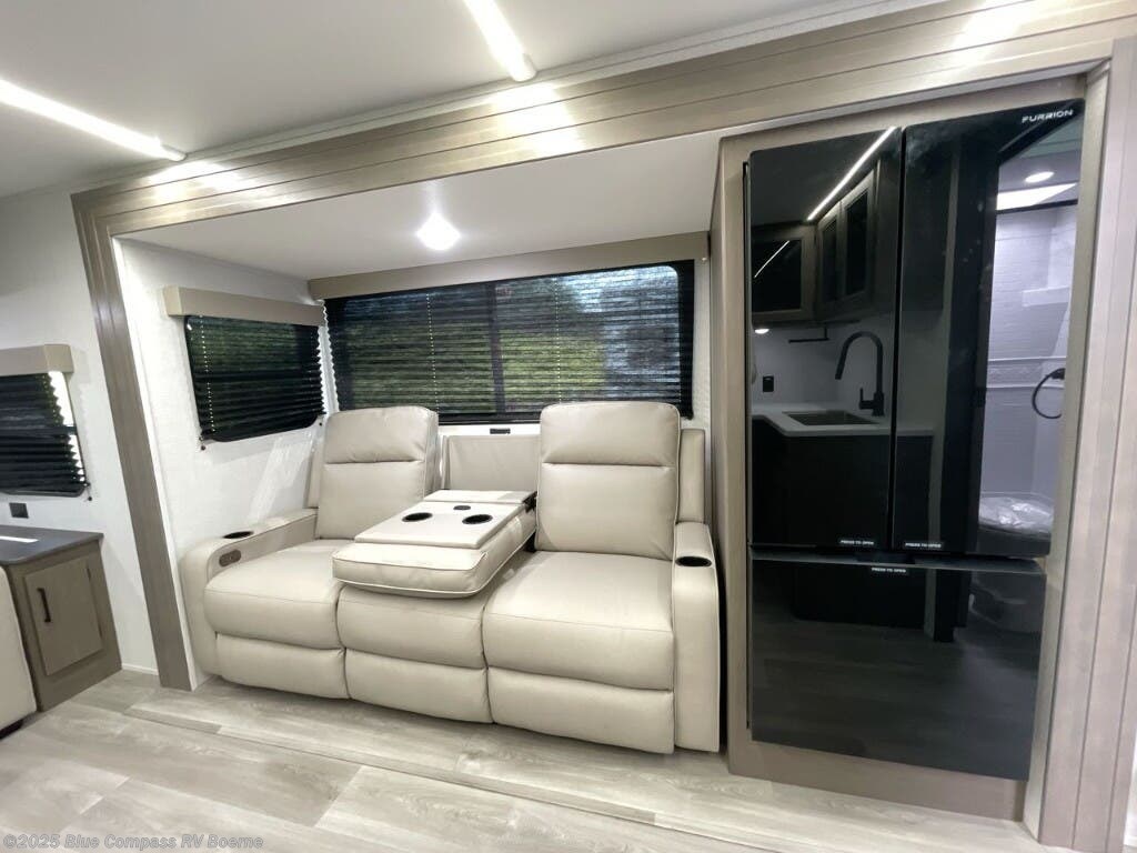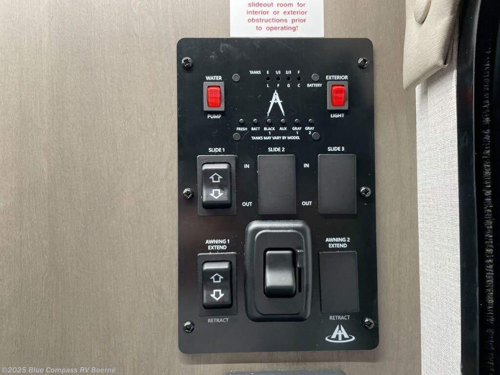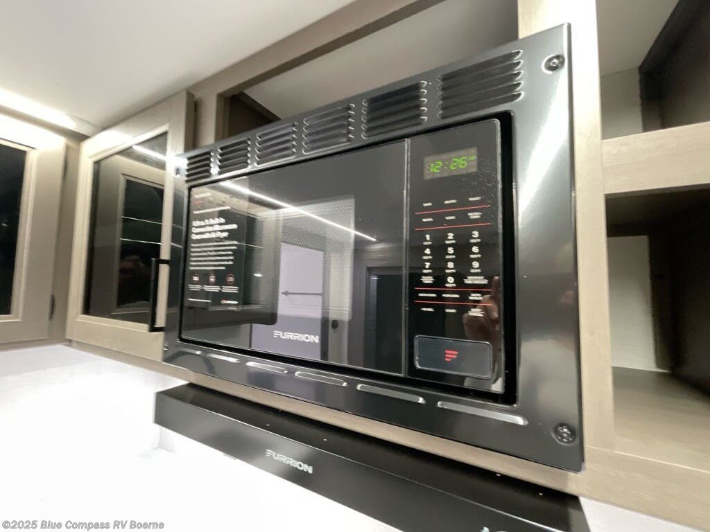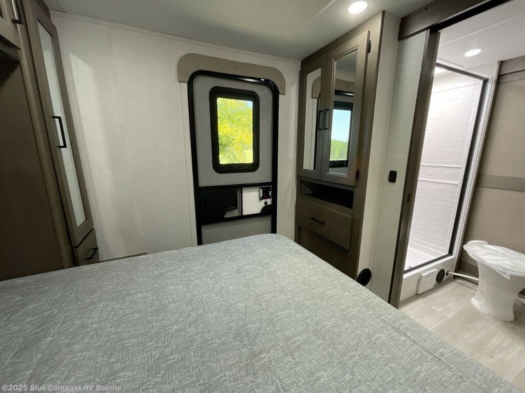 the amount of interior space you have in the living area thanks to the U-shaped dinette slide, which can be switched out for optional theater seats. The rear 70" sleeper sofa will be perfect for guests to sleep on, and the 32" TV lets you enjoy movie nights. There is a three burner range and convection microwave/combo air fryer to cook meals inside, or you can cook on the exterior griddle with a 1.7 cu. ft. refrigerator. And the 17' power awning will provide much wanted shade as you visit with friends. Back inside, the walk-thru bath is both spacious and convenient since it can be accessed from the main living area and the front master bedroom. Here, you'll find a queen bed, storage space, plus TV prep if you want to add a television. You even have your own exterior entry door for convenience!