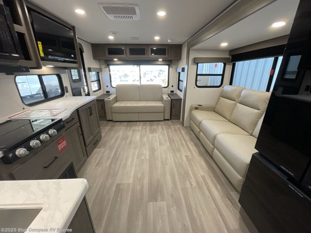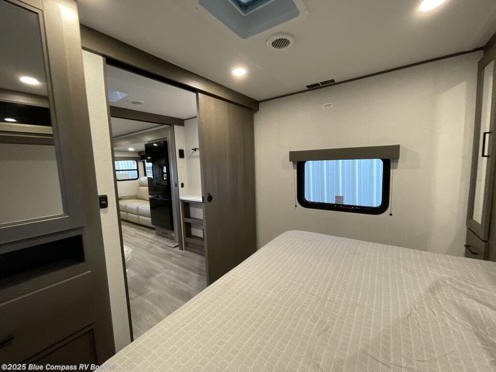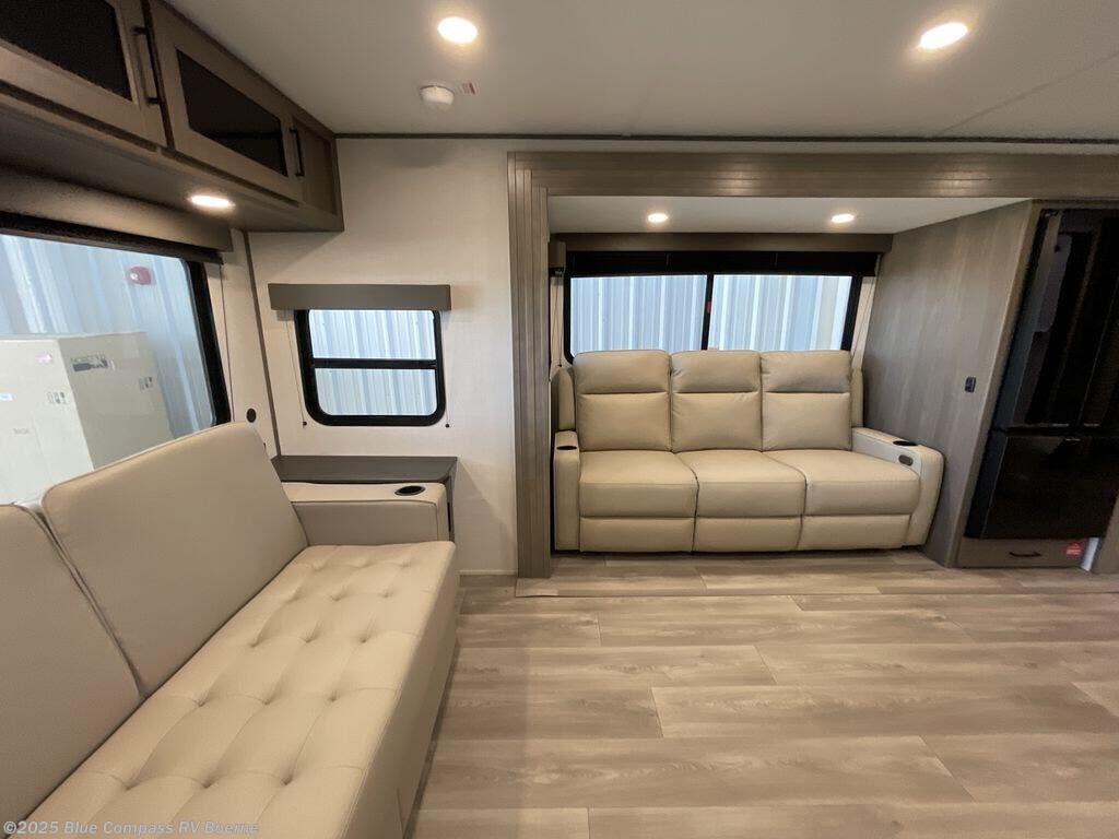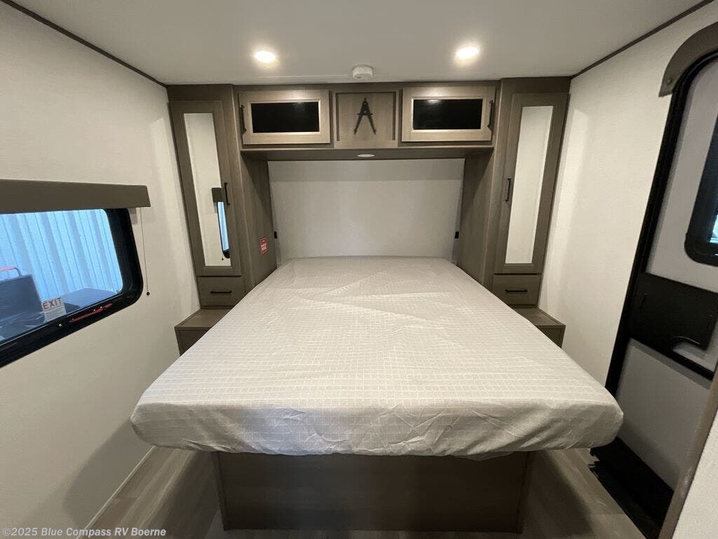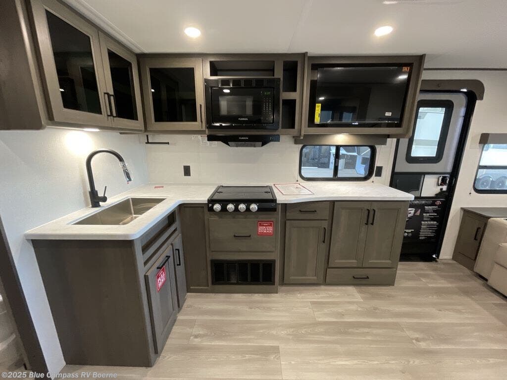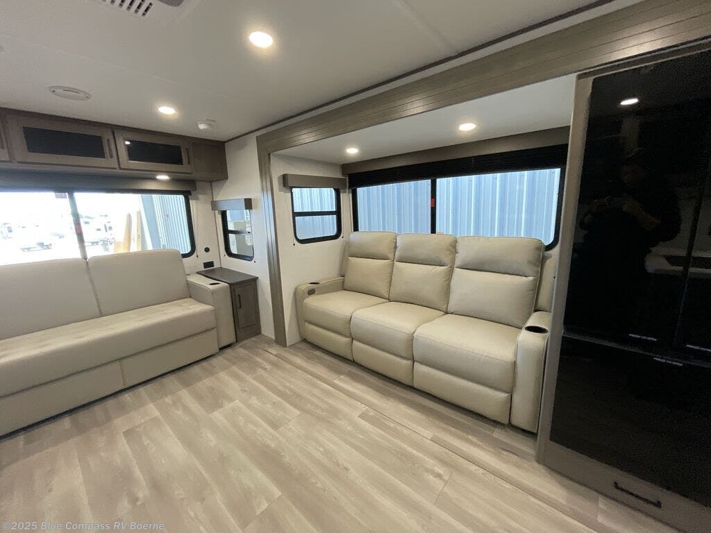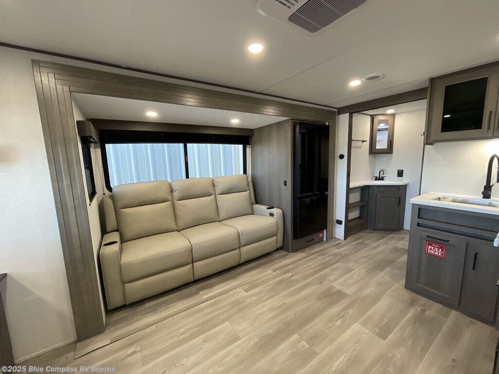 the amount of interior space you have in the living area thanks to the U-shaped dinette slide, which can be switched out for optional theater seats. The rear 70" sleeper sofa will be perfect for guests to sleep on, and the 32" TV lets you enjoy movie nights. There is a three burner range and convection microwave/combo air fryer to cook meals inside, or you can cook on the exterior griddle with a 1.7 cu. ft. refrigerator. And the 17' power awning will provide much wanted shade as you visit with friends. Back inside, the walk-thru bath is both spacious and convenient since it can be accessed from the main living area and the front master bedroom. Here, you'll find a queen bed, storage space, plus TV prep if you want to add a television. You even have your own exterior entry door for convenience!