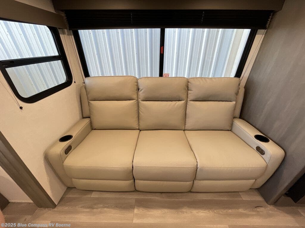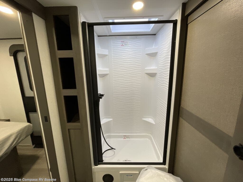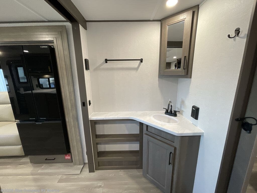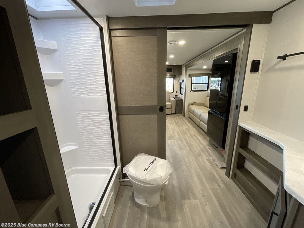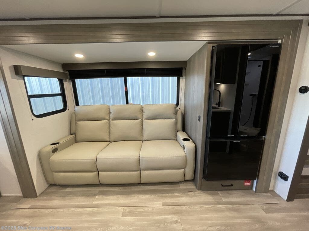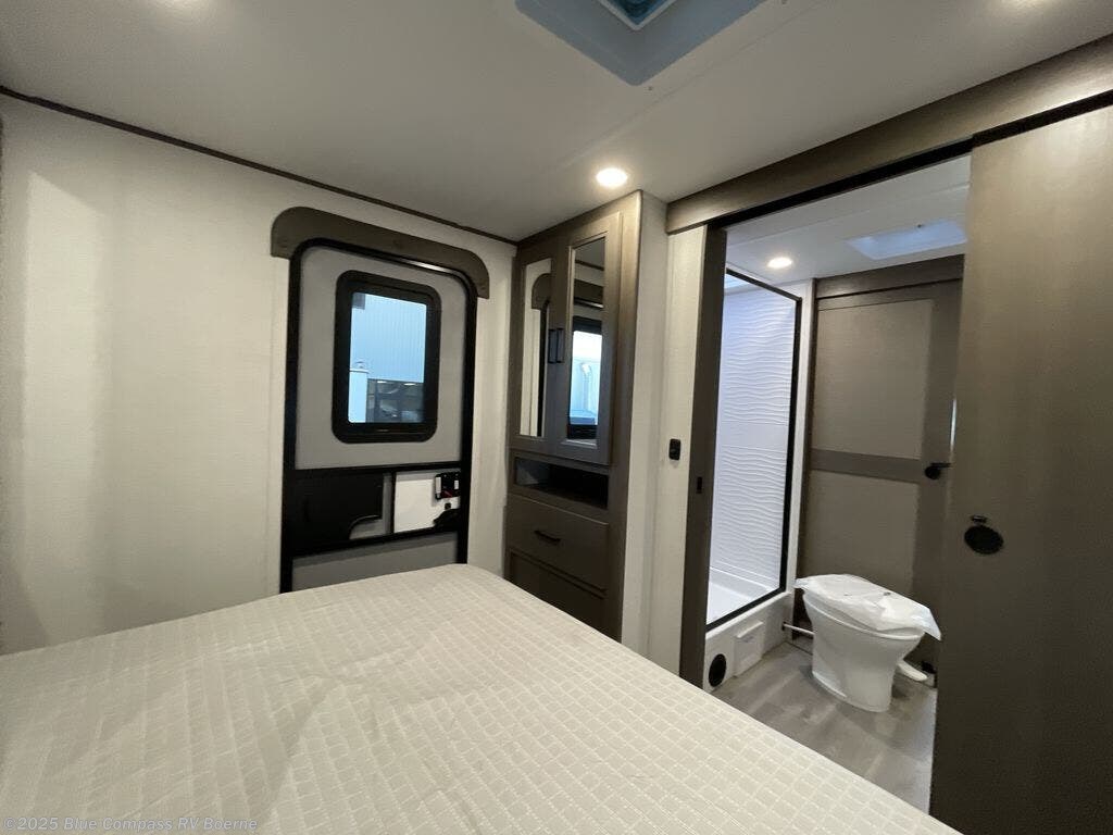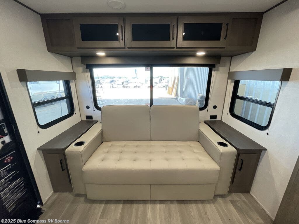 the amount of interior space you have in the living area thanks to the U-shaped dinette slide, which can be switched out for optional theater seats. The rear 70" sleeper sofa will be perfect for guests to sleep on, and the 32" TV lets you enjoy movie nights. There is a three burner range and convection microwave/combo air fryer to cook meals inside, or you can cook on the exterior griddle with a 1.7 cu. ft. refrigerator. And the 17' power awning will provide much wanted shade as you visit with friends. Back inside, the walk-thru bath is both spacious and convenient since it can be accessed from the main living area and the front master bedroom. Here, you'll find a queen bed, storage space, plus TV prep if you want to add a television. You even have your own exterior entry door for convenience!