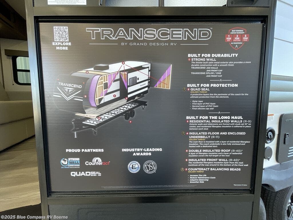 With any Transcend travel trailer by Grand Design, you will enjoy upscale appointments and convenient amenities to make each camping experience one to remember! The Quad Seal technology, residential insulated walls, plus heated and enclosed underbelly with suspended tanks make these units solid and durable. There is a black automotive glass door outside, along with a Safe-T-Rail assist on the main entry door, backup camera prep, and a universal docking station. JBL interior and exterior speakers plus a JBL head unit will let you listen to your favorite tunes as you visit under the power awning with LED strip lights. Inside, you'll enjoy multiple outlets to keep your gadgets charged, thermoformed and seamless countertops, and a 6' 6" interior height so you won't feel closed in. The Solar Prep Package will allow you to enjoy off-grid capabilities with a 200W solar panel, which is wired for up to 600W, a 30 AMP Bluetooth solar controller, a 2000W inverter prep, and more!