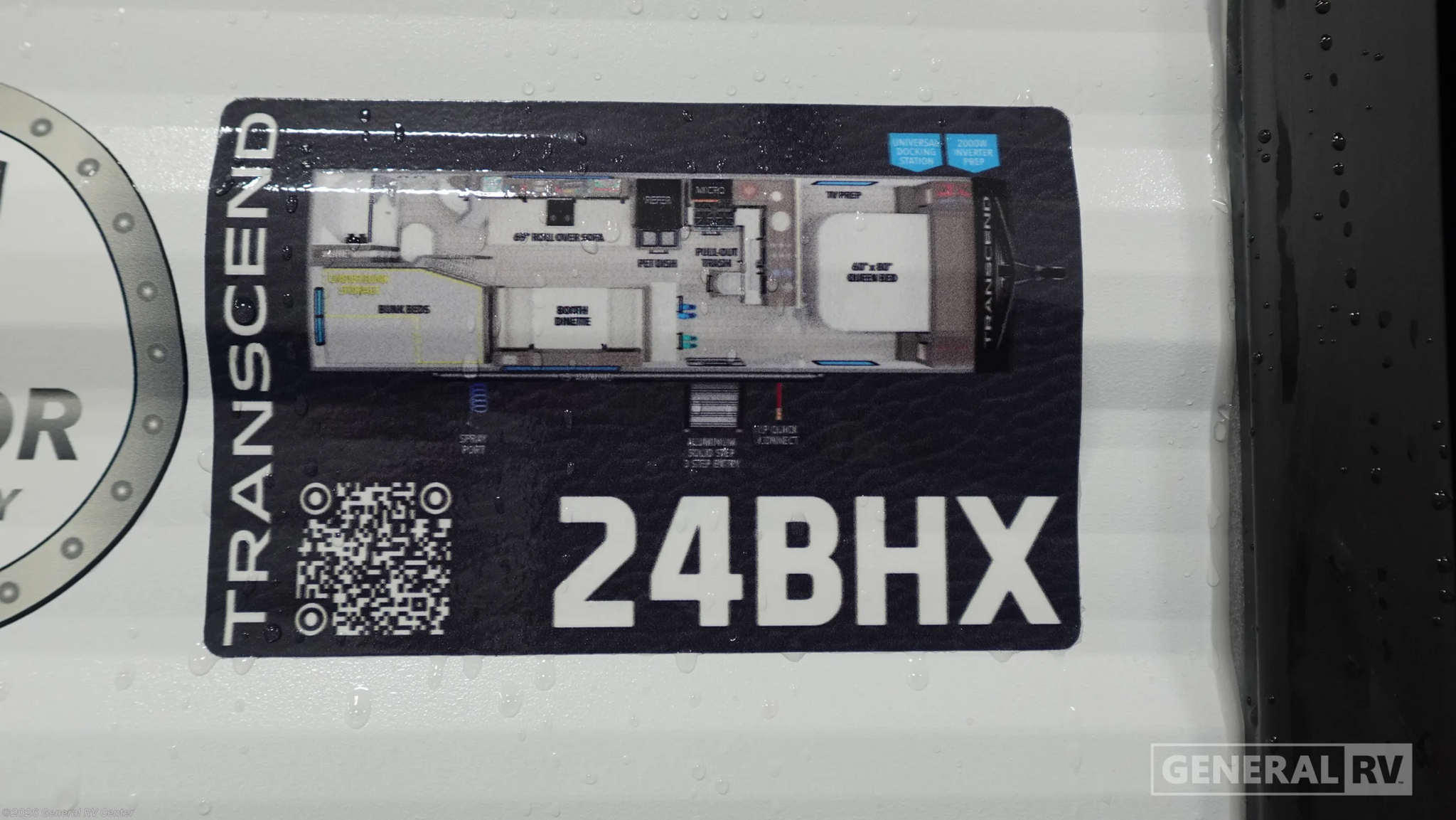 Grand Design Transcend Xplor travel trailer 24BHX highlights: 69" Rollover Sofa Pet Dish 15' Power Awning with LED Light Double-Size Bunks with Curtains This is the perfect travel trailer if you like to camp with friends and family. Since there are double-size bunks, a queen bed in the front bedroom, plus a booth dinette and sofa, you can sleep eight campers each night! The three burner range and microwave in the kitchen will let you cook meals each day, and the 12V refrigerator will keep your cold items fresh. This model also includes a counter with extra storage underneath, a pull-out trash can storage for convenience, and a full bath to freshen up in each day. And you'll love having your own space in the front bedroom with a privacy curtain, dual wardrobes, and TV prep if you want to add a television! The customer-focused, quality-built Transcend Xplor travel trailers by Grand Design are your ticket to fun and adventure. You will appreciate the power tongue jack when it comes time to set up, as well as the all-in-one utility center and the detachable power cord with an LED light. These models include many outlets throughout, USB ports to charge your gadgets, and a JBL exterior speaker to listen to your favorite tunes. The interior of the Transcend Xplor will have you feeling right at home with upgraded residential furniture, residential countertops, residential cabinet doors, and the list goes on!