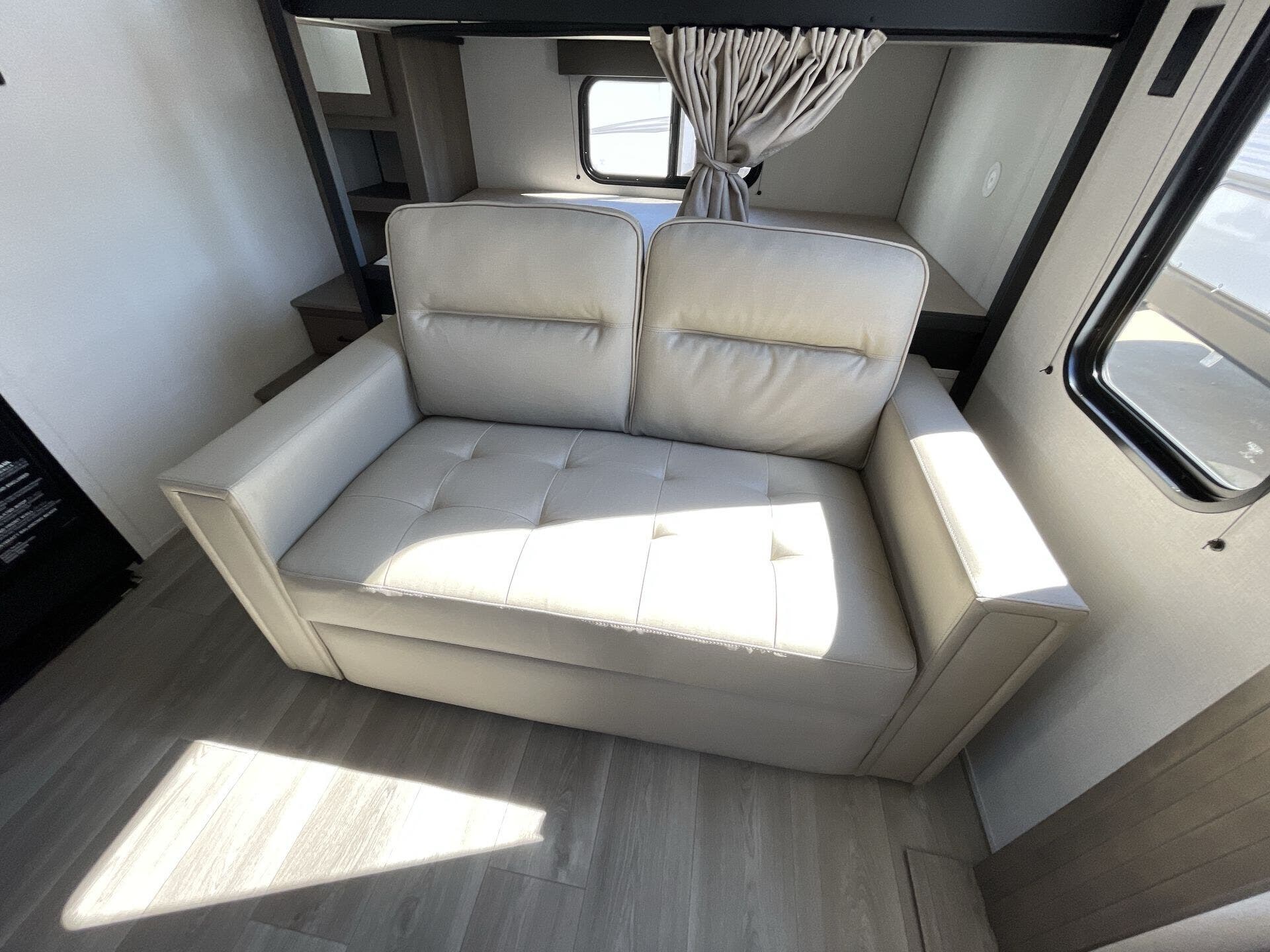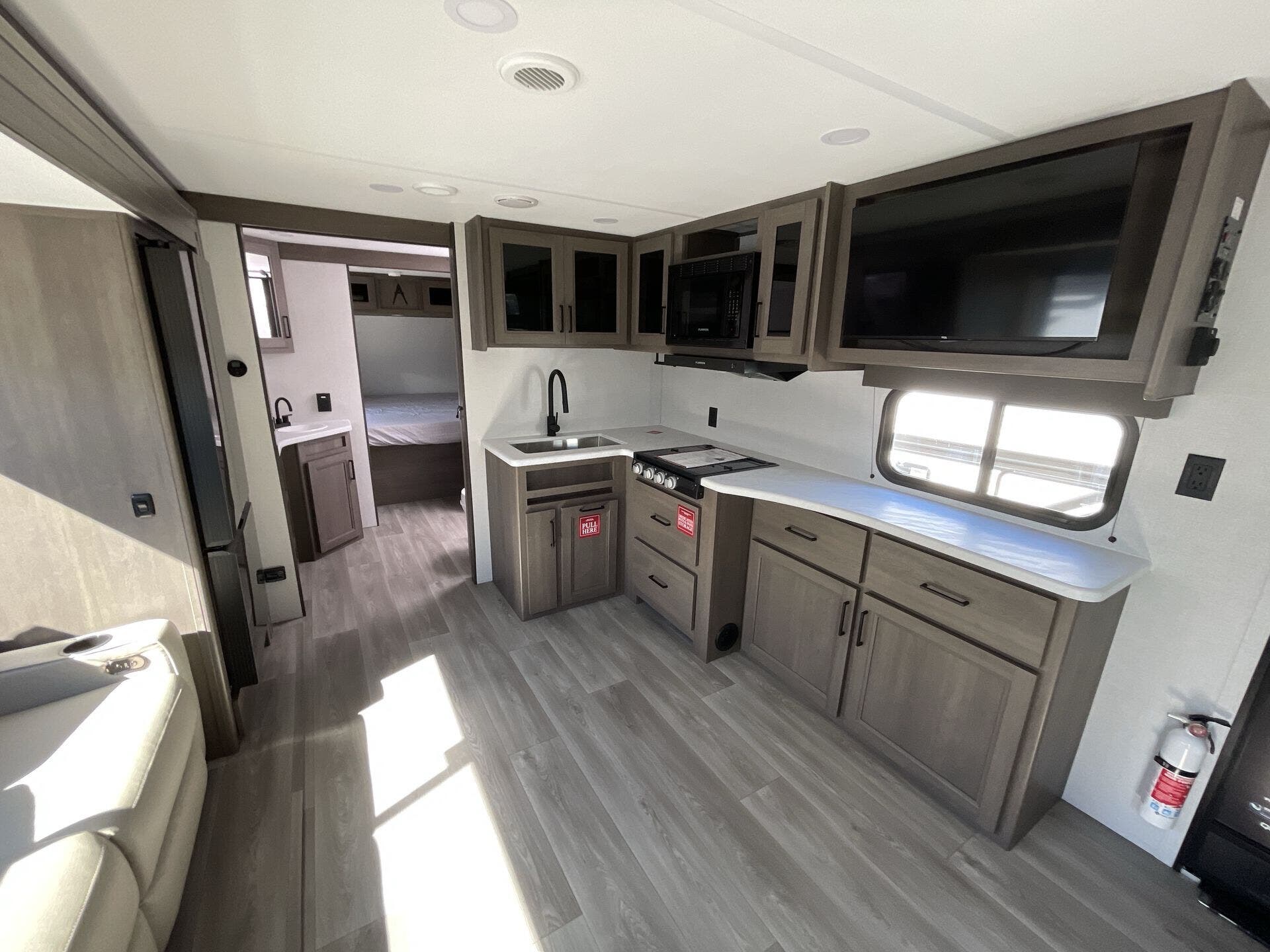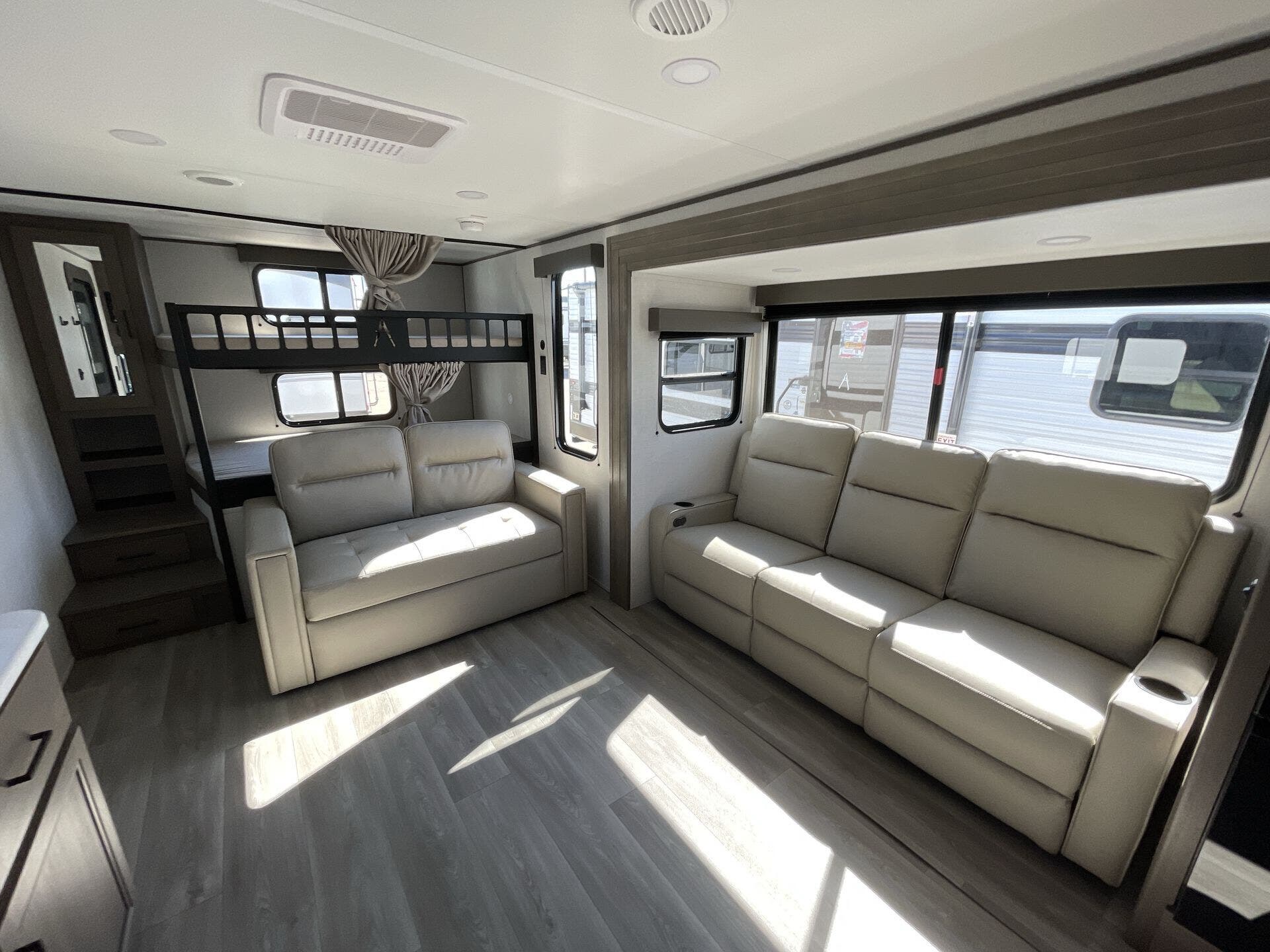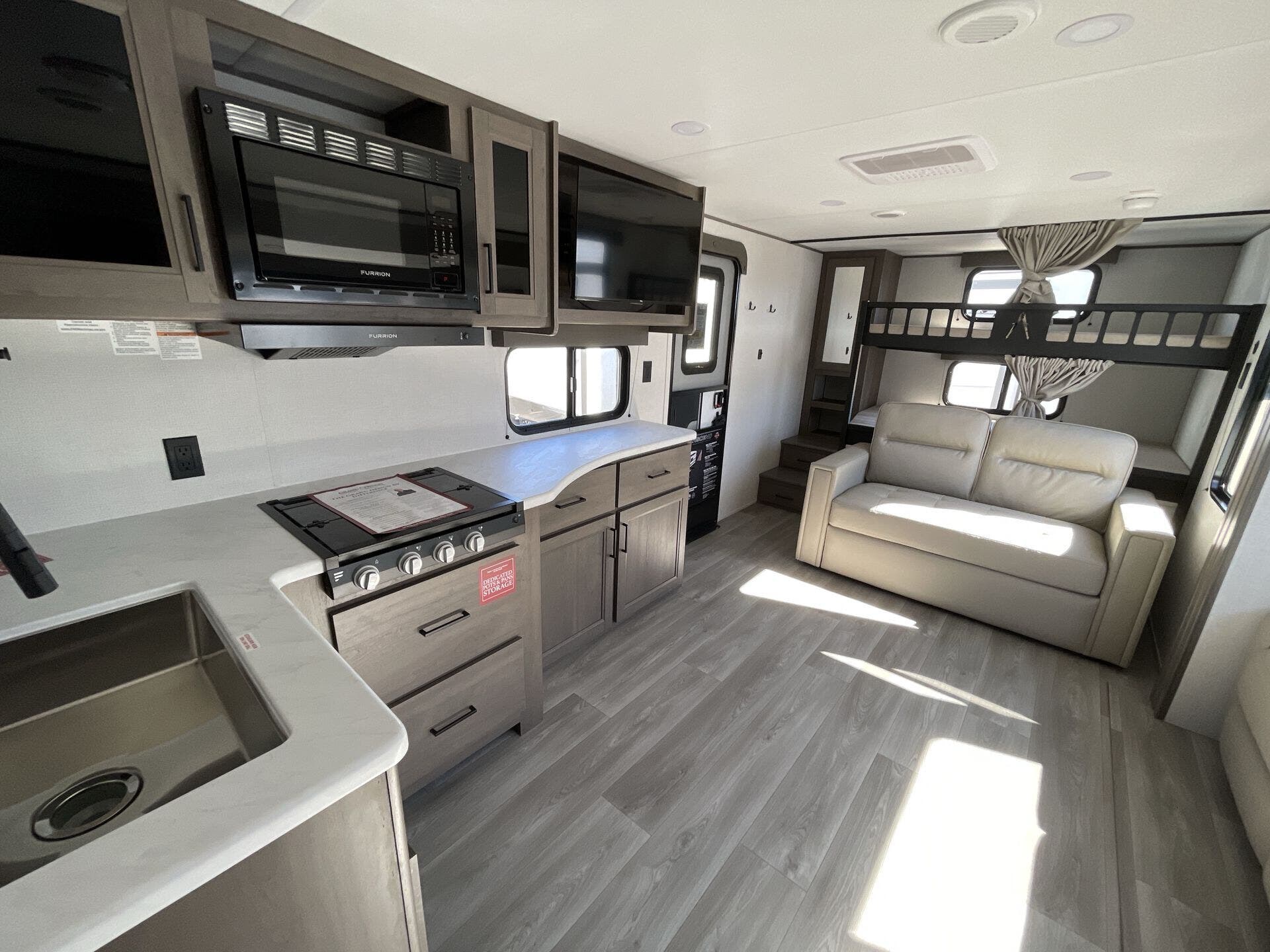 Inside, the Transcend 265BHT welcomes you with a spacious, family-friendly layout designed for relaxation and connection. The private front bedroom features a queen bed with generous storage, while the rear double-over-double bunks give kids or guests plenty of space to unwind. The large slide-out expands the living area to create an open, inviting space complete with a cozy sofa, U-shaped dinette, and an entertainment center that’s perfect for movie nights. The kitchen is fully equipped with stainless steel appliances, a deep farmhouse sink, and ample counter space to make cooking on the road a joy.