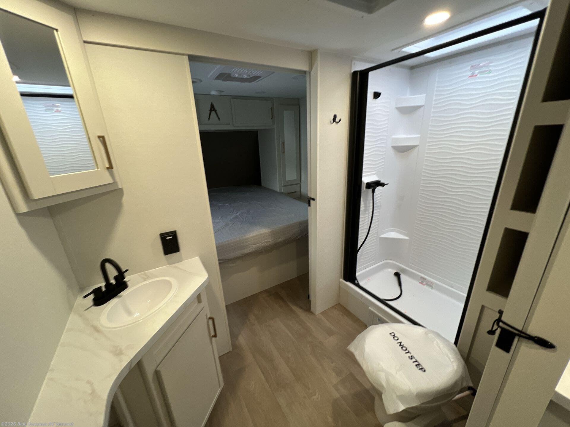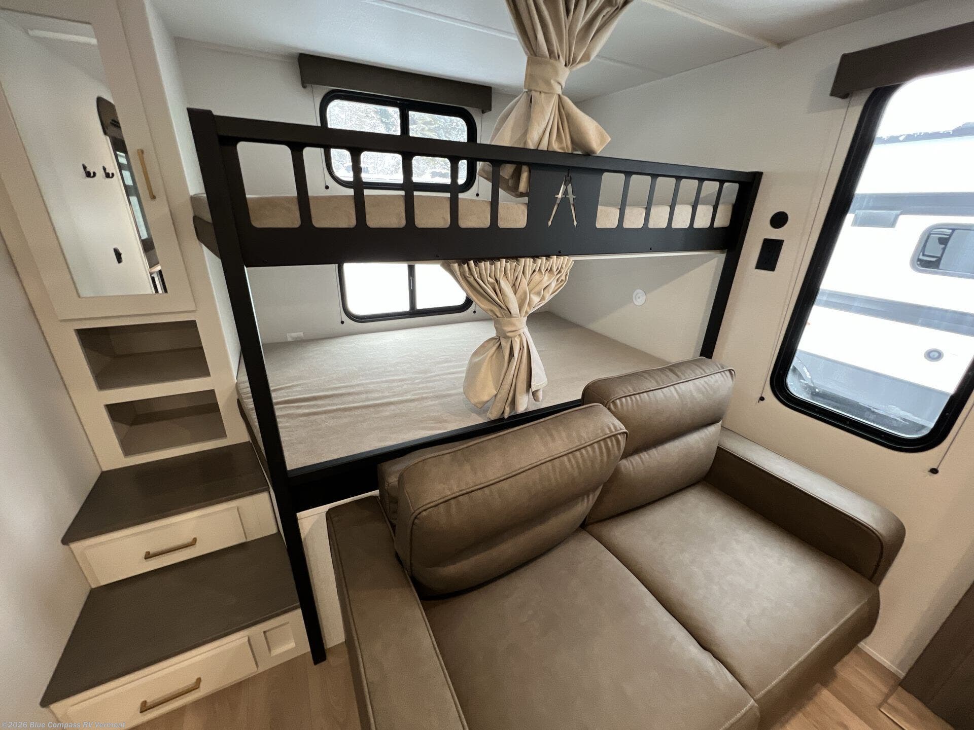 Your crew of eight will love camping in this spacious travel trailer! There are double-size bunks in the back with step storage and an added wardrobe for your guests' things plus exterior storage for camp gear galore. A walk-thru bath will create a front master bedroom you are sure to love, especially with its queen bed, wardrobe storage, and private exterior entry door! The main living area will be a favorite place to hang out with its U-shaped dinette, theater seating and 32" TV. If the weather is nice, you may just find yourselves outdoors since there is a rear exterior griddle and 1.7 cu. ft. refrigerator!