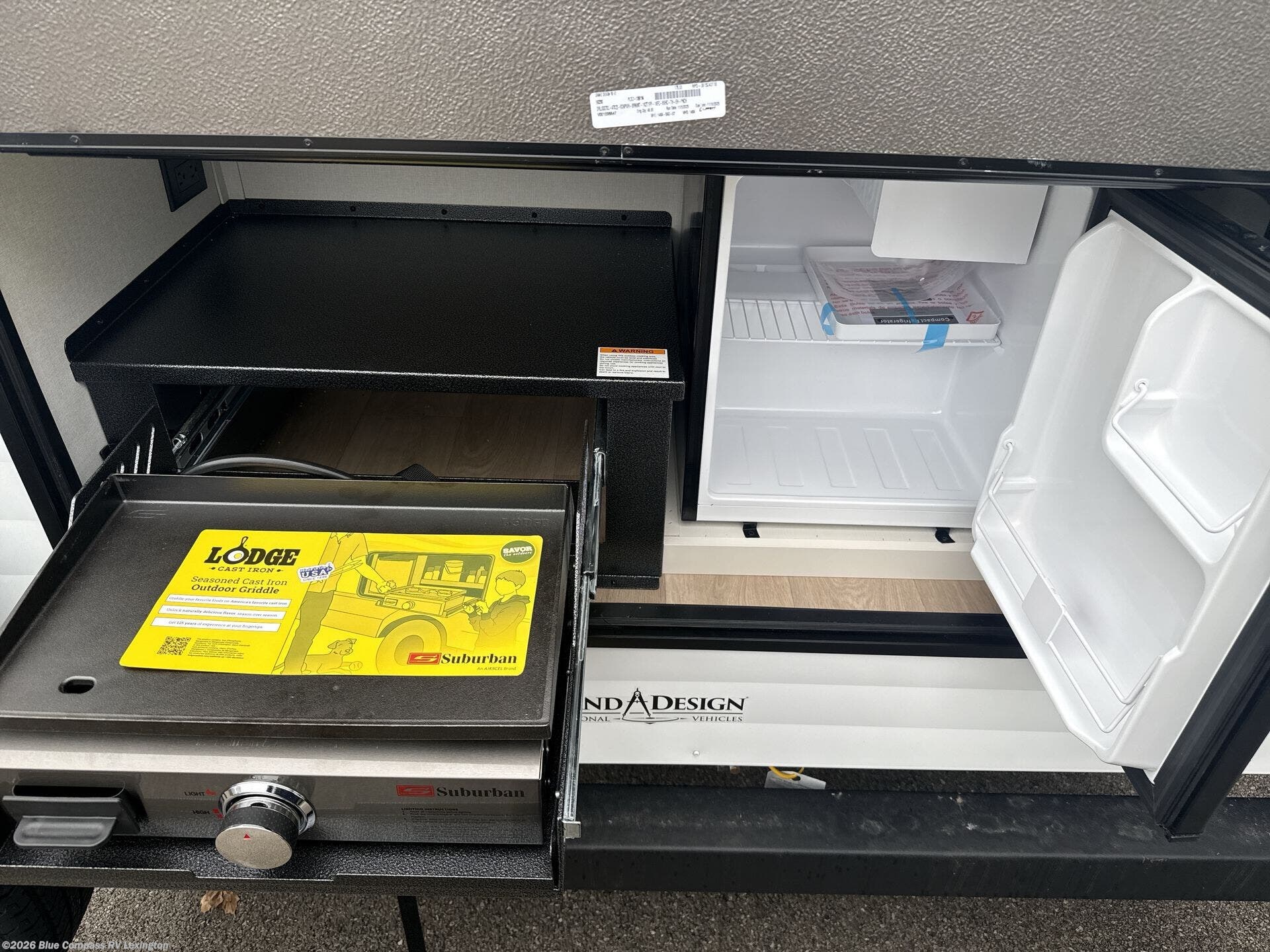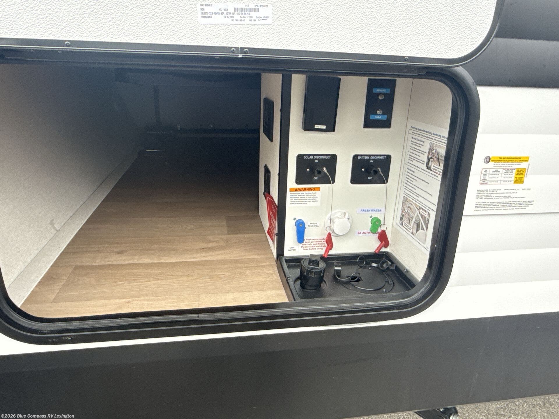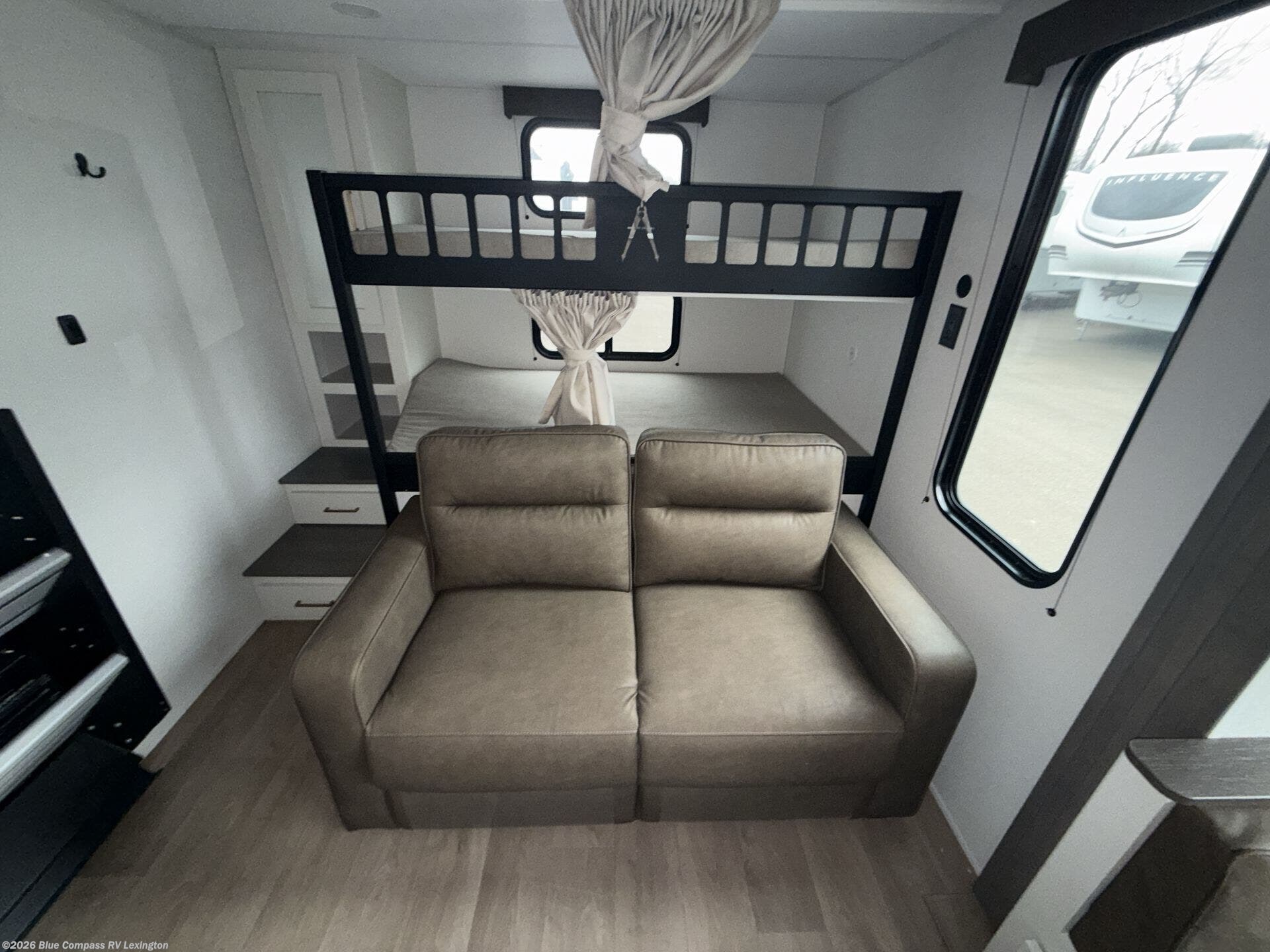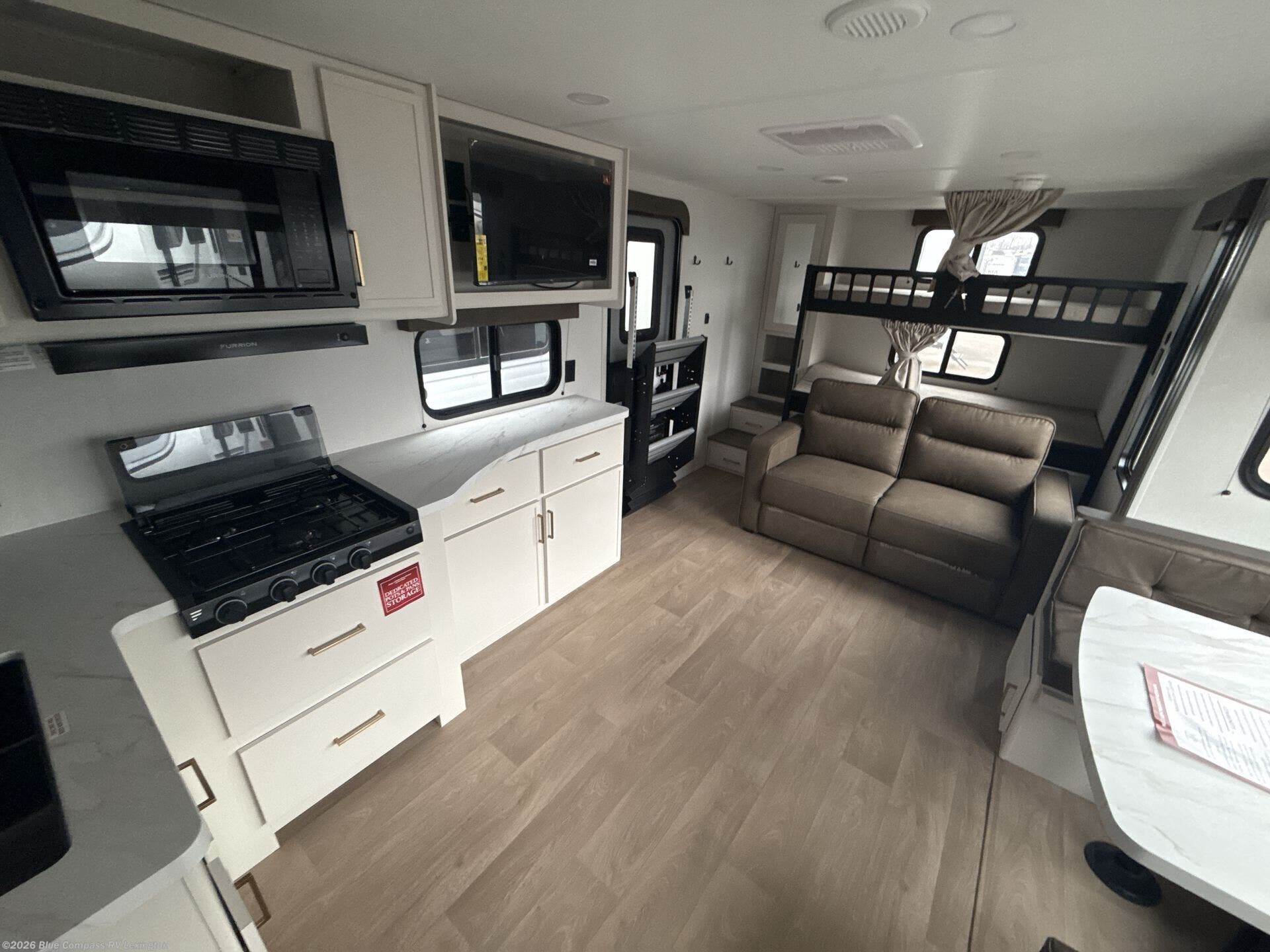 Your crew of eight will love camping in this spacious travel trailer! There are double-size bunks in the back with step storage and an added wardrobe for your guests' things plus exterior storage for camp gear galore. A walk-thru bath will create a front master bedroom you are sure to love, especially with its queen bed, wardrobe storage, and private exterior entry door! The main living area will be a favorite place to hang out with its U-shaped dinette, theater seating and 32" TV. If the weather is nice, you may just find yourselves outdoors since there is a rear exterior griddle and 1.7 cu. ft. refrigerator!