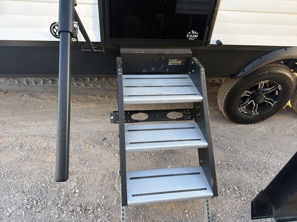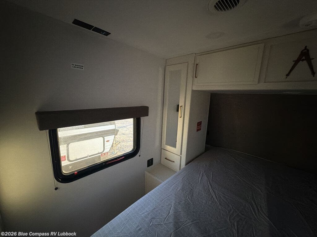Your crew of eight will love camping in this spacious travel trailer! There are double-size bunks in the back with step storage and an added wardrobe for your guests' things plus exterior storage for camp gear galore. A walk-thru bath will create a front master bedroom you are sure to love, especially with its queen bed, wardrobe storage, and private exterior entry door! The main living area will be a favorite place to hang out with its U-shaped dinette, theater seating and 32" TV. If the weather is nice, you may just find yourselves outdoors since there is a rear exterior griddle and 1.7 cu. ft. refrigerator!
