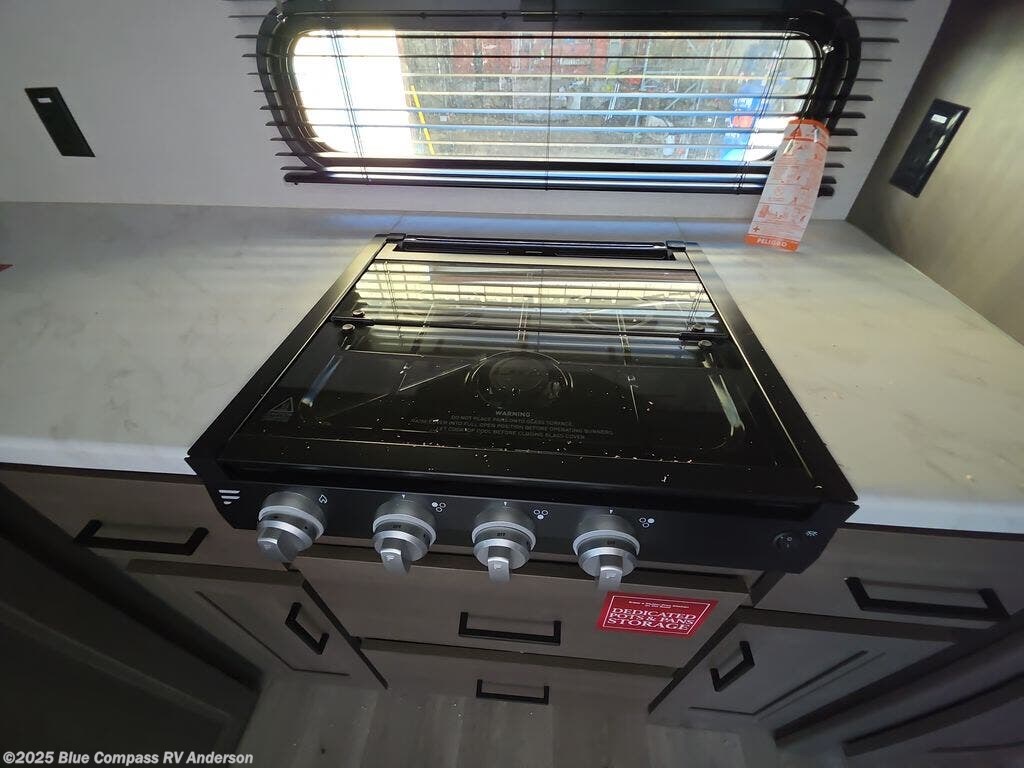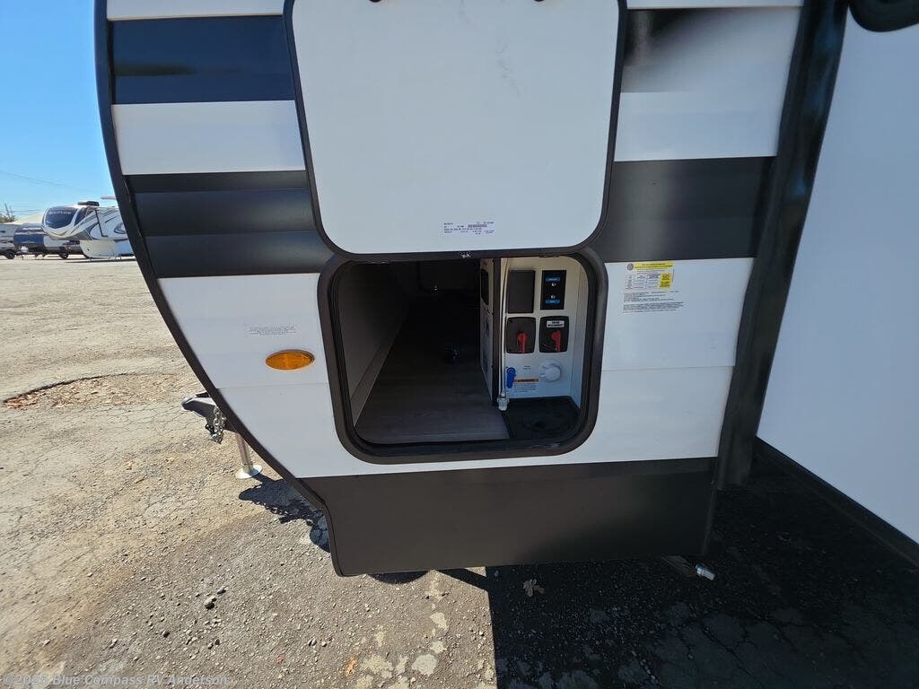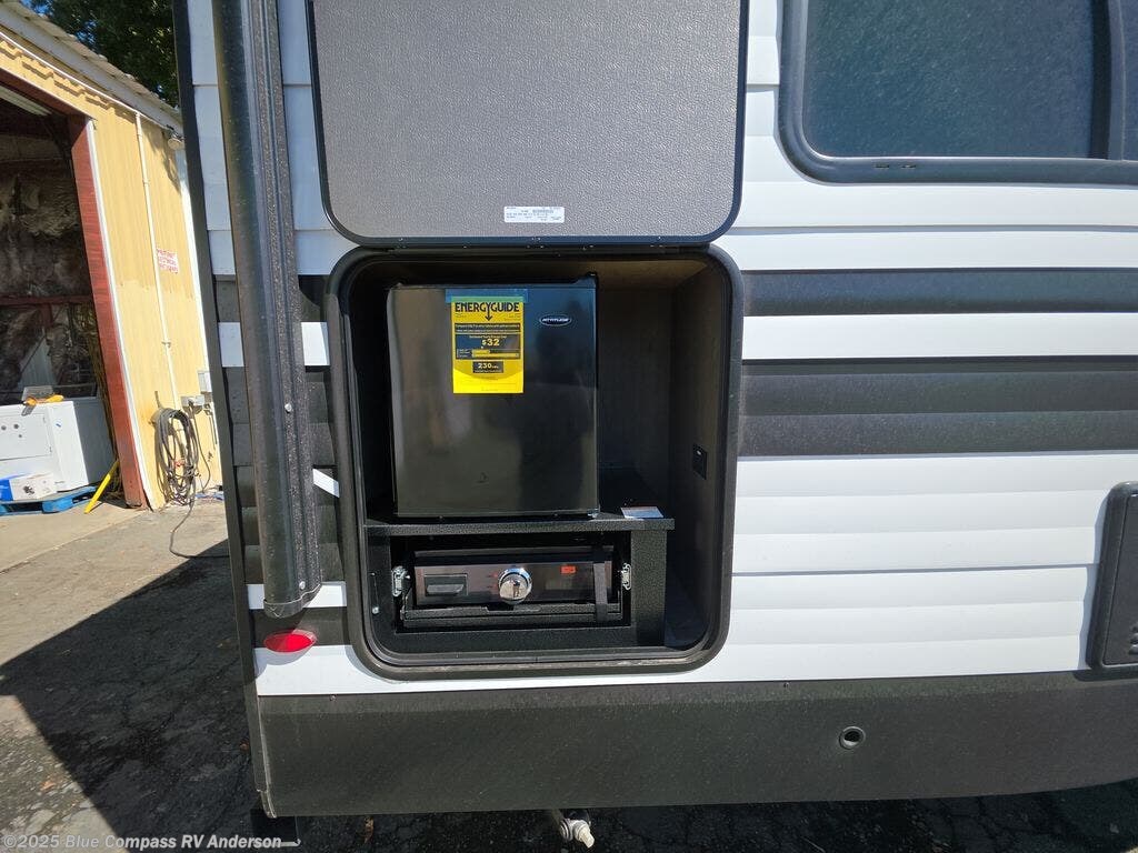 If you're looking for a cozy travel trailer for two, this is the one! You can sleep soundly each night on the king bed slide out, and you'll find plenty of storage in the front wardrobe. There is even washer and dryer prep if you choose to add those appliances. After you've freshened up in the full bath with a walk-in shower, you can head to the rear kitchen to make breakfast. There is ample counter space here, along with a three burner range and an air fryer/convection microwave, plus a pull-out trash can for easy clean up. The breakfast nook provides a fun place to dine together, and if you're needing additional sleeping space you can switch it out for the optional sleeper sofa. A theater seating slide also provides tons of comfort, especially since it's in perfect view of the 32" TV! This model also includes an exterior griddle with a 1.7 cu. ft. refrigerator, protected by the 21' power awning so you can cook in the shade!