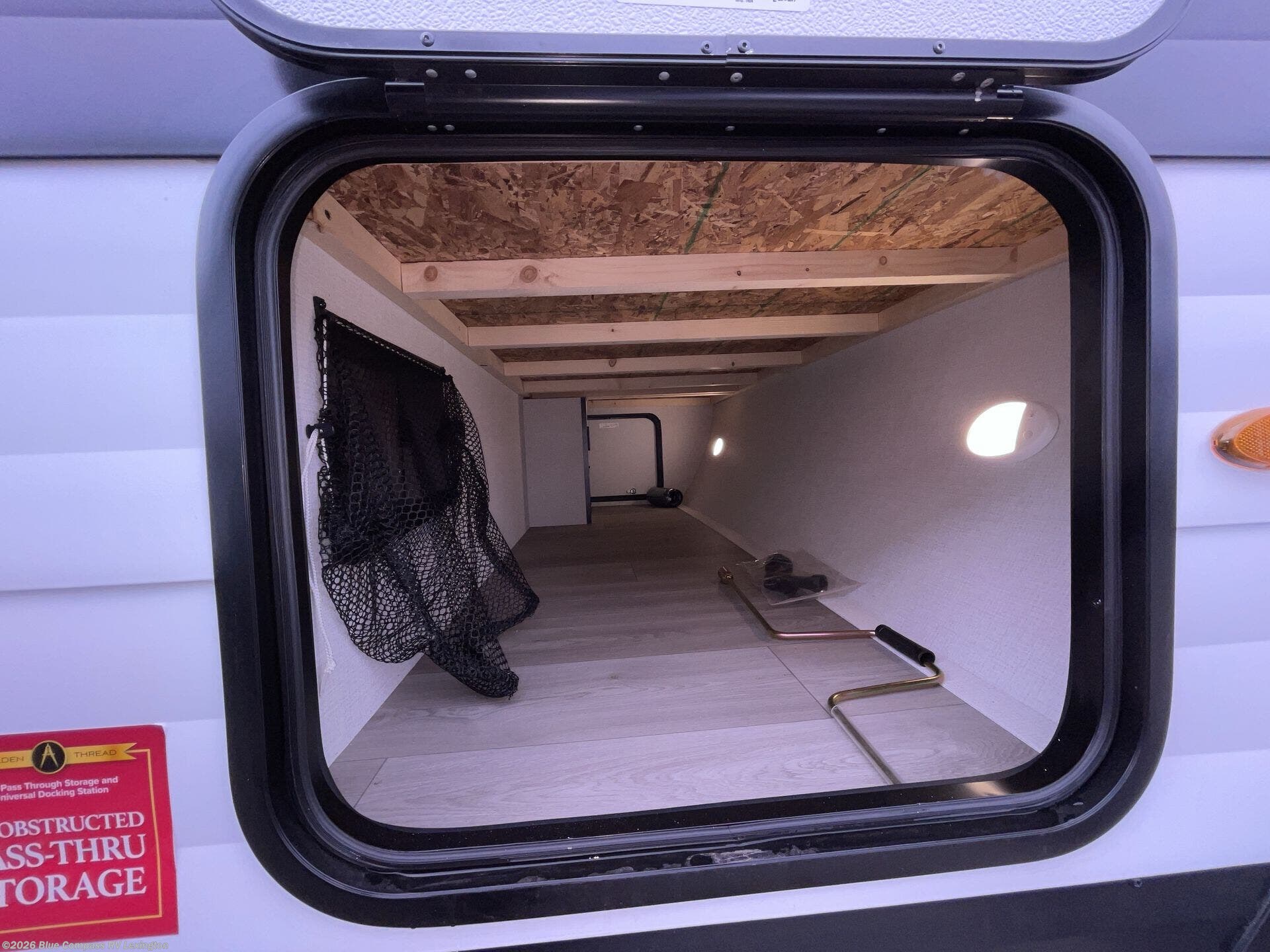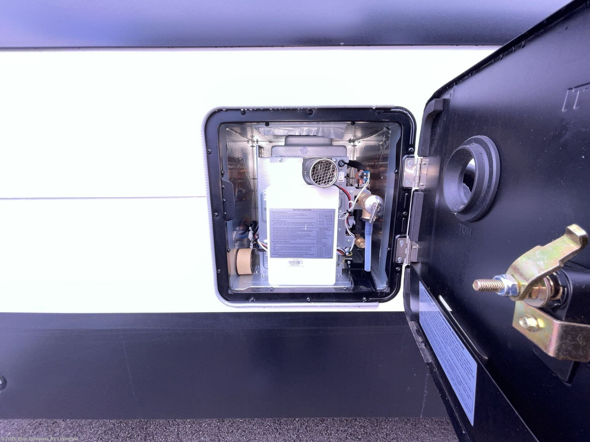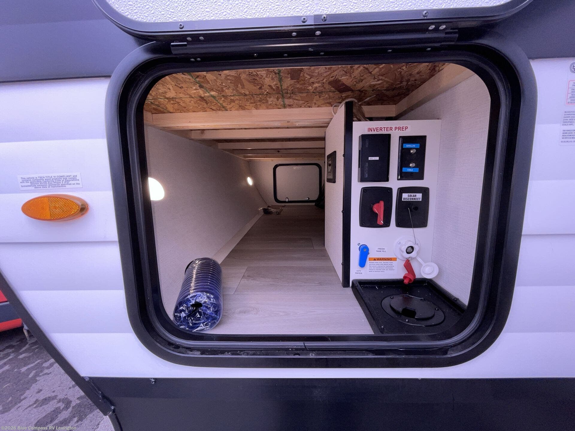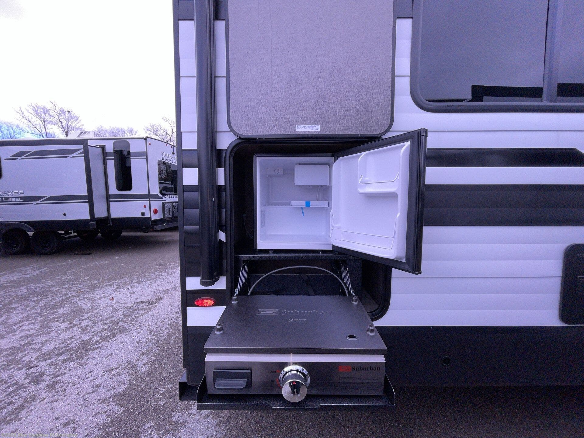 If you're looking for a cozy travel trailer for two, this is the one! You can sleep soundly each night on the king bed slide out, and you'll find plenty of storage in the front wardrobe. There is even washer and dryer prep if you choose to add those appliances. After you've freshened up in the full bath with a walk-in shower, you can head to the rear kitchen to make breakfast. There is ample counter space here, along with a three burner range and an air fryer/convection microwave, plus a pull-out trash can for easy clean up. The breakfast nook provides a fun place to dine together, and if you're needing additional sleeping space you can switch it out for the optional sleeper sofa. A theater seating slide also provides tons of comfort, especially since it's in perfect view of the 32" TV! This model also includes an exterior griddle with a 1.7 cu. ft. refrigerator, protected by the 21' power awning so you can cook in the shade!