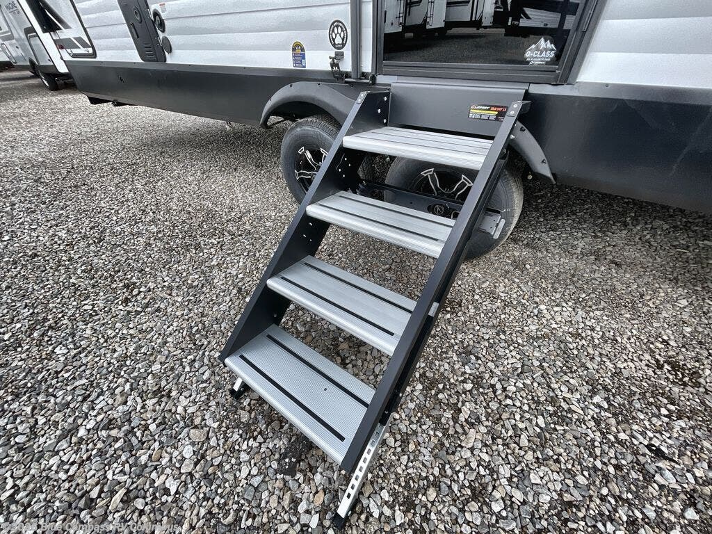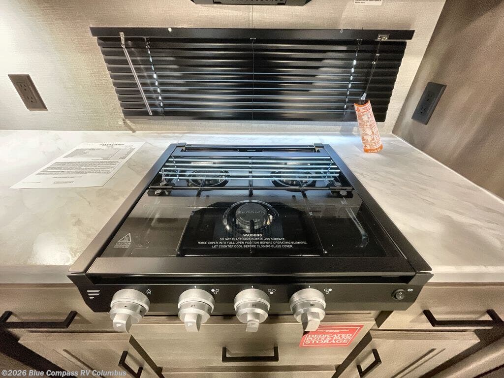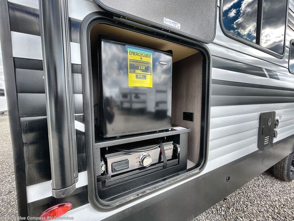 If you're looking for a cozy travel trailer for two, this is the one! You can sleep soundly each night on the king bed slide out, and you'll find plenty of storage in the front wardrobe. There is even washer and dryer prep if you choose to add those appliances. After you've freshened up in the full bath with a walk-in shower, you can head to the rear kitchen to make breakfast. There is ample counter space here, along with a three burner range and an air fryer/convection microwave, plus a pull-out trash can for easy clean up. The breakfast nook provides a fun place to dine together, and if you're needing additional sleeping space you can switch it out for the optional sleeper sofa. A theater seating slide also provides tons of comfort, especially since it's in perfect view of the 32" TV! This model also includes an exterior griddle with a 1.7 cu. ft. refrigerator, protected by the 21' power awning so you can cook in the shade!