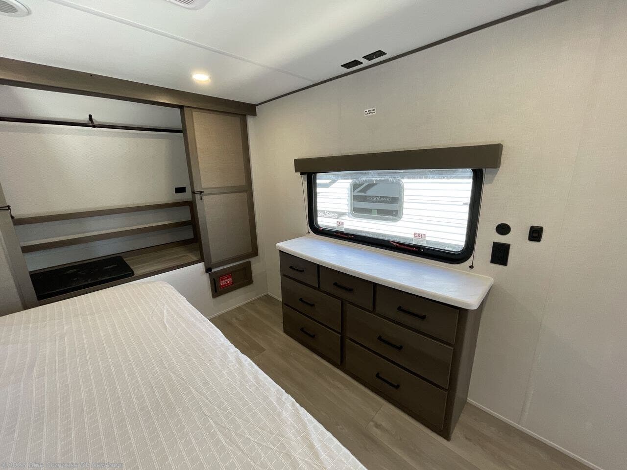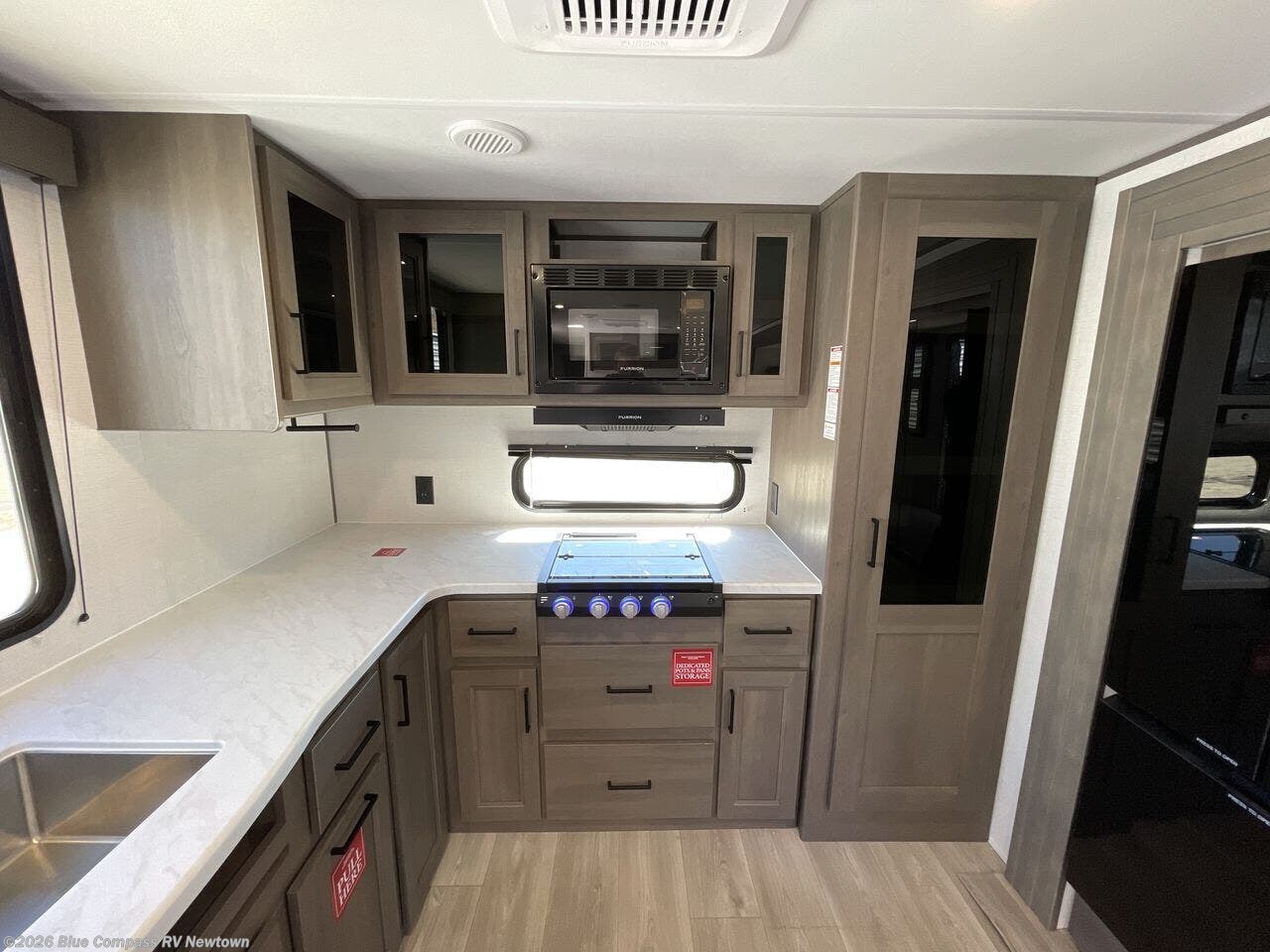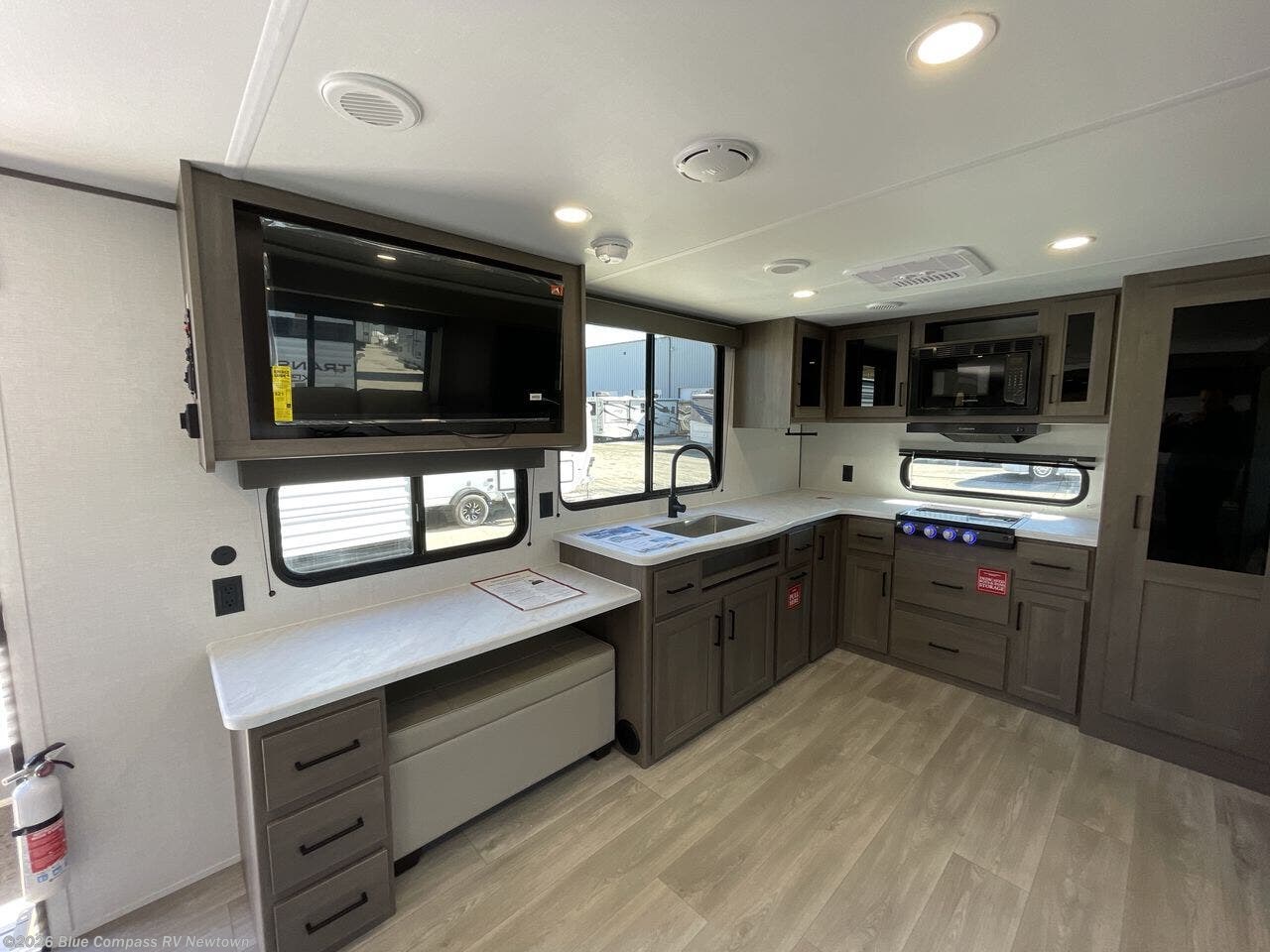 If you're looking for a cozy travel trailer for two, this is the one! You can sleep soundly each night on the king bed slide out, and you'll find plenty of storage in the front wardrobe. There is even washer and dryer prep if you choose to add those appliances. After you've freshened up in the full bath with a walk-in shower, you can head to the rear kitchen to make breakfast. There is ample counter space here, along with a three burner range and an air fryer/convection microwave, plus a pull-out trash can for easy clean up. The breakfast nook provides a fun place to dine together, and if you're needing additional sleeping space you can switch it out for the optional sleeper sofa. A theater seating slide also provides tons of comfort, especially since it's in perfect view of the 32" TV! This model also includes an exterior griddle with a 1.7 cu. ft. refrigerator, protected by the 21' power awning so you can cook in the shade!