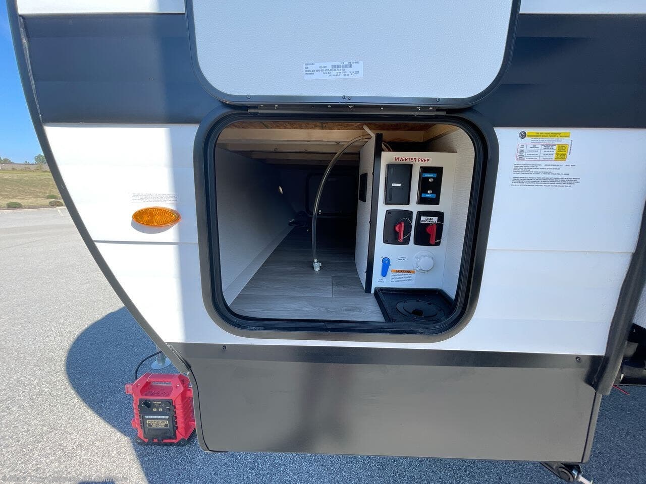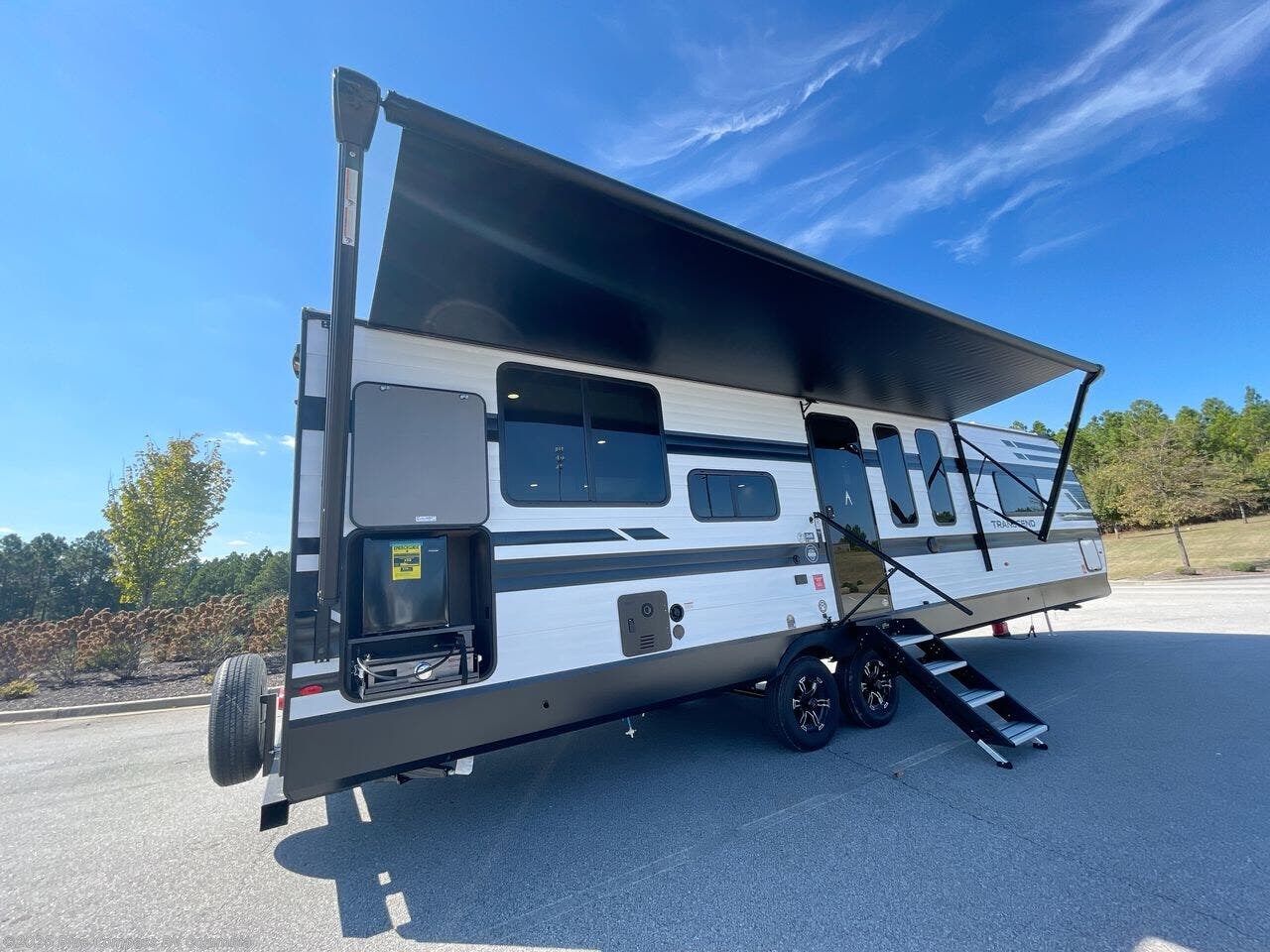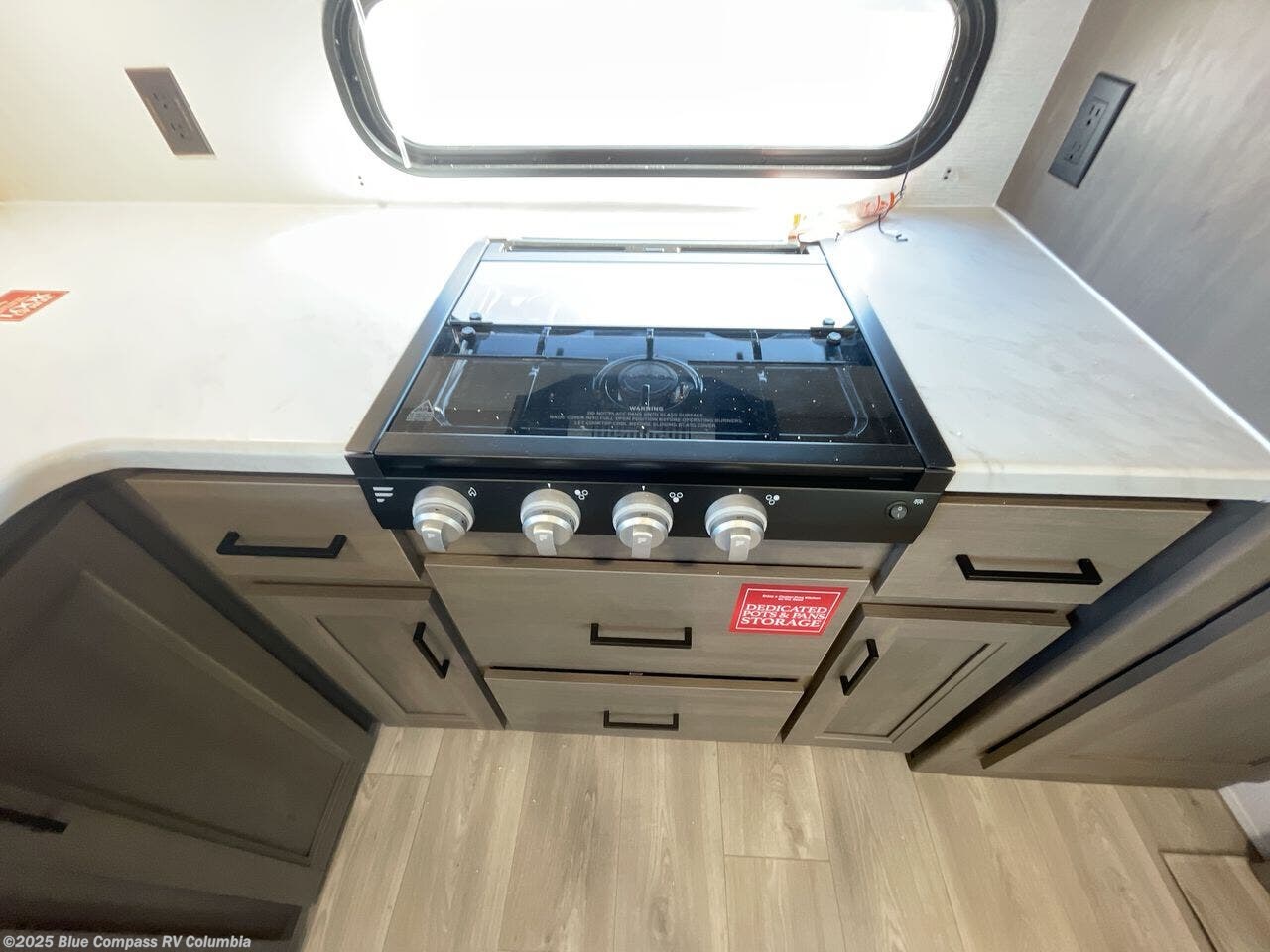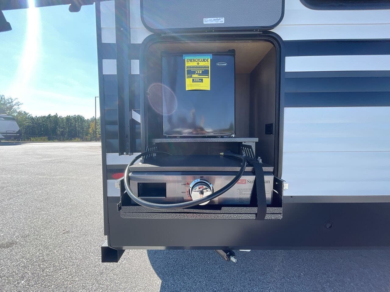 If you're looking for a cozy travel trailer for two, this is the one! You can sleep soundly each night on the king bed slide out, and you'll find plenty of storage in the front wardrobe. There is even washer and dryer prep if you choose to add those appliances. After you've freshened up in the full bath with a walk-in shower, you can head to the rear kitchen to make breakfast. There is ample counter space here, along with a three burner range and an air fryer/convection microwave, plus a pull-out trash can for easy clean up. The breakfast nook provides a fun place to dine together, and if you're needing additional sleeping space you can switch it out for the optional sleeper sofa. A theater seating slide also provides tons of comfort, especially since it's in perfect view of the 32" TV! This model also includes an exterior griddle with a 1.7 cu. ft. refrigerator, protected by the 21' power awning so you can cook in the shade!