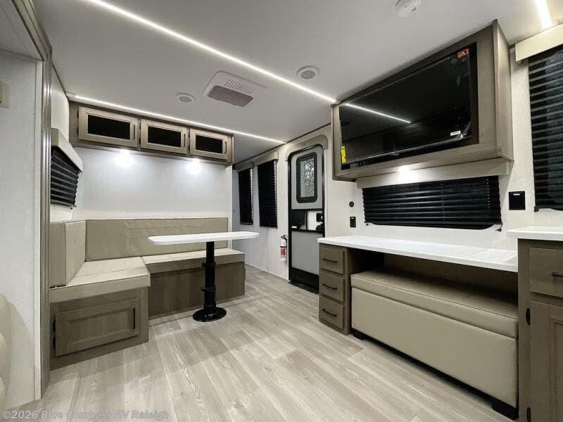If you're looking for a cozy travel trailer for two, this is the one! You can sleep soundly each night on the king bed slide out, and you'll find plenty of storage in the front wardrobe. There is even washer and dryer prep if you choose to add those appliances. After you've freshened up in the full bath with a walk-in shower, you can head to the rear kitchen to make breakfast. There is ample counter space here, along with a three burner range and an air fryer/convection microwave, plus a pull-out trash can for easy clean up. The breakfast nook provides a fun place to dine together, and if you're needing additional sleeping space you can switch it out for the optional sleeper sofa. A theater seating slide also provides tons of comfort, especially since it's in perfect view of the 32" TV! This model also includes an exterior griddle with a 1.7 cu. ft. refrigerator, protected by the 21' power awning so you can cook in the shade!