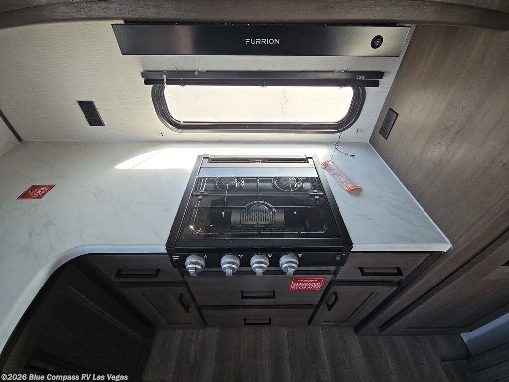 If you're looking for a cozy travel trailer for two, this is the one! You can sleep soundly each night on the king bed slide out, and you'll find plenty of storage in the front wardrobe. There is even washer and dryer prep if you choose to add those appliances. After you've freshened up in the full bath with a walk-in shower, you can head to the rear kitchen to make breakfast. There is ample counter space here, along with a three burner range and an air fryer/convection microwave, plus a pull-out trash can for easy clean up. The breakfast nook provides a fun place to dine together, and if you're needing additional sleeping space you can switch it out for the optional sleeper sofa. A theater seating slide also provides tons of comfort, especially since it's in perfect view of the 32" TV! This model also includes an exterior griddle with a 1.7 cu. ft. refrigerator, protected by the 21' power awning so you can cook in the shade!