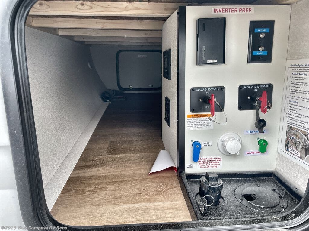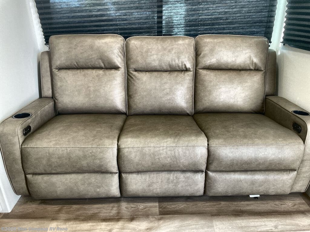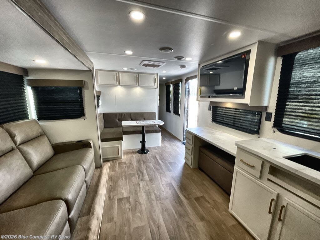 If you're looking for a cozy travel trailer for two, this is the one! You can sleep soundly each night on the king bed slide out, and you'll find plenty of storage in the front wardrobe. There is even washer and dryer prep if you choose to add those appliances. After you've freshened up in the full bath with a walk-in shower, you can head to the rear kitchen to make breakfast. There is ample counter space here, along with a three burner range and an air fryer/convection microwave, plus a pull-out trash can for easy clean up. The breakfast nook provides a fun place to dine together, and if you're needing additional sleeping space you can switch it out for the optional sleeper sofa. A theater seating slide also provides tons of comfort, especially since it's in perfect view of the 32" TV! This model also includes an exterior griddle with a 1.7 cu. ft. refrigerator, protected by the 21' power awning so you can cook in the shade!
