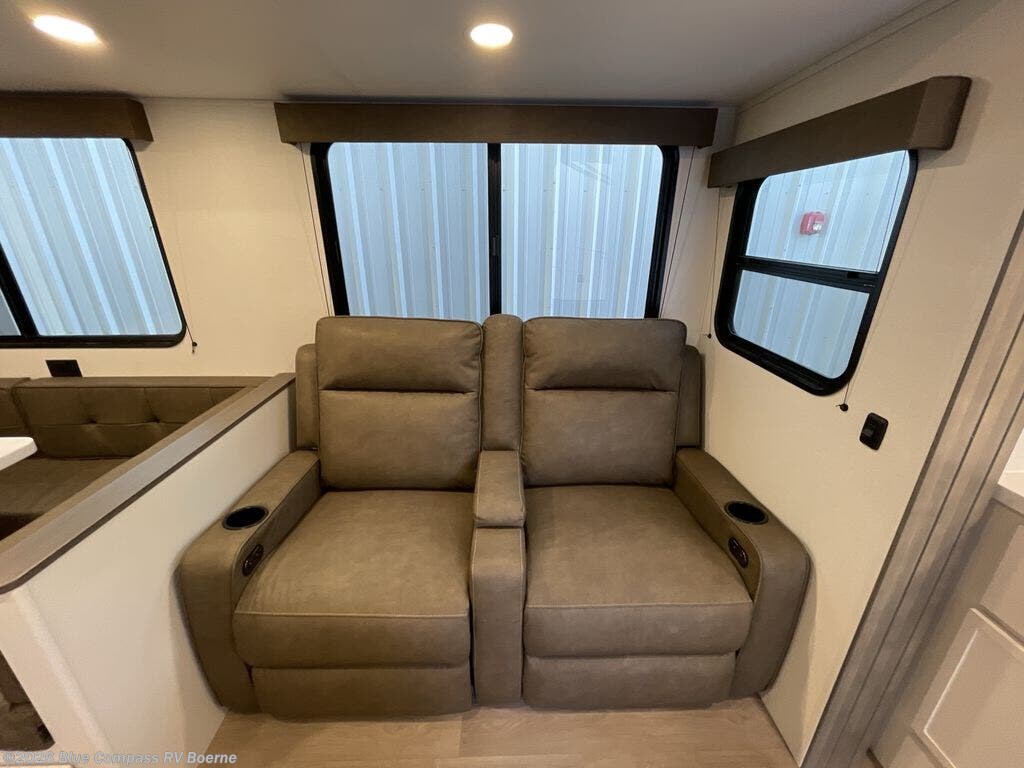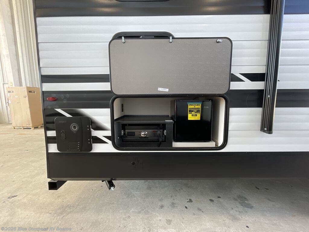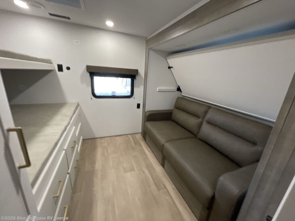 If you're looking for a travel trailer that can house your whole gang, this unit is the one! The rear private bunkhouse can sleep up to five since there is a sleeper sofa and three bunks, plus there are storage drawers for your guests' things. A front private bedroom will be perfect for the owners with a queen bed slide out and spacious front closet with washer and dryer prep! Whether you cook outside on the exterior griddle or inside on the three burner range, you'll be able to make your best meals. There is also a 12V French door refrigerator with a glass front and bottom freezer and a convection microwave/combo air fryer to enjoy some crispy fries! A U-shaped dinette and 60" sleeper sofa within the living room slide provides even more seating and sleeping space, or you can choose the optional theater seating!