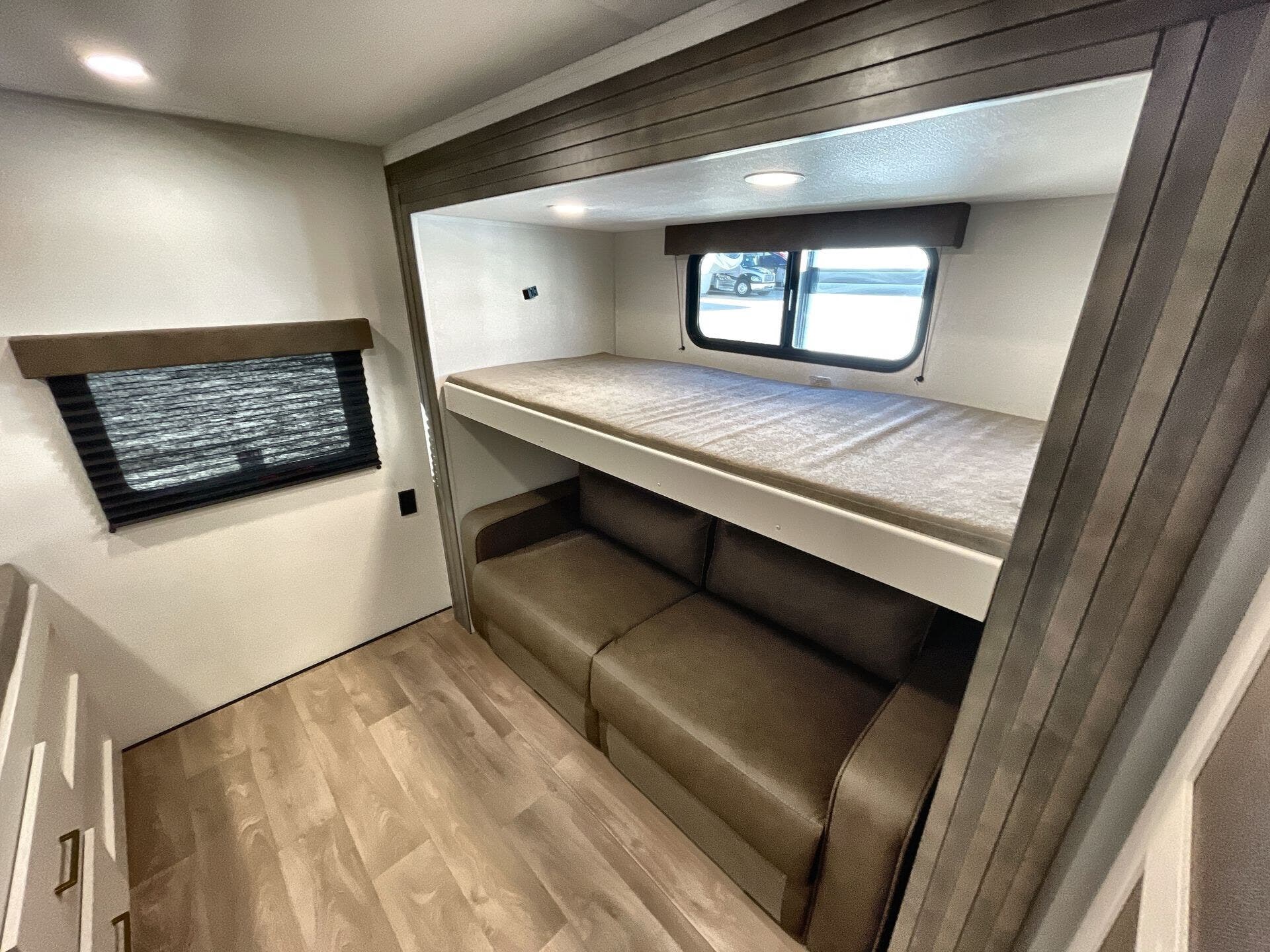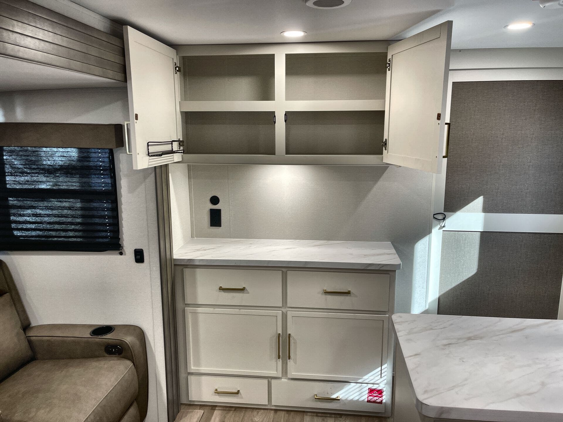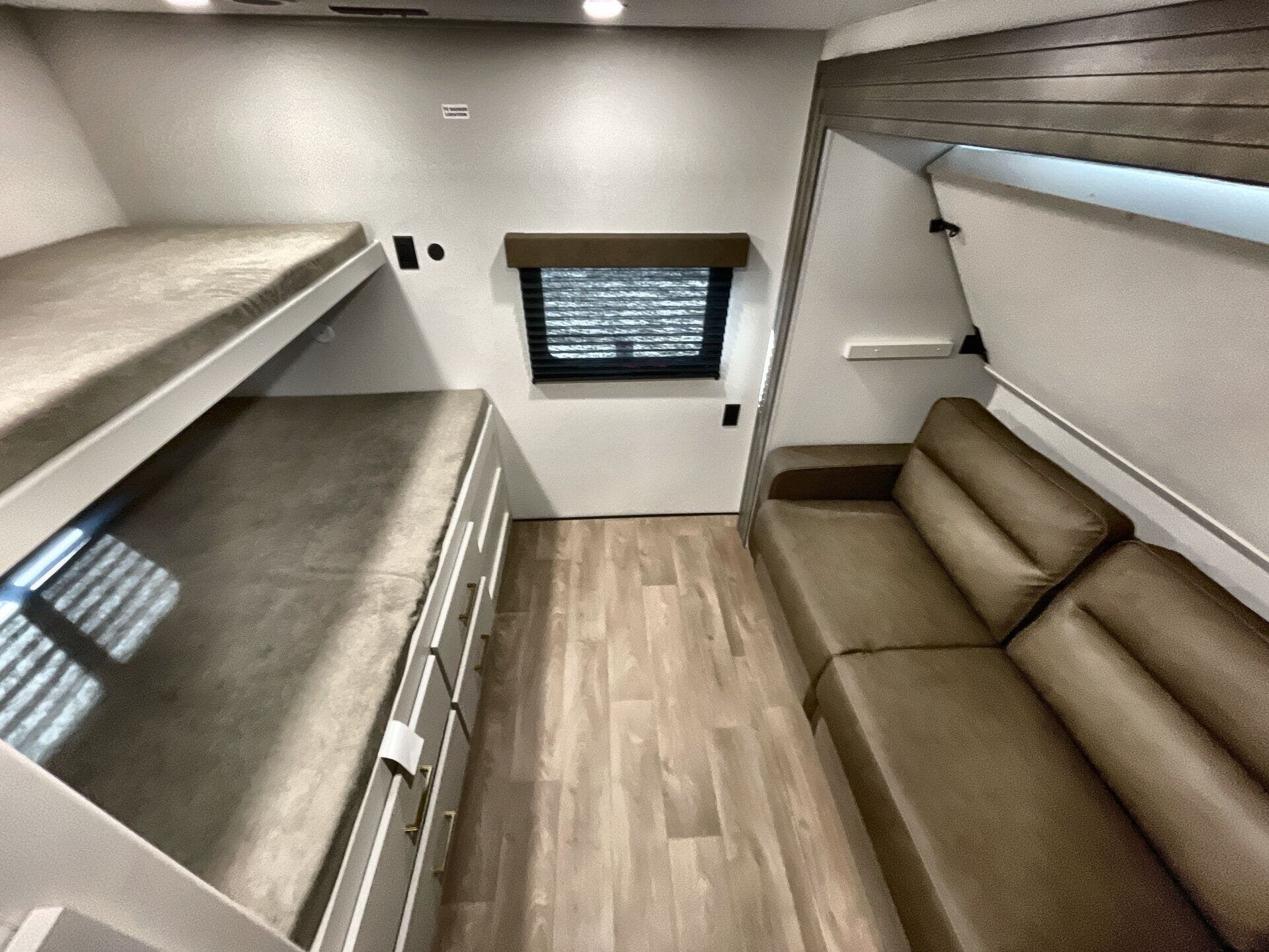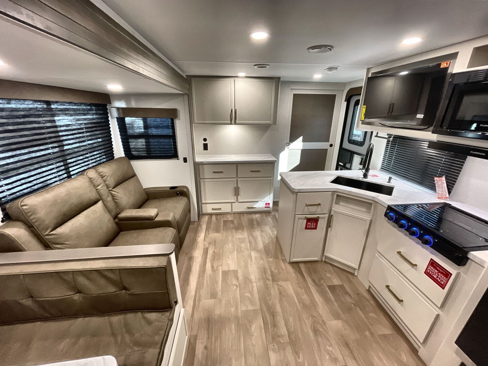 The Transcend 335BHT excels in delivering a roomy, family-friendly interior across three slideouts. The floorplan centers on a welcoming living area with dedicated sleeping spaces, including a queen bed and multiple seating options that convert to sleeping areas. A well-equipped kitchen, compact yet functional, makes meal prep a breeze, whether you’re parked at a campground or exploring off the beaten path. With one air conditioner and efficient storage, this RV maintains comfort across seasons while preserving valuable living space for gatherings and downtime.
