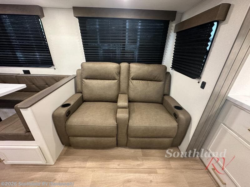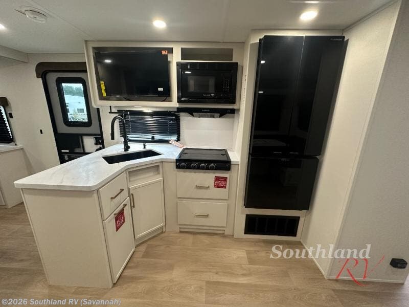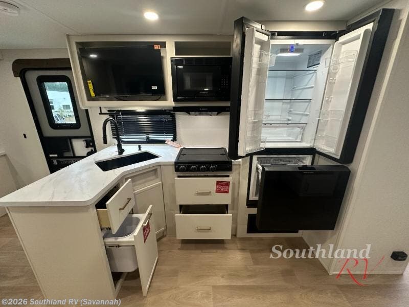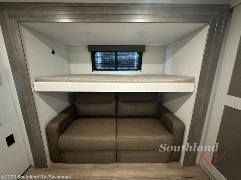 If you're looking for a travel trailer that can house your whole gang, this unit is the one! The rear private bunkhouse can sleep up to five since there is a sleeper sofa and three bunks, plus there are storage drawers for your guests' things. A front private bedroom will be perfect for the owners with a queen bed slide out and spacious front closet with washer and dryer prep! Whether you cook outside on the exterior griddle or inside on the three burner range, you'll be able to make your best meals. There is also a 12V French door refrigerator with a glass front and bottom freezer and a convection microwave/combo air fryer to enjoy some crispy fries! A U-shaped dinette and 60" sleeper sofa within the living room slide provides even more seating and sleeping space, or you can choose the optional theater seating!