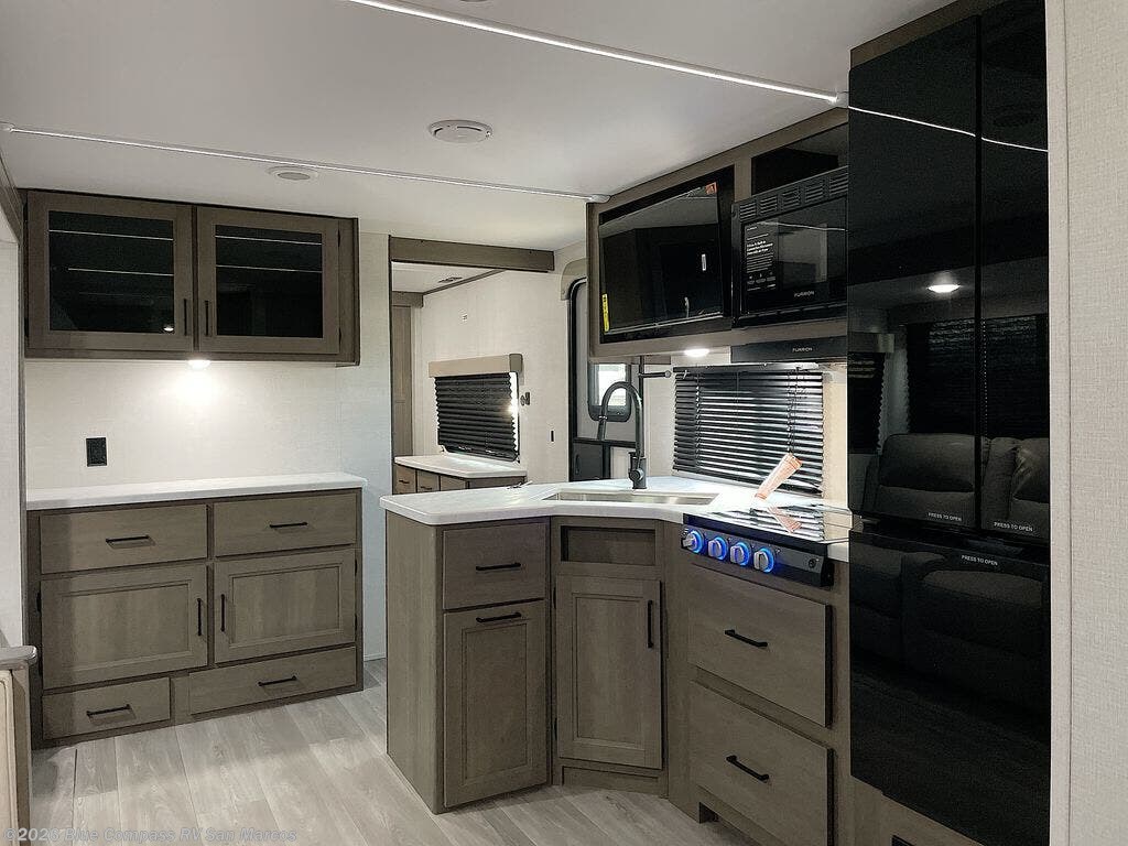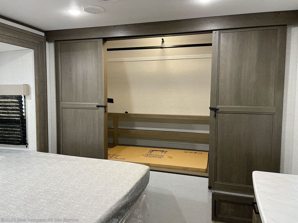 If you're looking for a travel trailer that can house your whole gang, this unit is the one! The rear private bunkhouse can sleep up to five since there is a sleeper sofa and three bunks, plus there are storage drawers for your guests' things. A front private bedroom will be perfect for the owners with a queen bed slide out and spacious front closet with washer and dryer prep! Whether you cook outside on the exterior griddle or inside on the three burner range, you'll be able to make your best meals. There is also a 12V French door refrigerator with a glass front and bottom freezer and a convection microwave/combo air fryer to enjoy some crispy fries! A U-shaped dinette and 60" sleeper sofa within the living room slide provides even more seating and sleeping space, or you can choose the optional theater seating!