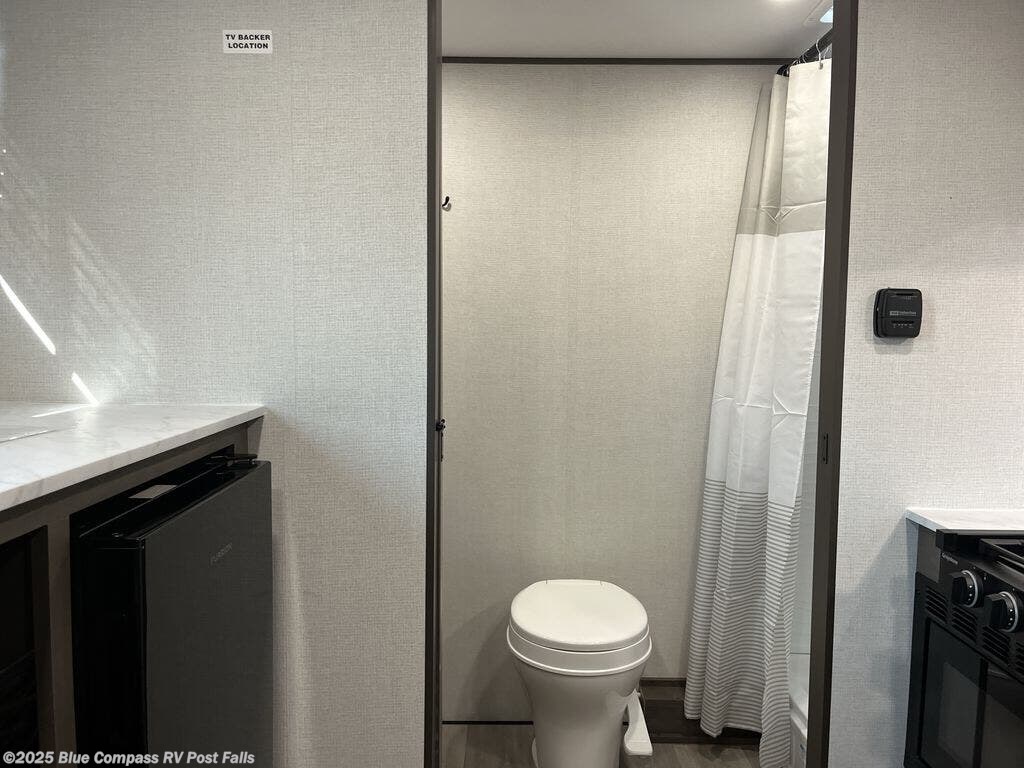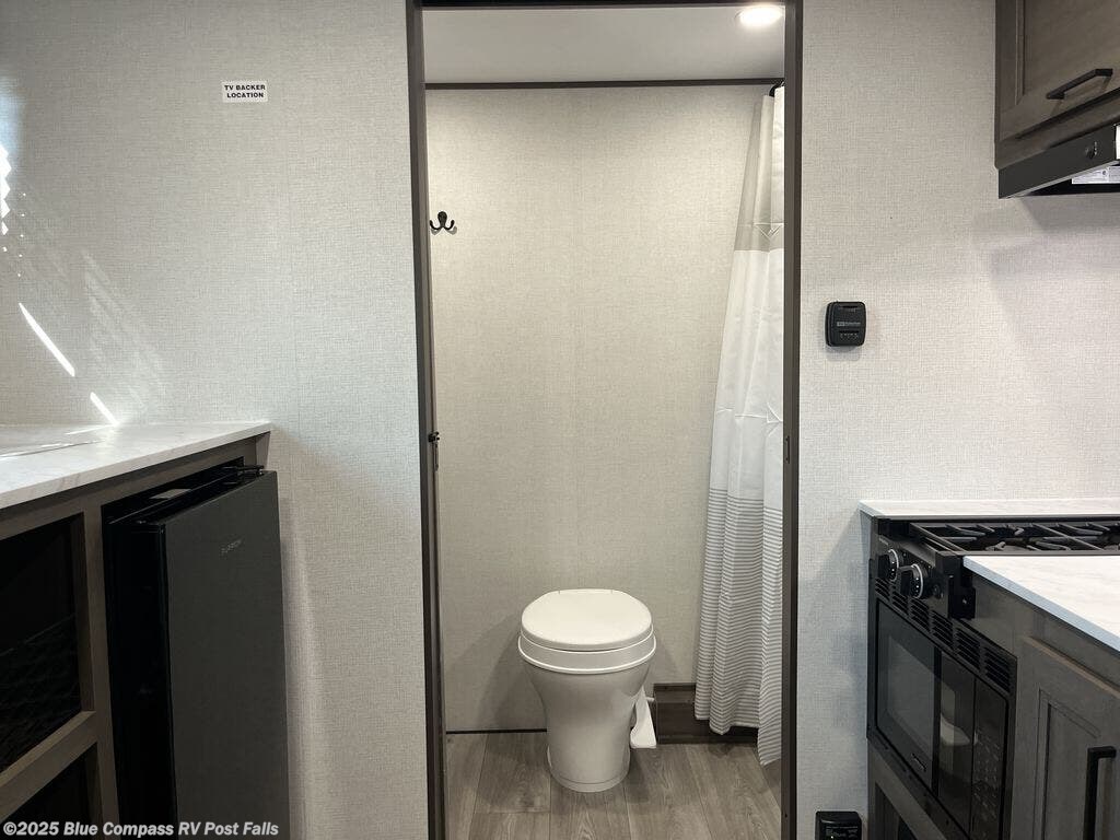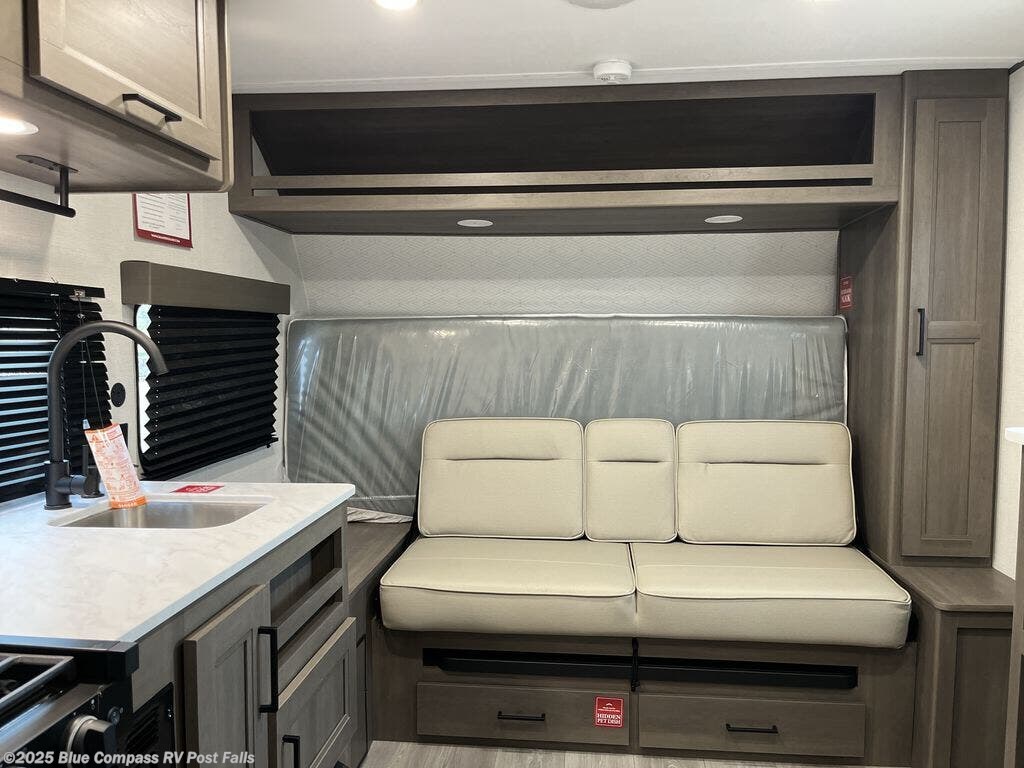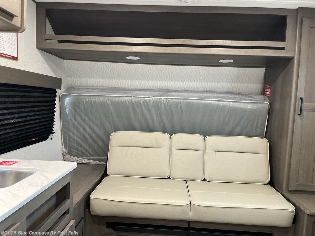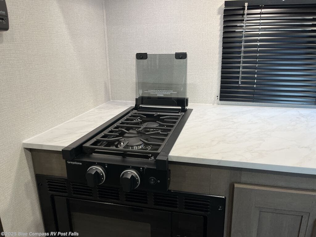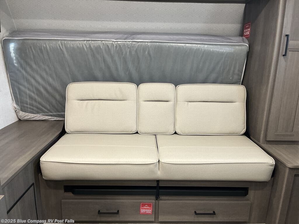Travel in this 131DL model and step inside through the sturdy aluminum entry steps and you'll be greeted by a versatile 60" x 80" Murphy bed that doubles as a comfortable seating area during the day—perfect for relaxing with your furry companion, thanks to the included pet dish. In the center, the kitchen offers all the essentials for preparing a delicious meal, featuring a microwave, 2-burner range, 3.3 cu. ft. refrigerator, and overhead cabinets for added storage. At the rear, enjoy the convenience of a full bathroom complete with a walk-in shower and foot-flush toilet, making life on the road both comfortable and functional.