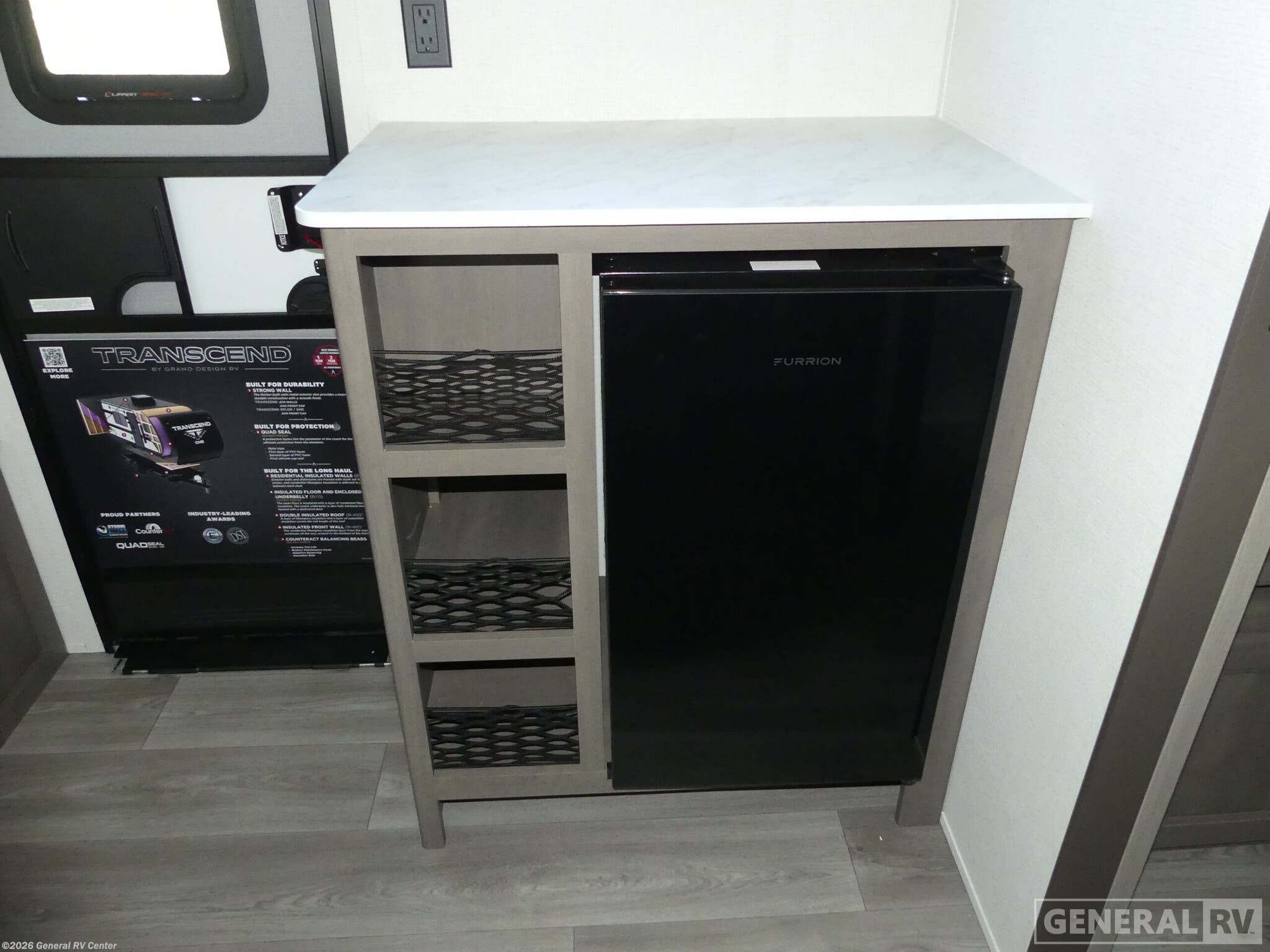 Grand Design Transcend One travel trailer 131DL highlights: Rear Bathroom Interior/Exterior Table Pass Through Storage Foot Flush Toilet Travel in this 131DL model and step inside through the sturdy aluminum entry steps and you'll be greeted by a versatile 60" x 80" Murphy bed that doubles as a comfortable seating area during the day—perfect for relaxing with your furry companion, thanks to the included pet dish. In the center, the kitchen offers all the essentials for preparing a delicious meal, featuring a microwave, 2-burner range, 3.3 cu. ft. refrigerator, and overhead cabinets for added storage. At the rear, enjoy the convenience of a full bathroom complete with a walk-in shower and foot-flush toilet, making life on the road both comfortable and functional. With any Transcend One travel trailer by Grand Design, you will enjoy lightweight towing thanks to their single-axle. There are many interior comforts to make camping easier than ever, such as recessed lighting, residential countertops, and a 6' 6" interior height. Each model is constructed with a heated and enclosed underbelly with suspended tanks, a moisture barrier floor enclosure, and Thermofoil over the roof and front cap for added protection. And a JBL sound system will let you listen to tunes as you visit under the power awning with a Fusion light!