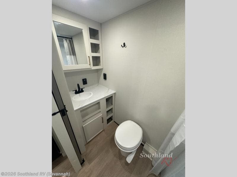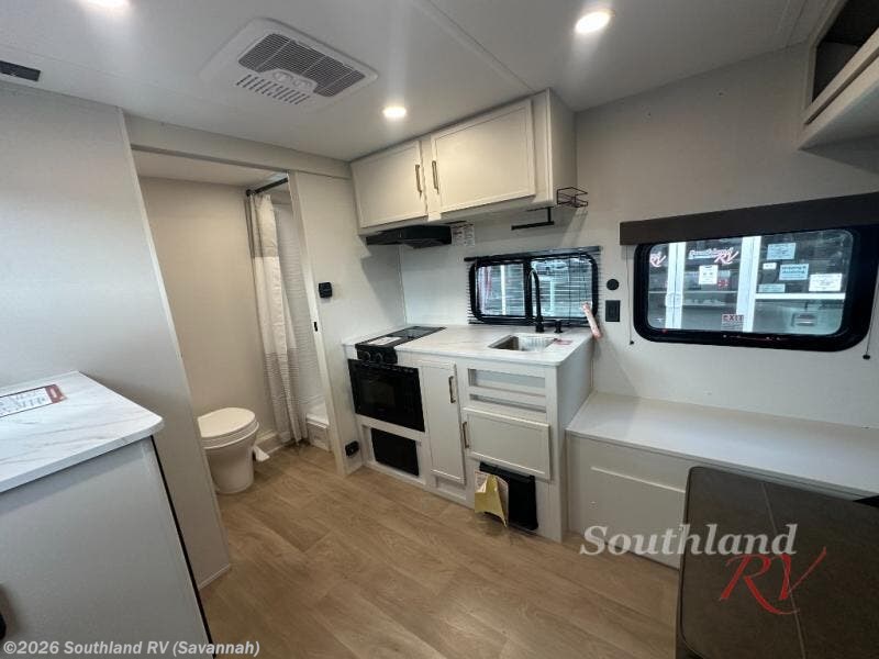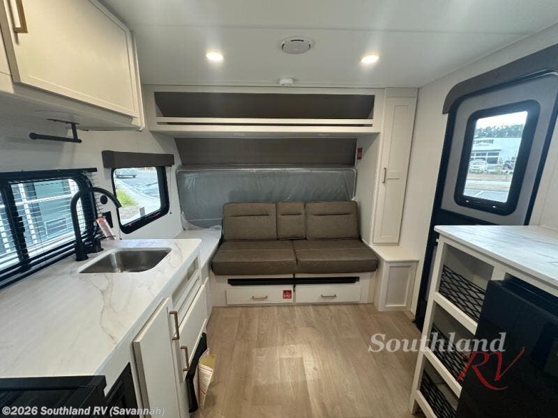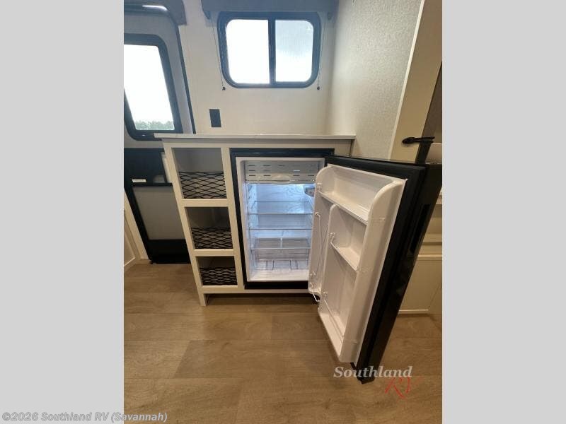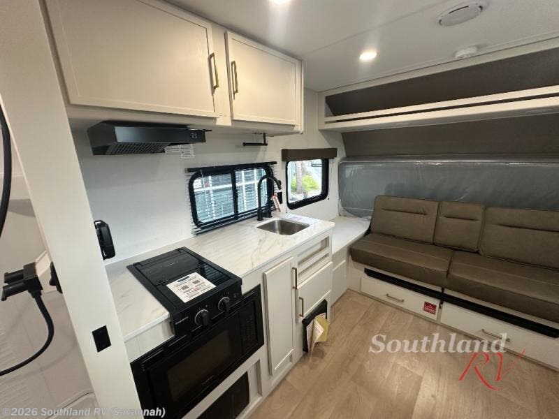 Travel in this 131DL model and step inside through the sturdy aluminum entry steps and you'll be greeted by a versatile 60" x 80" Murphy bed that doubles as a comfortable seating area during the day—perfect for relaxing with your furry companion, thanks to the included pet dish. In the center, the kitchen offers all the essentials for preparing a delicious meal, featuring a microwave, 2-burner range, 3.3 cu. ft. refrigerator, and overhead cabinets for added storage. At the rear, enjoy the convenience of a full bathroom complete with a walk-in shower and foot-flush toilet, making life on the road both comfortable and functional.