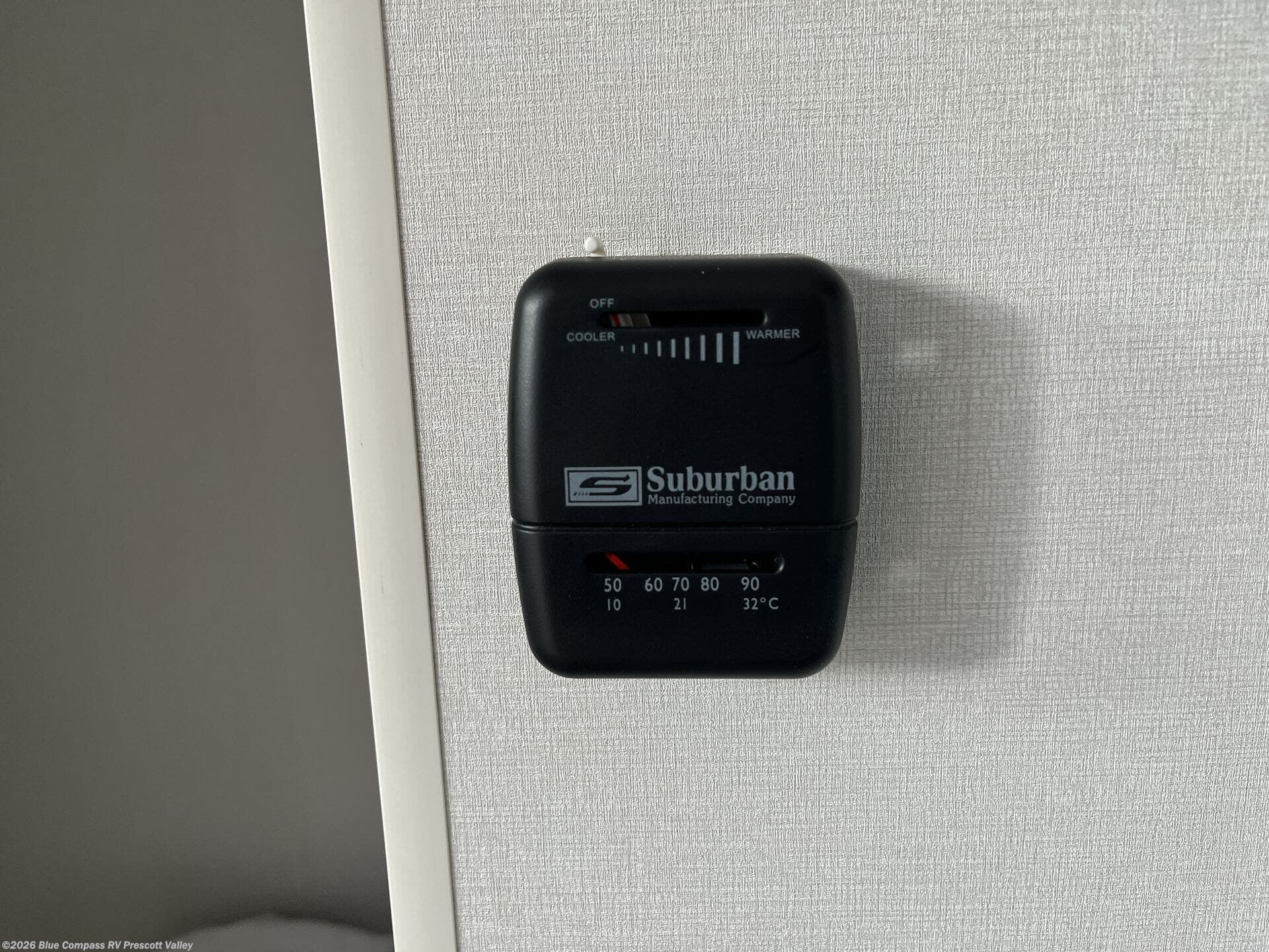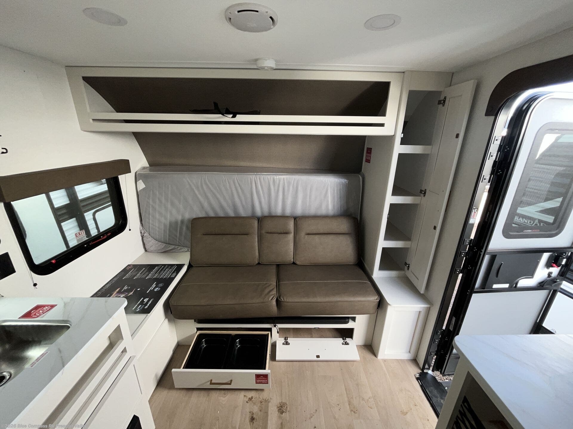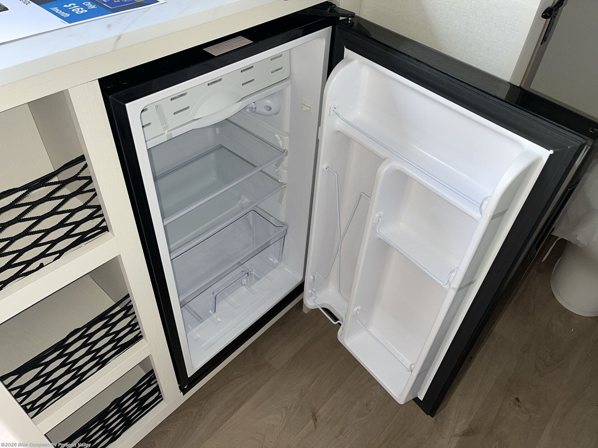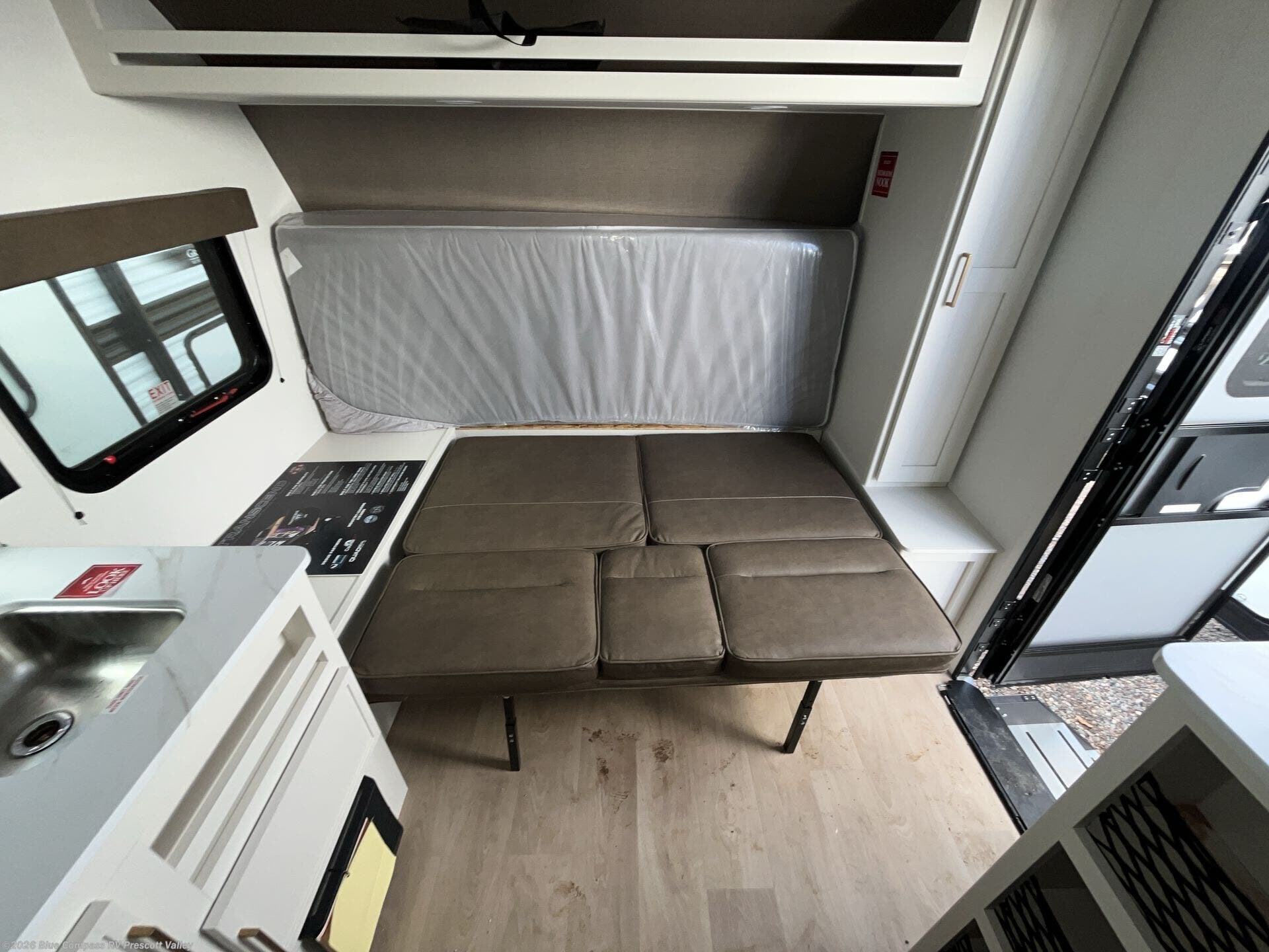 Travel in this 131DL model and step inside through the sturdy aluminum entry steps and you'll be greeted by a versatile 60" x 80" Murphy bed that doubles as a comfortable seating area during the day—perfect for relaxing with your furry companion, thanks to the included pet dish. In the center, the kitchen offers all the essentials for preparing a delicious meal, featuring a microwave, 2-burner range, 3.3 cu. ft. refrigerator, and overhead cabinets for added storage. At the rear, enjoy the convenience of a full bathroom complete with a walk-in shower and foot-flush toilet, making life on the road both comfortable and functional.