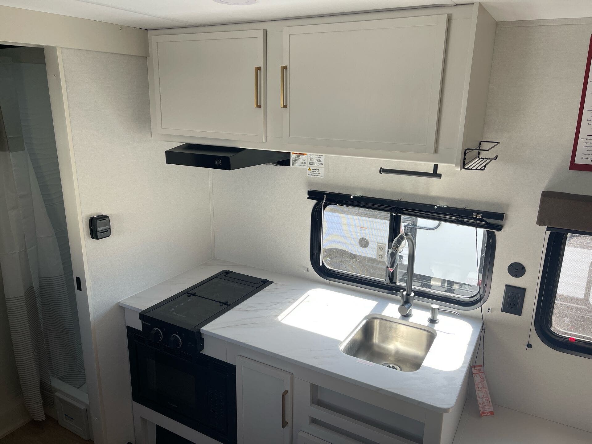 This travel trailer is designed to maximize comfort in a compact package. It accommodates two sleepers with a dedicated Queen bed, ensuring restful nights after adventures. Two air conditioners—one 8,000 BTU unit and a 13,500 BTU roof unit—keep the interior cool during hot days, while efficient insulation helps retain warmth when the weather turns chilly. The setup supports relaxing movie nights with an onboard TV and accessible satellite or antenna signals, making it easy to unwind after a day on the road.